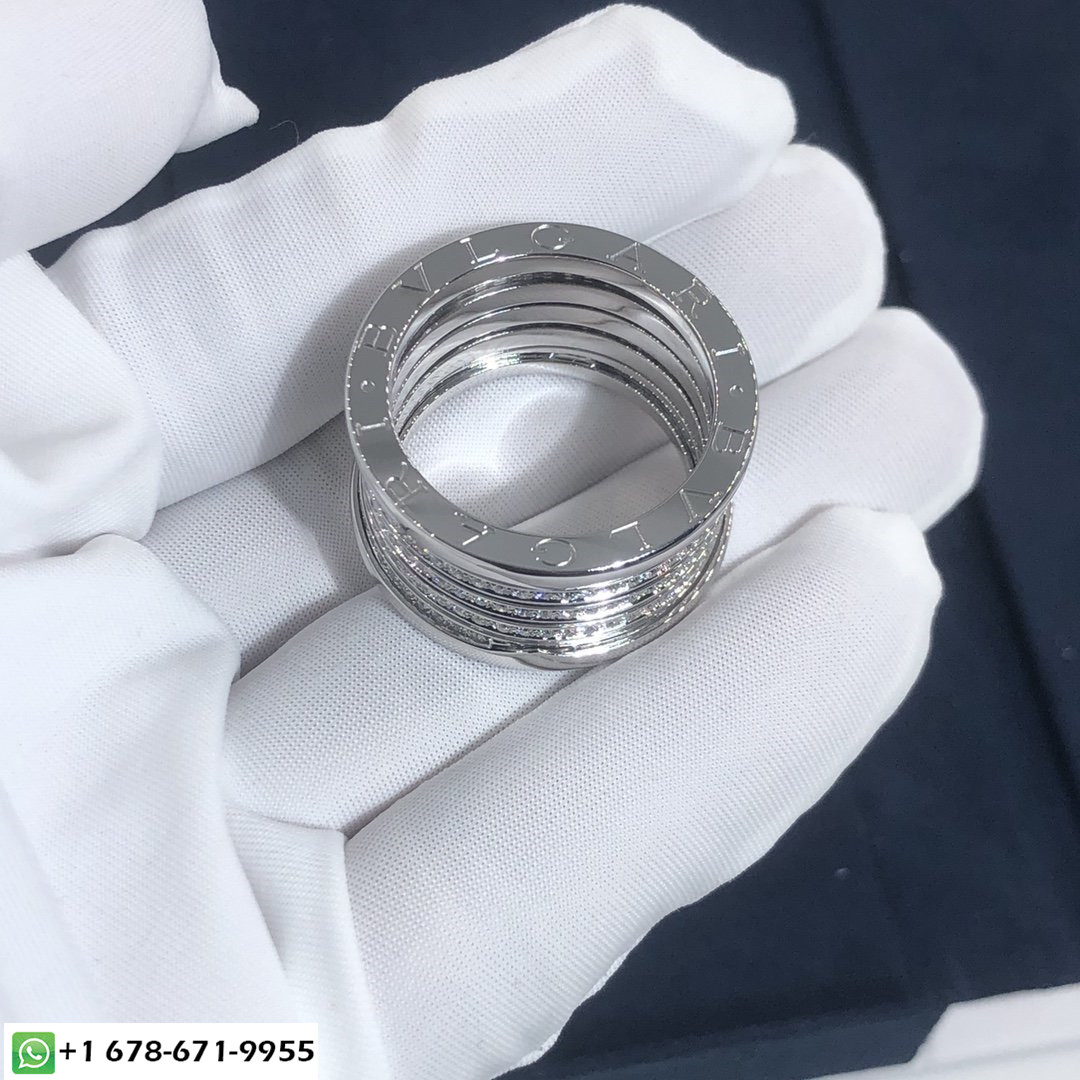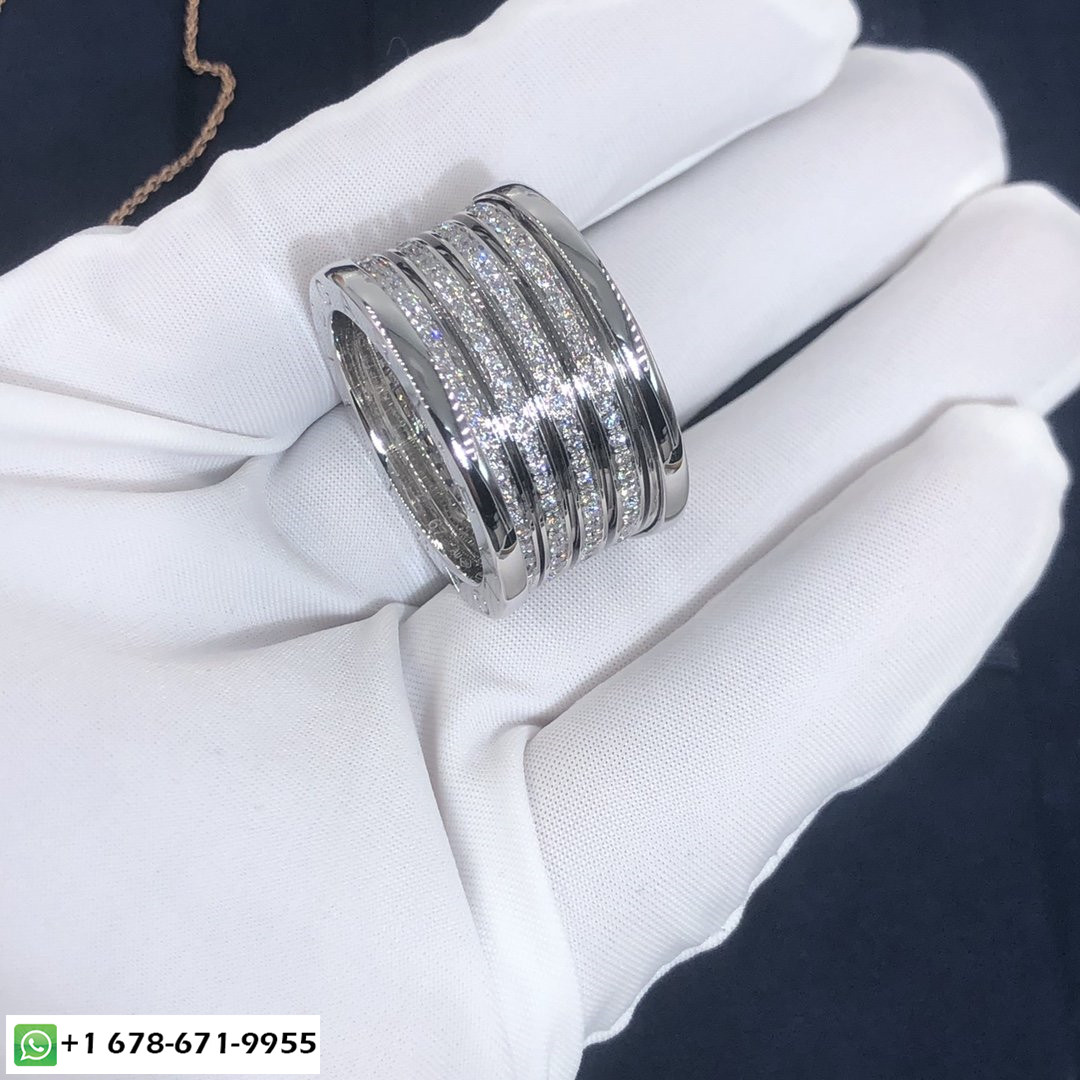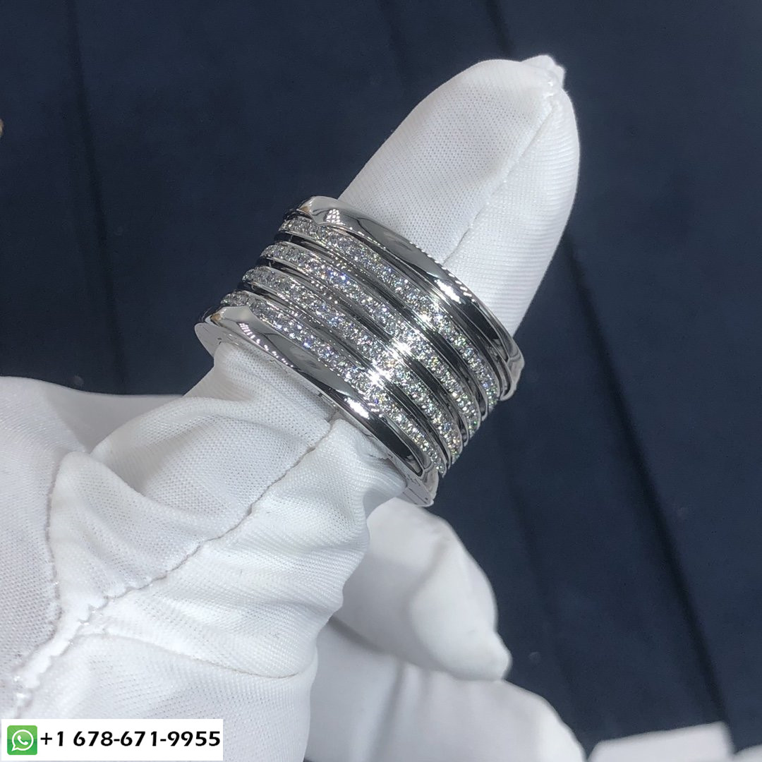 خاتم الذكرى السنوية الـ XX من بولغاري بي زيرو 1 بخمس نطاقات مصنوع خصيصًا من الذهب الأبيض عيار 18 قيراطًا, مرصع بأحجار الماس المرصوفة 1.42 قيراط على الحلزوني ، كما يتوفر خاتم بولغاري بي.زيرو 1 XX من الذهب الوردي عيار 18 قيراطًا والذهب الأصفر عيار 18 عند الطلب..