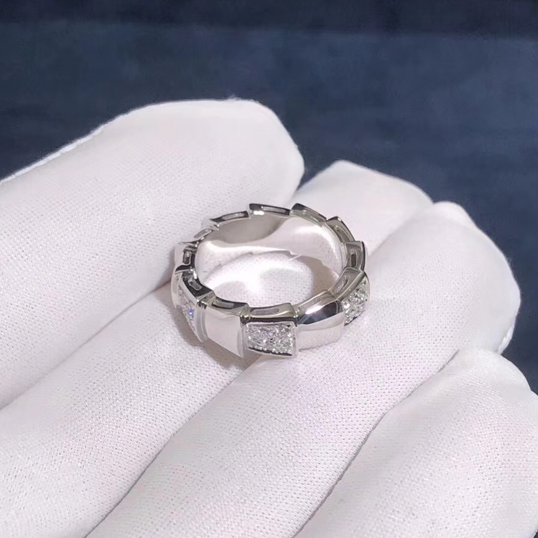 خاتم الأفعى بولغاري سيربنتي مصنوع من الذهب الوردي عيار 18 قيراطًا(أو ذهب أبيض عيار 18 قيراطًا) ومرصعة بعرق اللؤلؤ والماس المرصوف(0.43ط م) لتقليد الجمال الثمين للمقاييس, يمثل شكل الأفعى الحكمة, الحيوية والإغواء, بينما تضفي المواد الثمينة جاذبية مميزة لمن يرتديها.