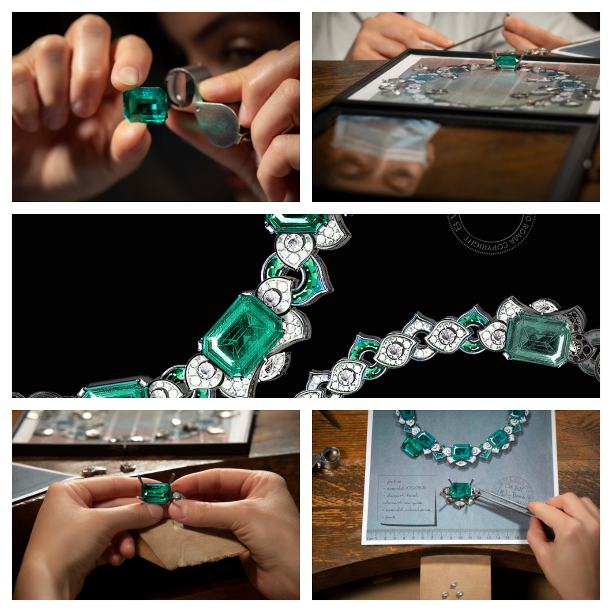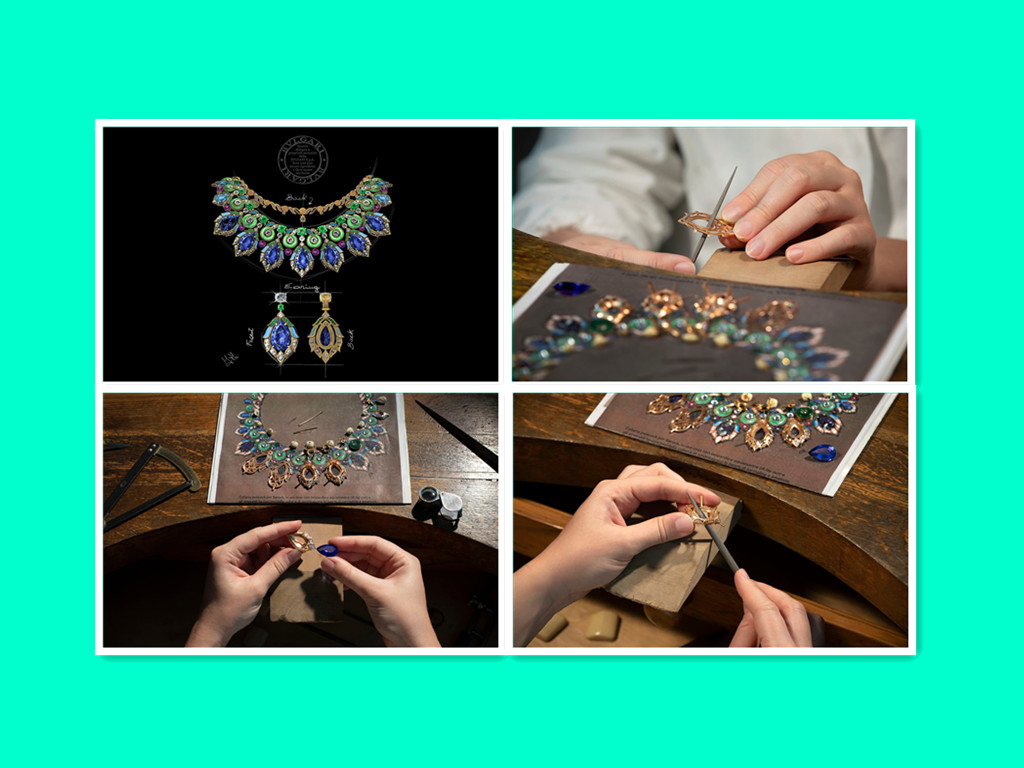 يتساءل: عقد Green Dream مرصع بخمسة أحجار زمرد كولومبية رائعة ذات لون حيوي للغاية, التي قضت لوسيا سيلفستري أكثر من عام في البحث عنها. يخلق قصها الهش تباينًا ساحرًا جنبًا إلى جنب مع الزخارف الرشيقة والرائعة من الماس والزمرد. سوار وأقراط يكملان الطقم بتأثير آسر للضوء والانعكاسات.