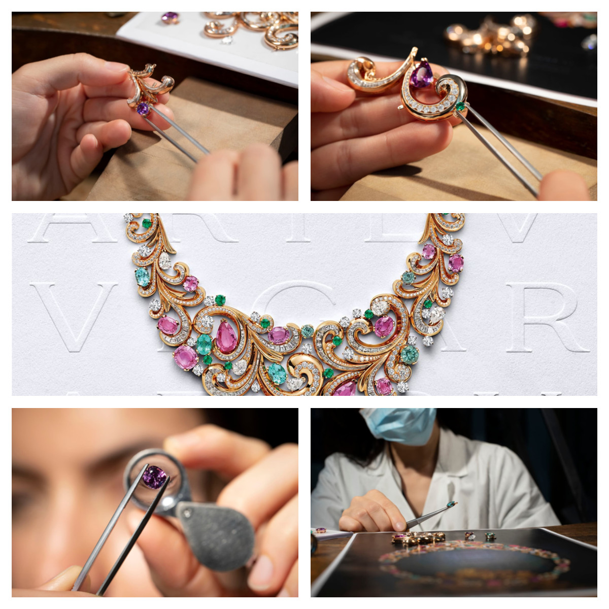 اللون:ربما يكون أكثر عقد باروكي في المجموعة هو ليدي أرابيسك, الذي يجسد جماليات الحقبة الباروكية, مدموجة مع لوحة ألوان بولغري النموذجية. ظلال ساحرة من الياقوت الوردي والأرجواني, ومضات النيون من بارايبا, يتناقض اللون الأخضر العميق للزمرد وشفافية الماس مع ظلال الذهب. تعترف لوسيا بأنها لم تستخدم مثل هذا المزيج من الألوان من قبل; في البداية أرادت إنشاء لوحة مختلفة تمامًا من الياقوت متعدد الألوان. تجربة الأحجار الكريمة لمدة شهر, قررت في النهاية الجمع بين أحجار متناقضة وردية وخضراء, لكنه استبعد على الفور أحجار الزمرد الكبيرة. وبالتالي, حولت انتباهها إلى بارايبا. ربما لاحظت بالفعل أن ليدي أرابيسك لديها تصميم معقد, وفي الواقع ، استغرقت عملية الإنشاء الكثير من الوقت.