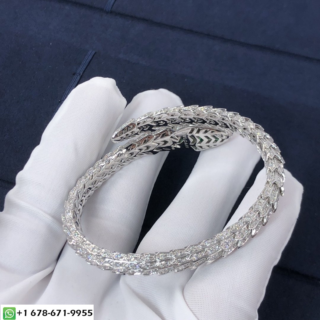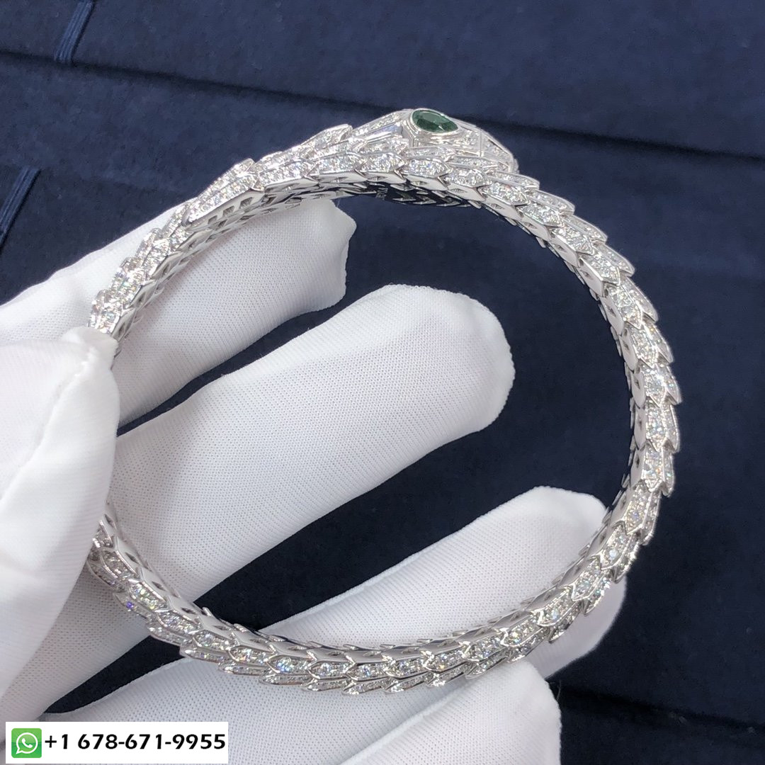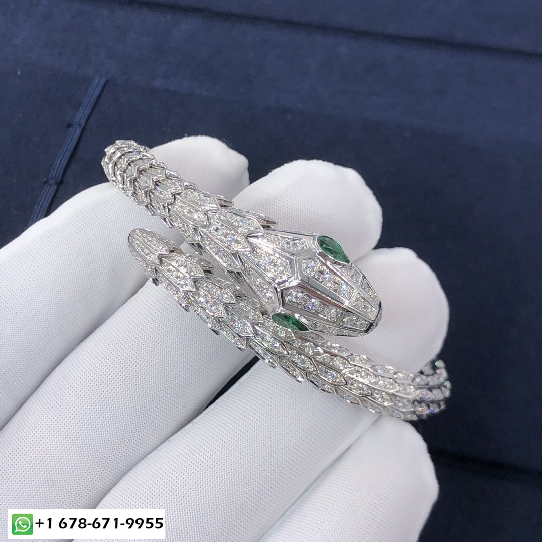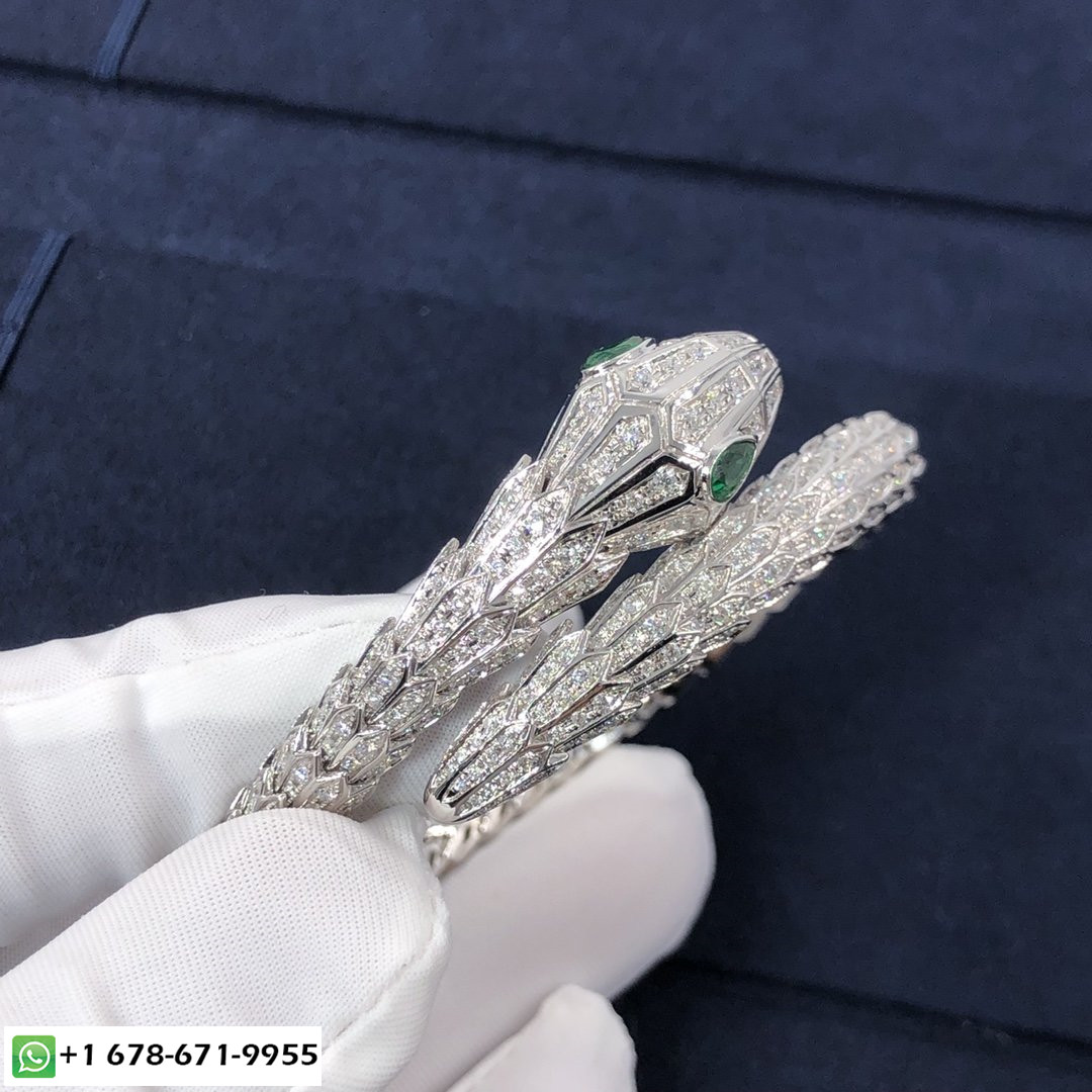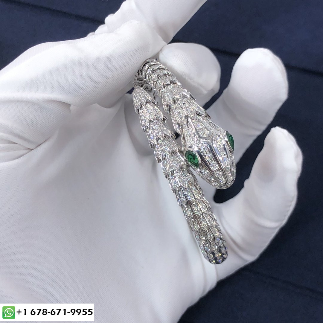 سوار بولغاري سيربنتي مع عينين من الزمرد مصنوع من الذهب الأبيض عيار 18 قيراط مرصع بالألماس بالكامل,يلتف حول الرسغ ويضرب بجمال الحراشف الثمين وبالانسيابية المميزة للثعبان.