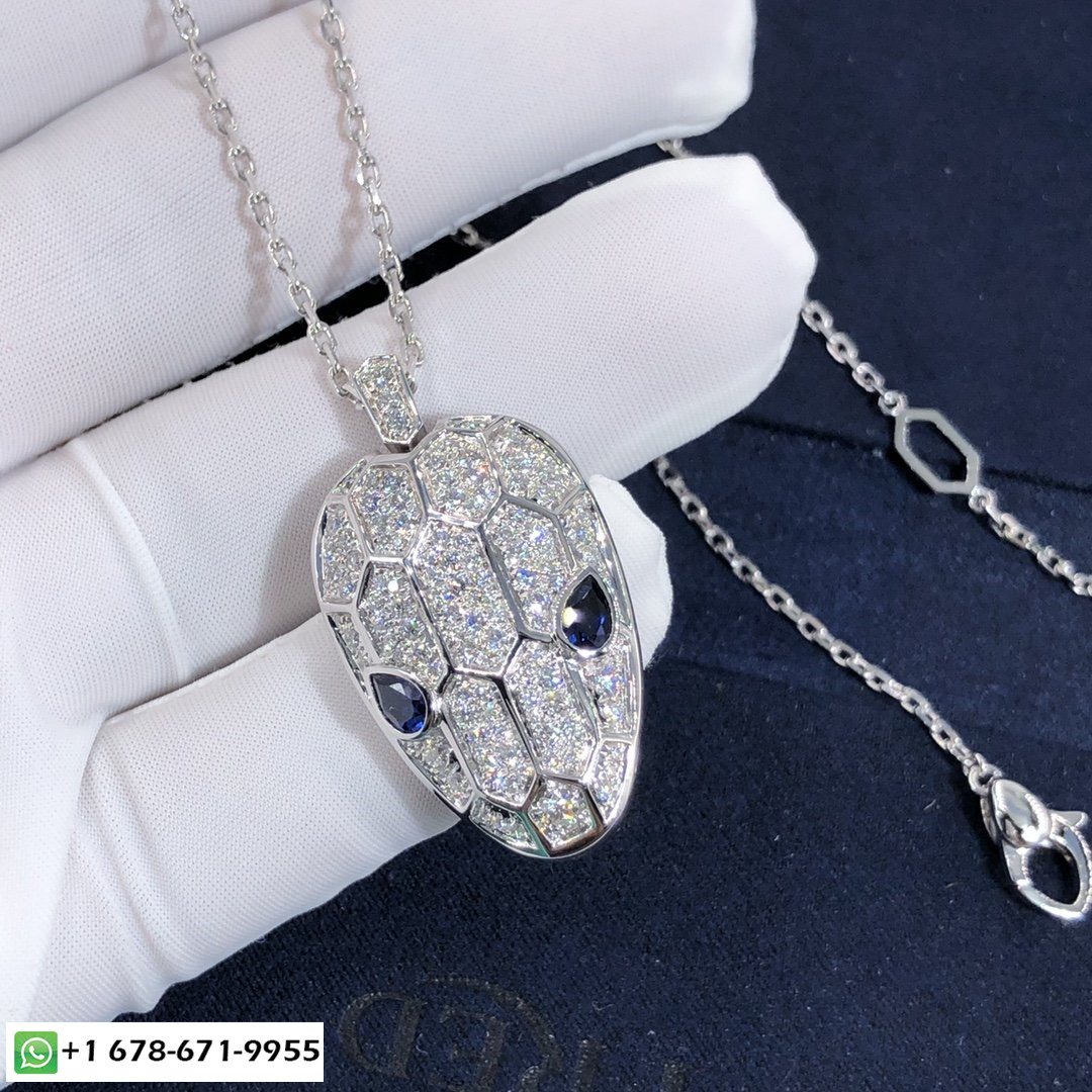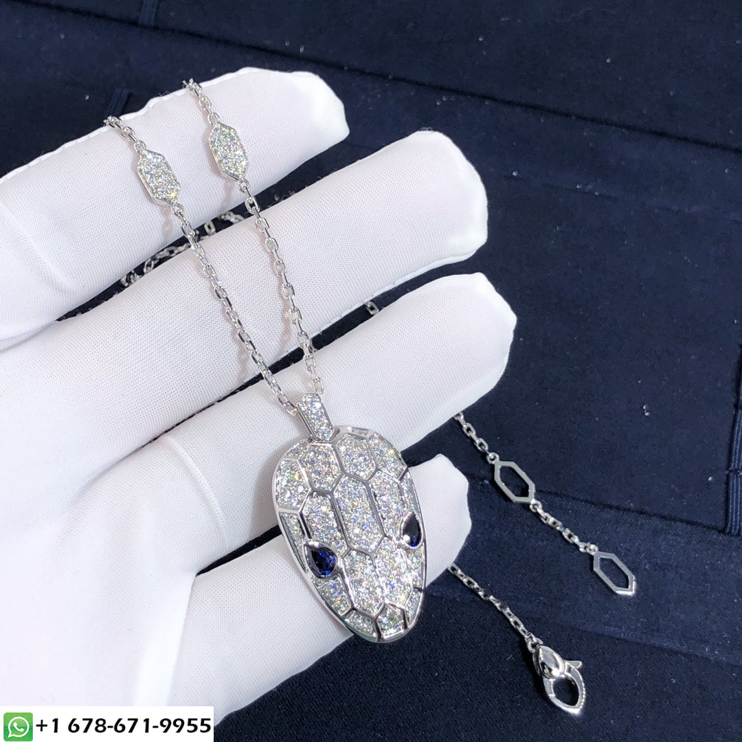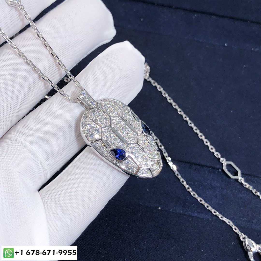 عقد بولغاري سيربنتي حسب الطلب من الذهب الأبيض عيار 18 قيراطًا,عيون الياقوت الأزرق (0.78 ط م) وبافيه الماس (2.25 ط م) على كل من السلسلة والقلادة.