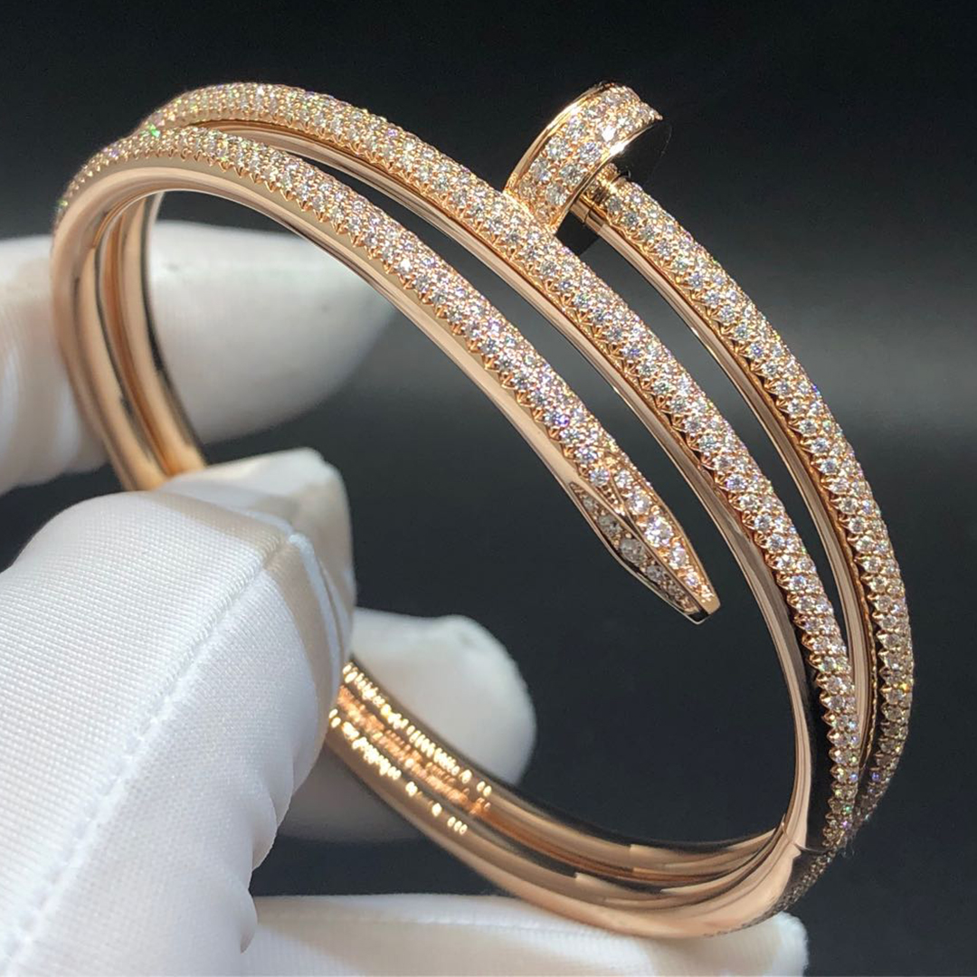 سوار أظافر كارتييه جوست أون كلو مصنوع من الذهب الوردي عيار 18 قيراطًا, مرصع 624 الماس قطع بريانت مجموع 3.61 قيراط ، سوار أظافر كارتييه Juste un Clou متوفر أيضًا من الذهب الأبيض عيار 18 قيراطًا والذهب الأصفر عيار 18 عند الطلب.