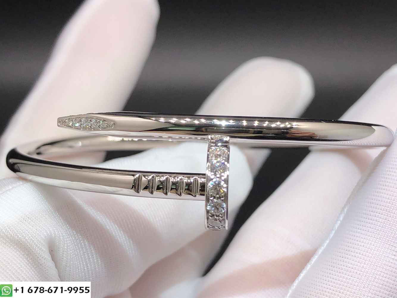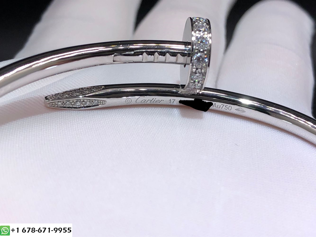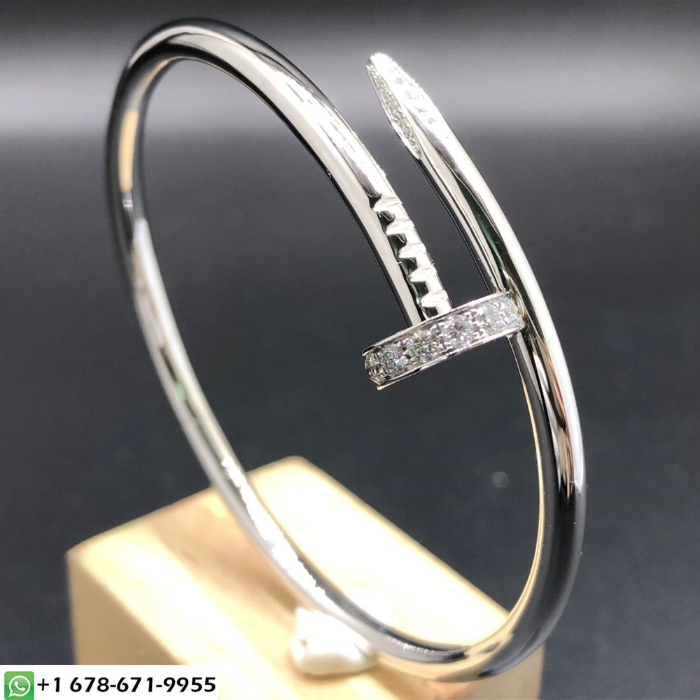 سوار كارتييه جوست أون كلو مصنوع خصيصًا من الذهب الأبيض عيار 18 قيراطًا والألماس,وزن الذهب 31 ~ 39 جرام(يصل إلى حجم سوارك),32 الماس قطع بريانت مجموع 0.59 قيراط,عرض 3.5 ملم سوار مخصص كارتييه يتوفر أيضًا من الذهب الوردي عيار 18 قيراطًا والذهب الأصفر عيار 18 عند الطلب.