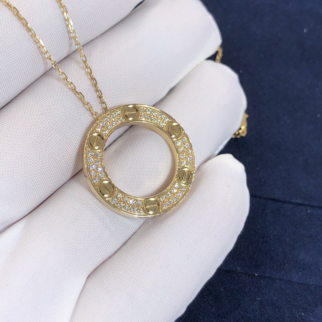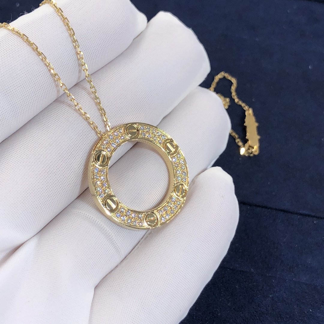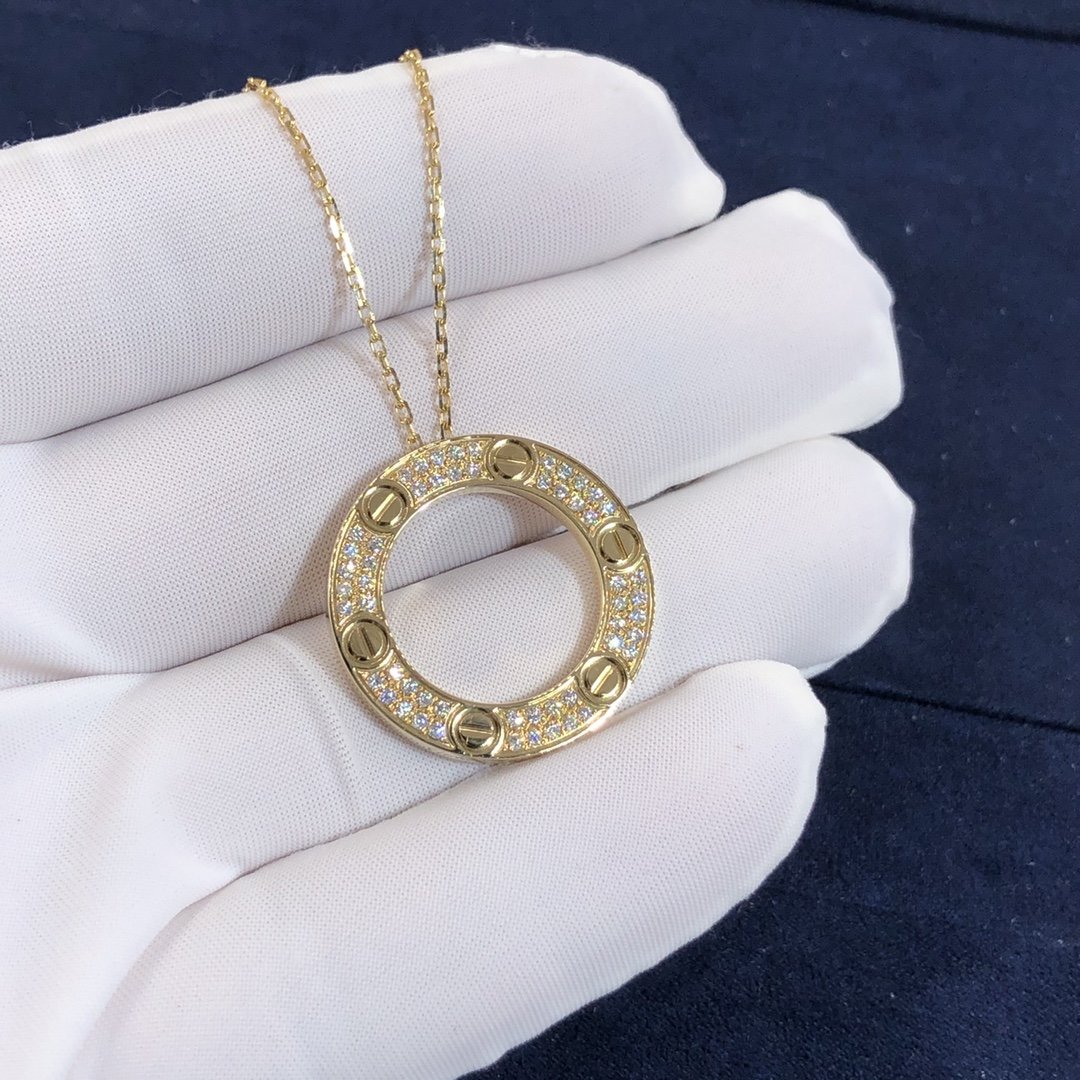 قلادة الحب كارتييه مصنوع من الذهب الأصفر عيار 18 قيراطًا,ومرصعة بزخارف المسمار الأيقونية و 54 قطع الماس اللامع يبلغ مجموعها 0.34 قيراط في إعداد تمهيد يلعب على المظهر الأبدي مع قلادة دائرية في وسط عقد السلسلة الرقيقة. القطر الداخلي 15.95 مم. طول السلسلة: 42سم.قلادة كارتييه الماسية متوفرة أيضًا من الذهب الأبيض عيار 18 قيراطًا والذهب الوردي عيار 18 عند الطلب.