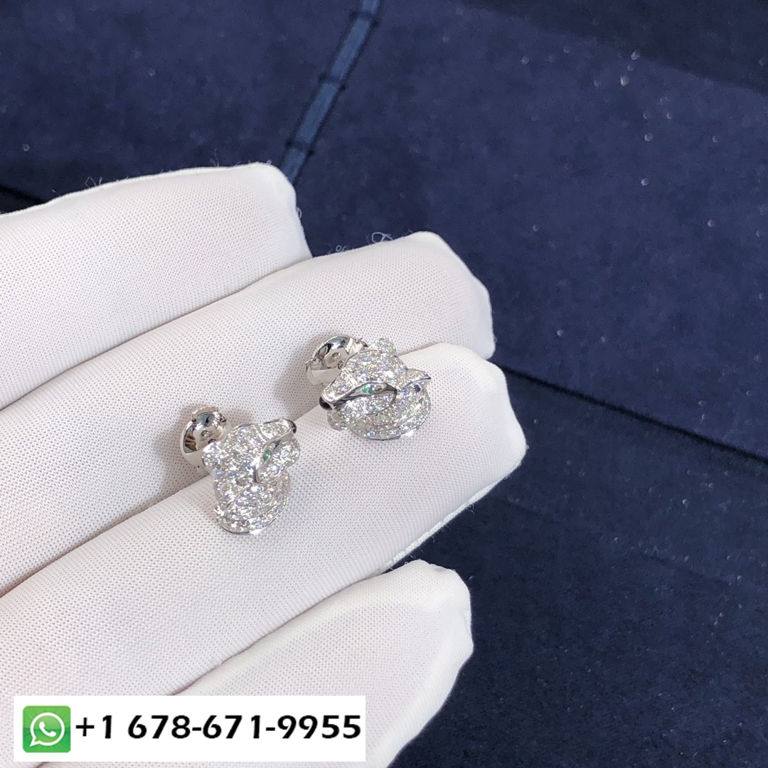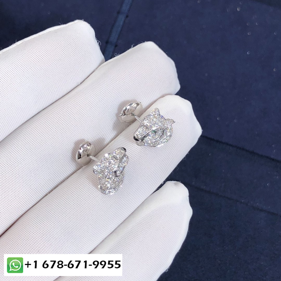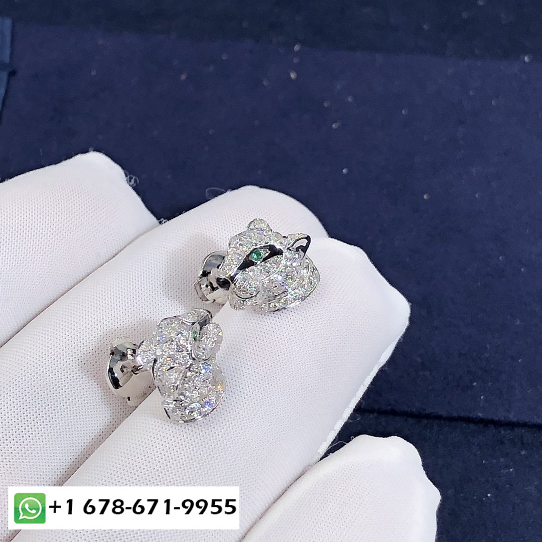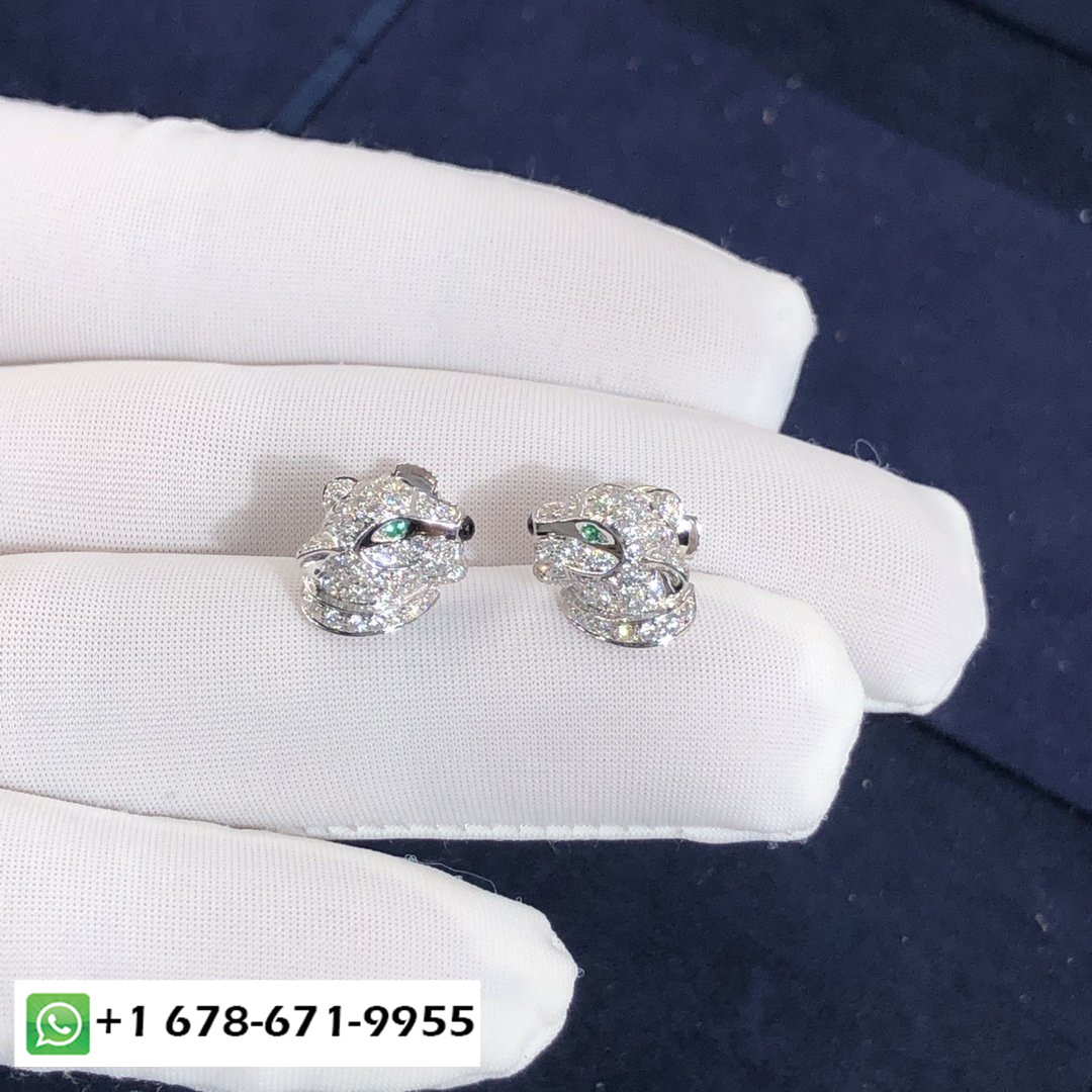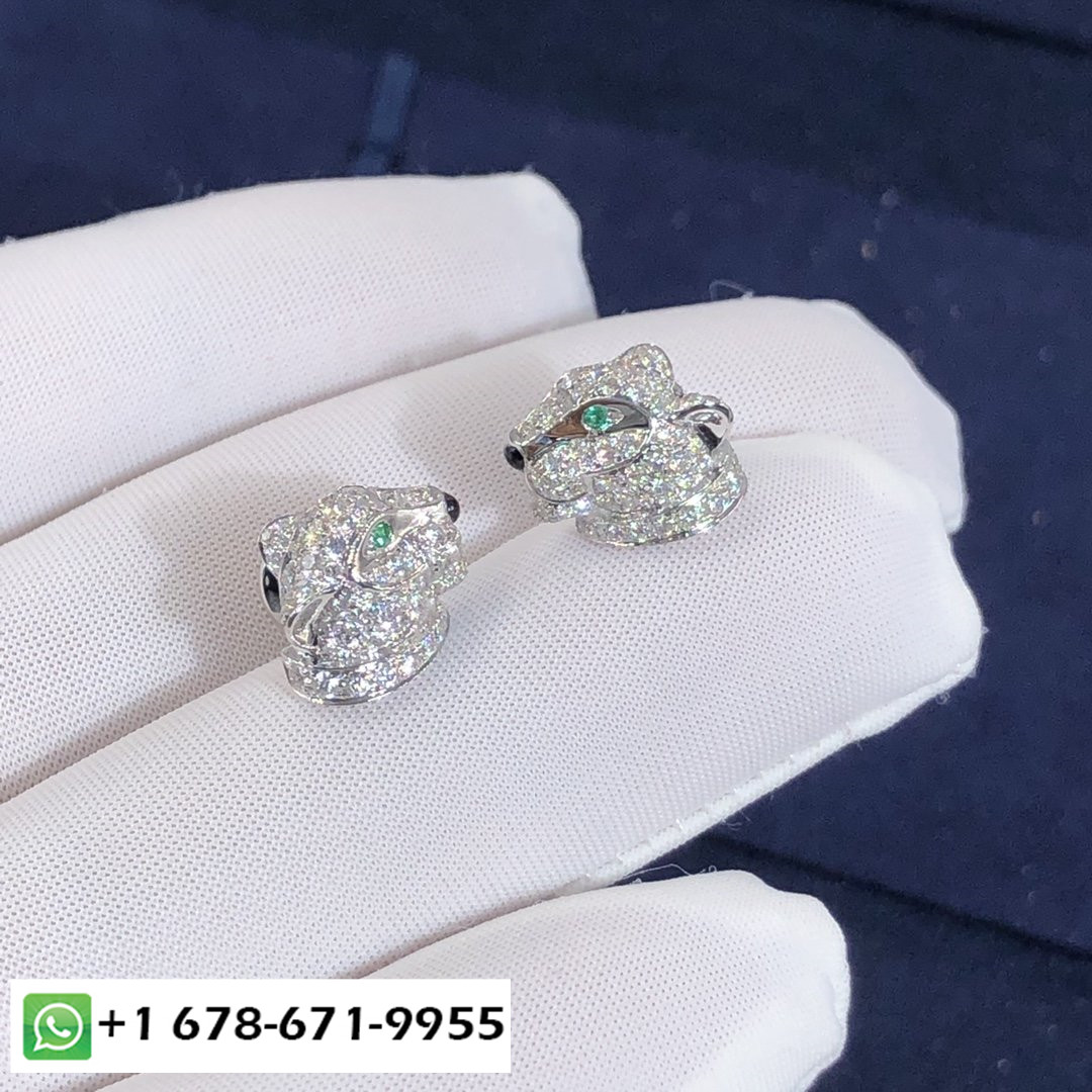 أقراط بانثير دو كارتييه حسب الطلب من الذهب الأبيض عيار 18 قيراطًا,كل مجموعة مع الزمرد, الجزع و 63 الماس قطع بريانت مجموع 0.38 قيراط. عرض الحافز: 12.7 مم. سمك الشكل: 4.64 مم.