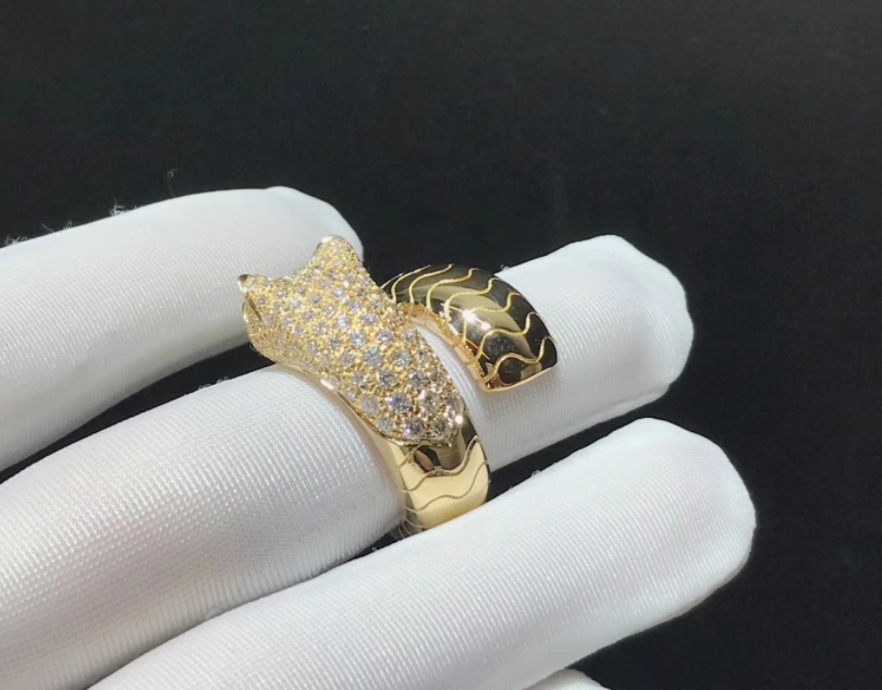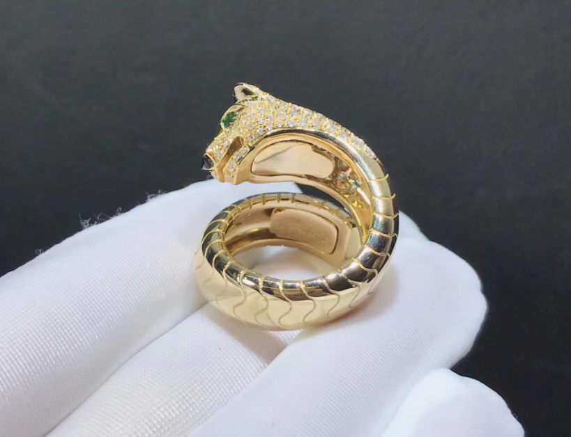 خاتم بانثير دي كارتييه مرصع بالألماس مصنوع من الذهب الأصفر عيار 18 قيراطًا,لون العيون زمردي,أنف الجزع,ومرصعة بـ 158 قطعة من الماس إجمالي 2.07 قيراط.