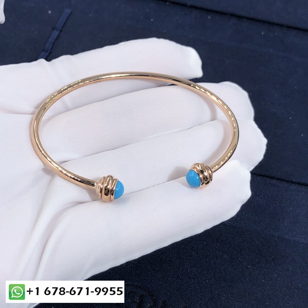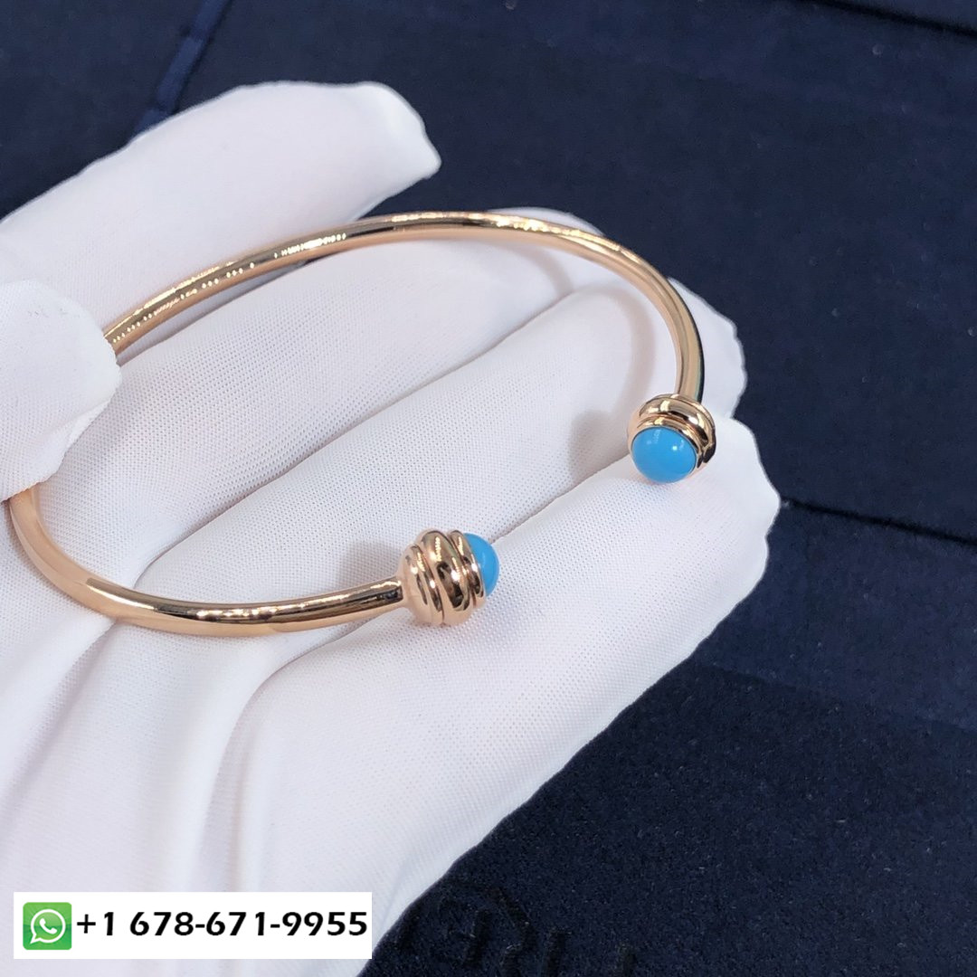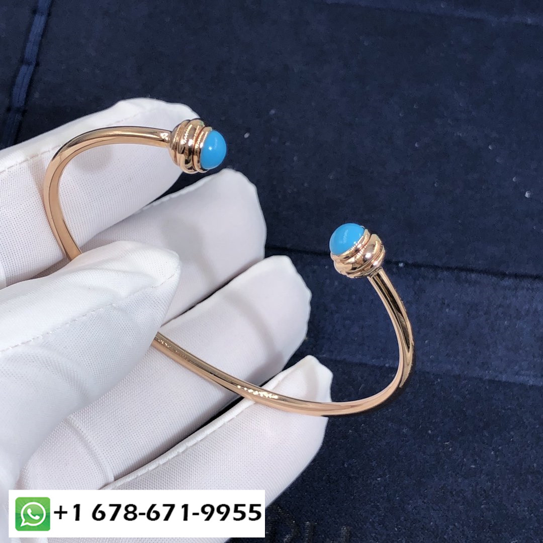 سوار مفتوح بحيازة بياجيه حسب الطلب سوار من الذهب الوردي عيار 18 قيراط مزين بـ 2 كبوشن الفيروز.وزن الذهب:6.2 ز عرض السوار: 2.5 مم.عرض حجم الحافز:5.3 مم.
