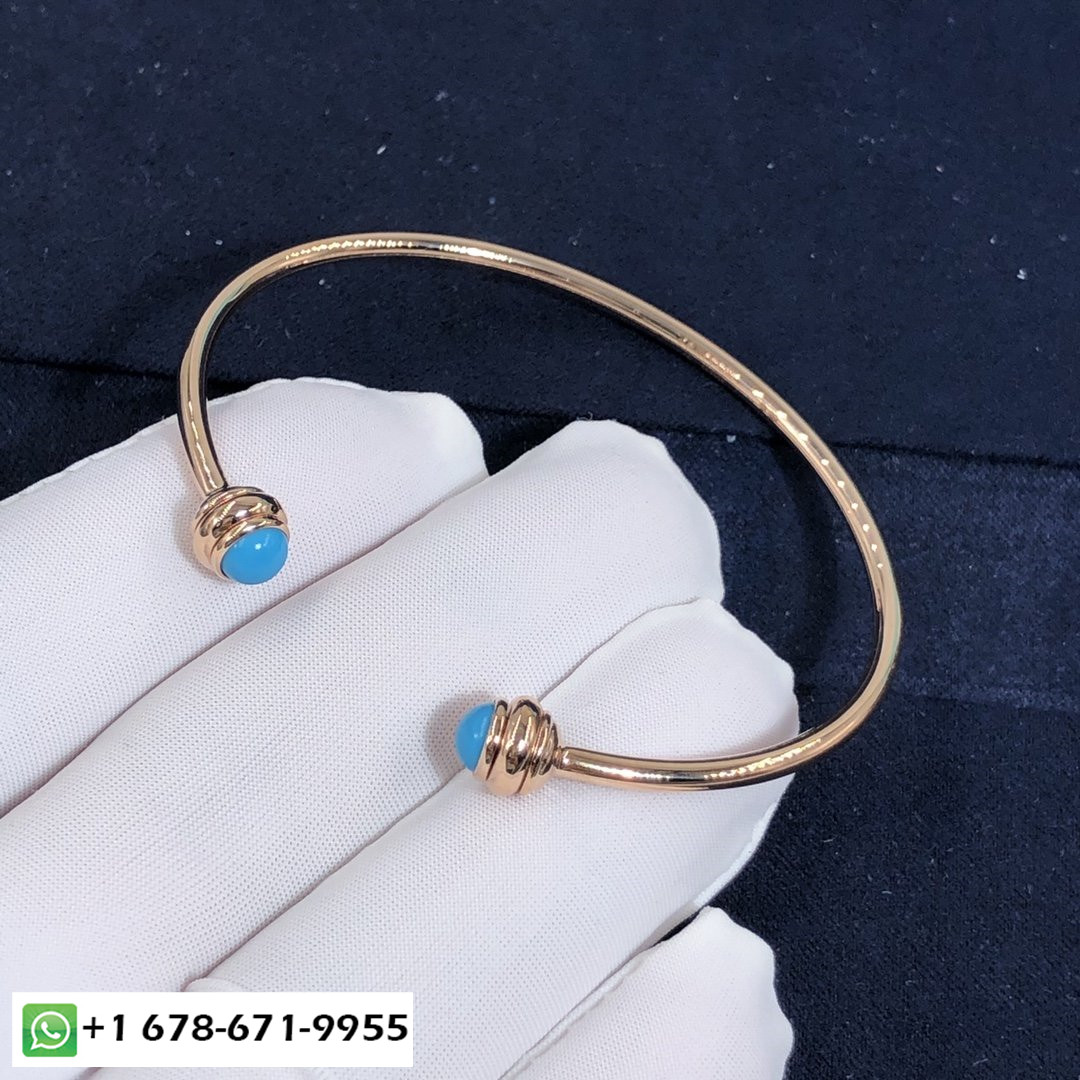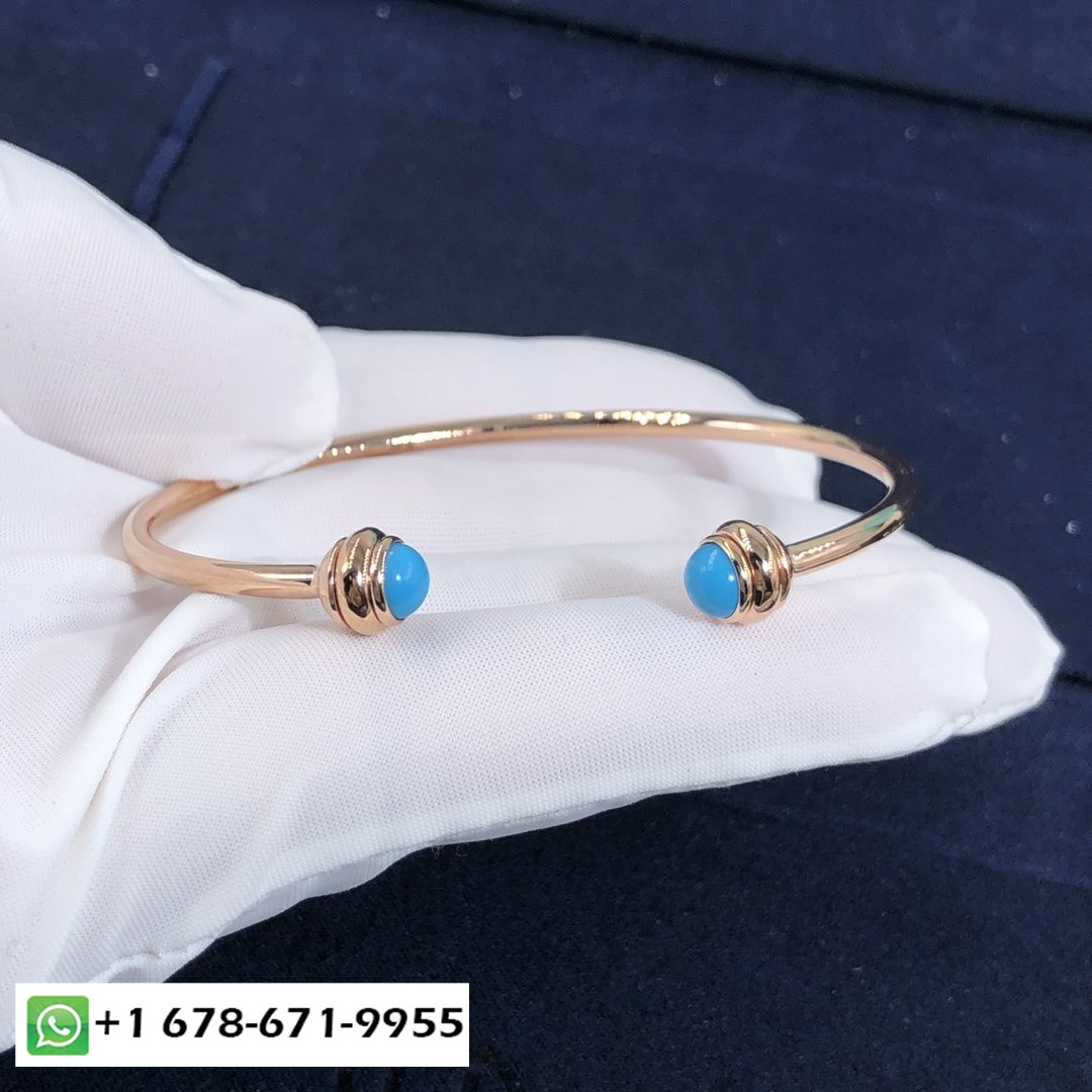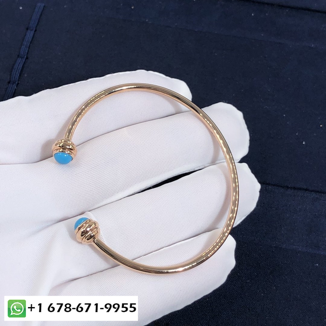 سوار مفتوح بحيازة بياجيه حسب الطلب سوار من الذهب الوردي عيار 18 قيراط مزين بـ 2 كبوشن الفيروز.وزن الذهب:6.2 ز عرض السوار: 2.5 مم.عرض حجم الحافز:5.3 مم.