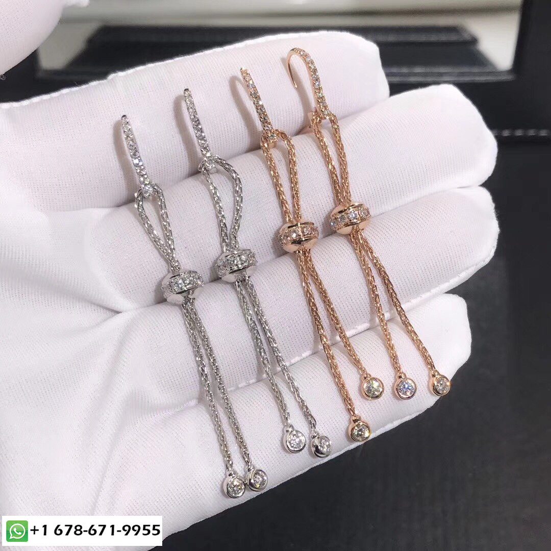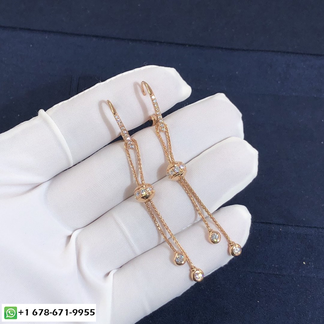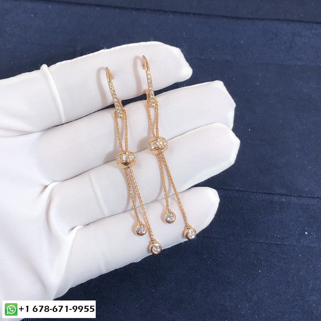 أدلى مخصص حيازة أقراط بياجيه من الذهب الوردي عيار 18 قيراط مع 40 الماس قطع بريانت مجموع 0.97 قيراط وزن الذهب:7.4 ز العرض:4.6 مم الطول:6.5 مم تسقط بأناقة من شحمة أذنها, زوج من الأقراط الذهبية الفاخرة من Possession تجمع بين صقل الذهب الوردي الثمين مع بريق الماس بقطع بريانت. من حلقة مصغرة منمنمة, ماسات متقاربة تتدلى من سلاسل غير متماثلة تتلألأ عندما تتأرجح برشاقة, بعد حركات مرتديها. يقترن مع قلادة بوسيشن المطابقة من الذهب الوردي والماس, يمنحها تصميم المجوهرات المرحة هذه الحرية للتحكم في مصيرها وتتبع تطلعاتها بثقة بالنفس وأسلوب متطور.