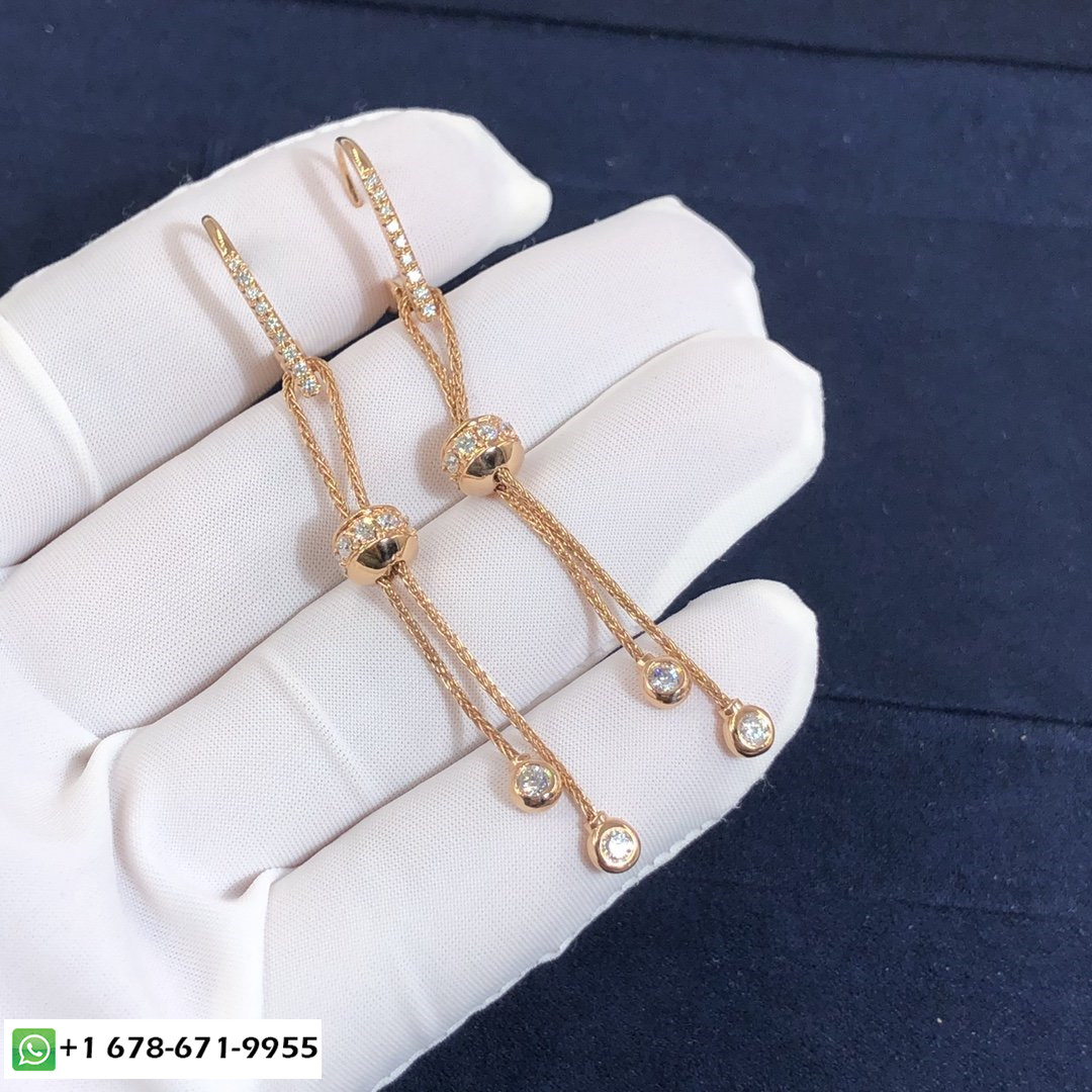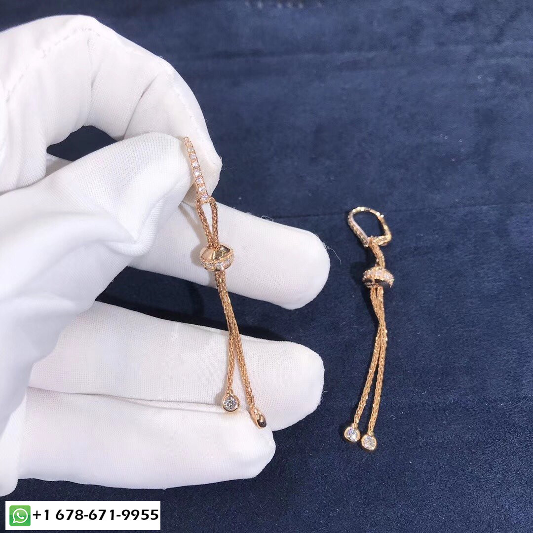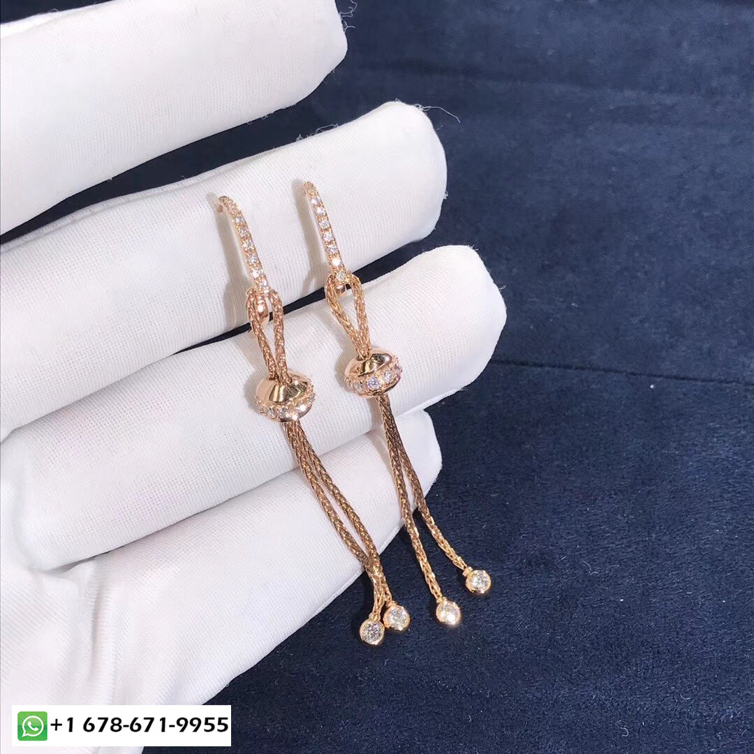 أدلى مخصص حيازة أقراط بياجيه من الذهب الوردي عيار 18 قيراط مع 40 الماس قطع بريانت مجموع 0.97 قيراط وزن الذهب:7.4 ز العرض:4.6 مم الطول:6.5 مم تسقط بأناقة من شحمة أذنها, زوج من الأقراط الذهبية الفاخرة من Possession تجمع بين صقل الذهب الوردي الثمين مع بريق الماس بقطع بريانت. من حلقة مصغرة منمنمة, ماسات متقاربة تتدلى من سلاسل غير متماثلة تتلألأ عندما تتأرجح برشاقة, بعد حركات مرتديها. يقترن مع قلادة بوسيشن المطابقة من الذهب الوردي والماس, يمنحها تصميم المجوهرات المرحة هذه الحرية للتحكم في مصيرها وتتبع تطلعاتها بثقة بالنفس وأسلوب متطور.