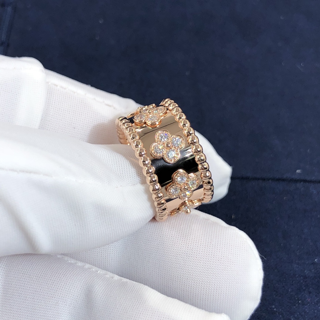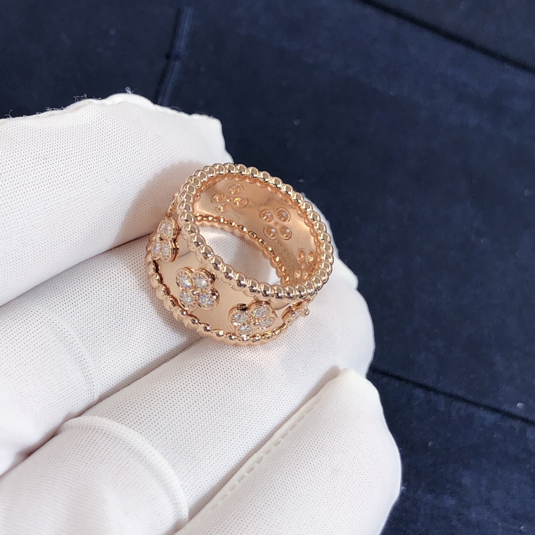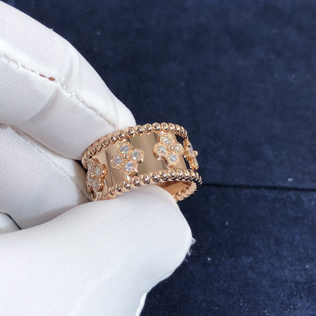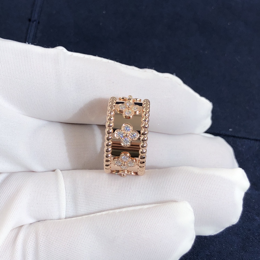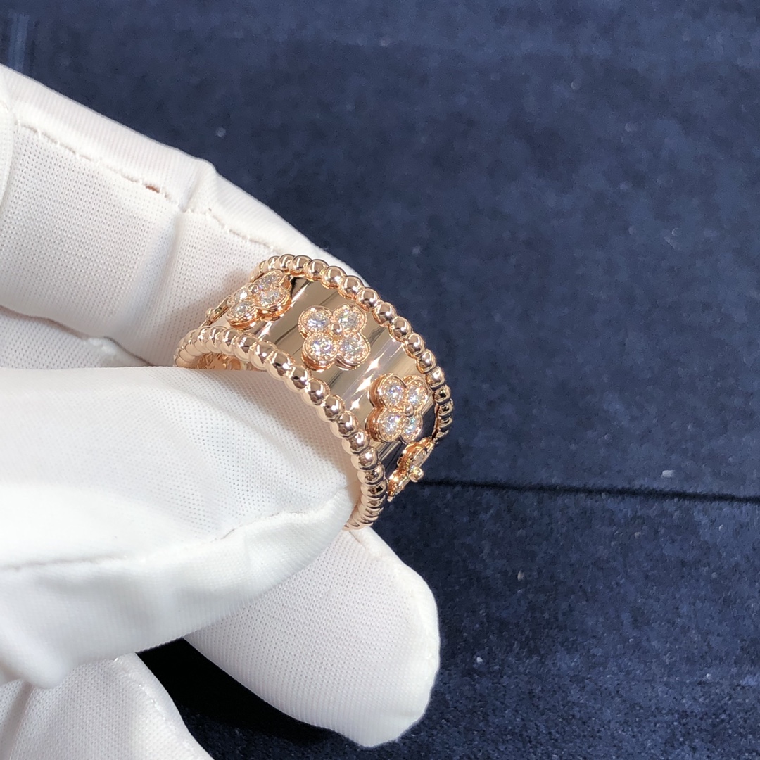 من الكليف & خاتم آربيلز بيرليه البرسيم مصنوع حسب الطلب من الذهب الوردي عيار 18 قيراط 28 مجموع الماس 0.63 ط م,نموذج صغير هذا الخاتم VCA متوفر أيضًا من الذهب الأبيض عيار 18 قيراطًا والذهب الأصفر عيار 18 عند الطلب.™ مجموعة البرسيم مزينة بزخارف البرسيم الثمينة – فان كليف & آربلز’ رمز الحظ. تزينها حبة ذهبية في وسطها.