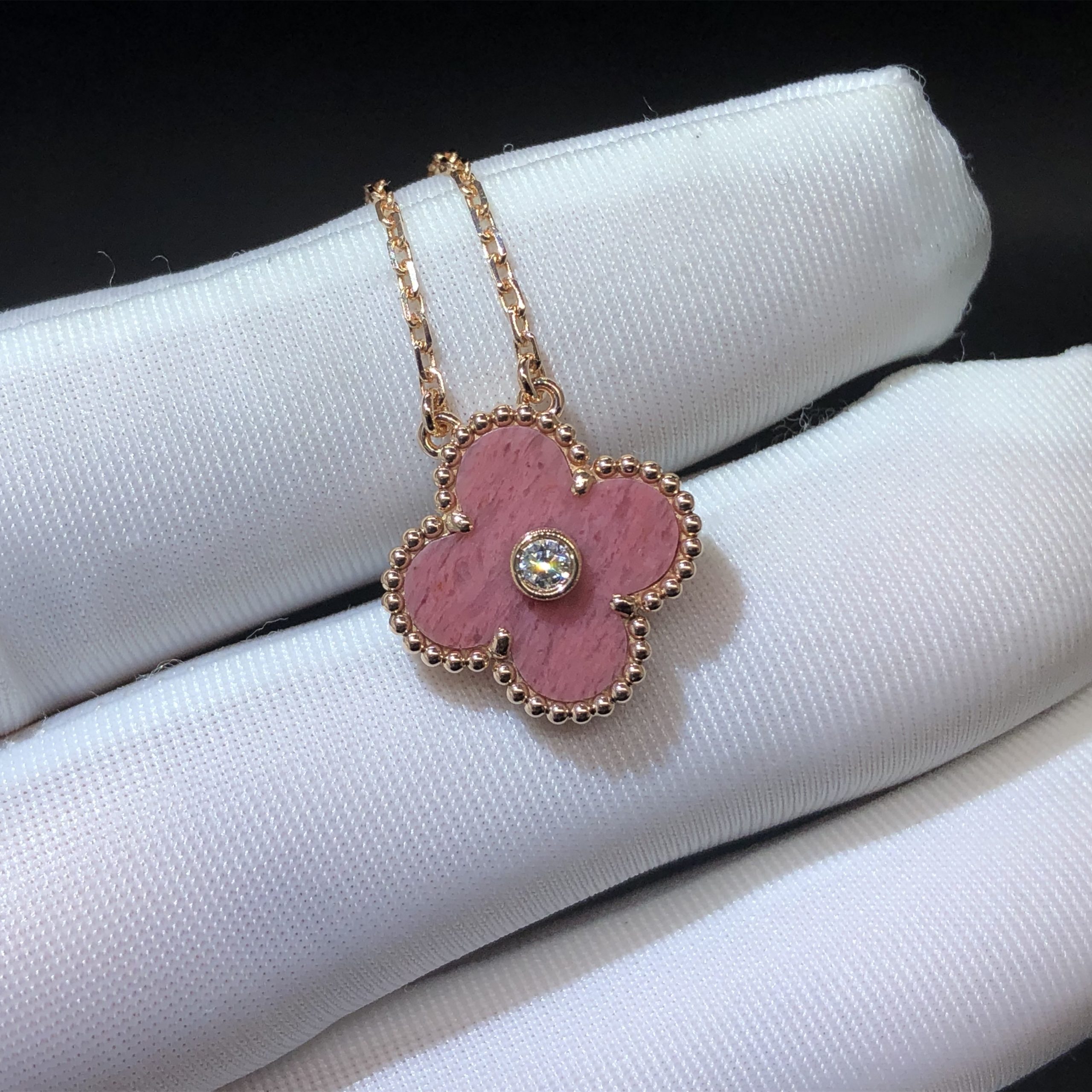 • فان كليف صنع حسب الطلب & عقد Arpels Vintage Alhambra المصنوع من الذهب الوردي عيار 18 قيراطًا مع الرودونيت والألماس