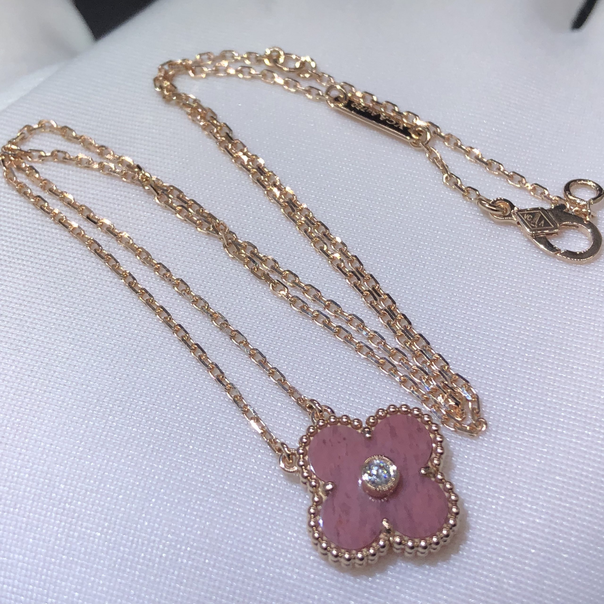 من الكليف & عقد آربلز فينتاج ألامبرا مصنوع من الذهب الوردي عيار 18 قيراطًا(وزن 5.5 غرام) مع الرودونيت والماس المركزي(0.05ط م).حجم القلادة 14.8 مللي متر.عقد VCA Vintage Alhambra متوفر أيضًا بالذهب الأصفر عيار 18 قيراطًا والذهب الأبيض عيار 18 عند الطلب.