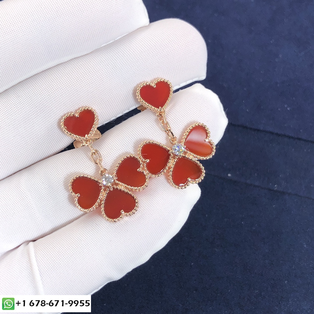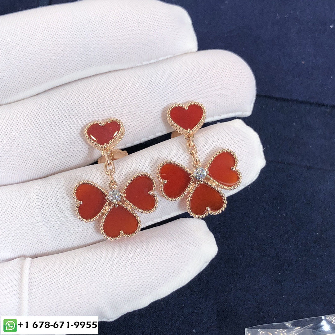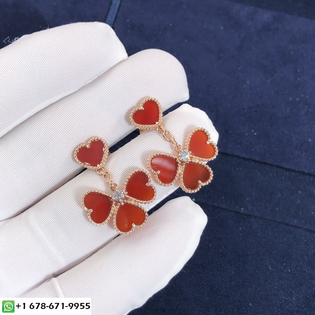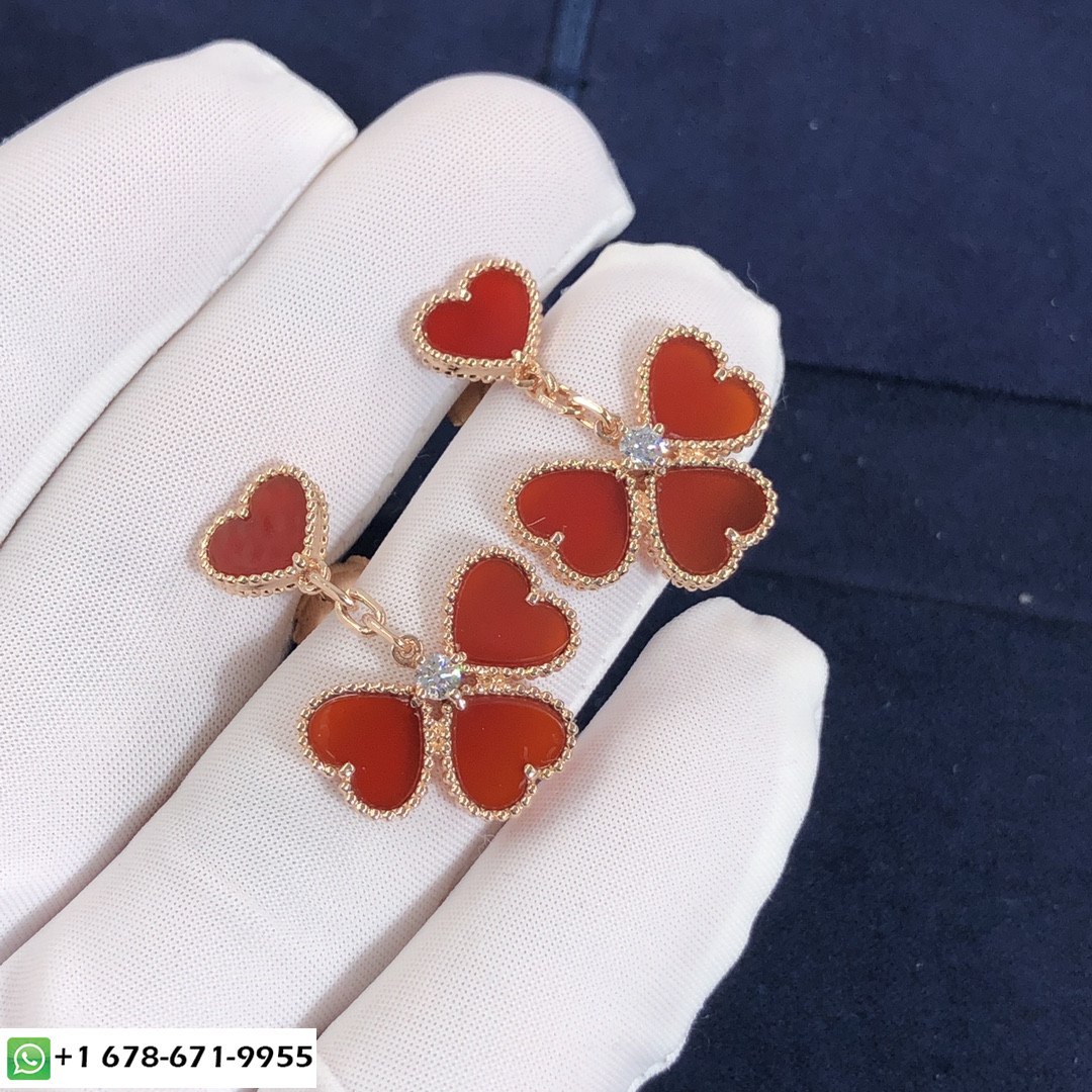 أقراط Sweet Alhambra ذات اللون الوردي من VCA مصنوعة حسب الطلب من الذهب الوردي عيار 18 قيراطًا,8 كارنيليان مع 2 الماس المستدير المجموع 0.17 ct هذا فان كليف & أقراط أربلز يتوفر أيضًا من الذهب الأصفر عيار 18 قيراطًا والذهب الأبيض عيار 18 قيراطًا عند الطلب. & منذ ذلك الحين ، ظهرت Arpels بزخارف محظوظة مبهجة في شكل مصغر 2007. خفيف وحساس, إنها طريقة سرية لجلب السعادة لكل يوم يمر.
