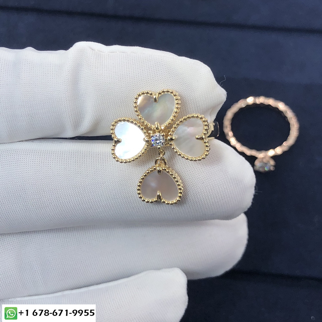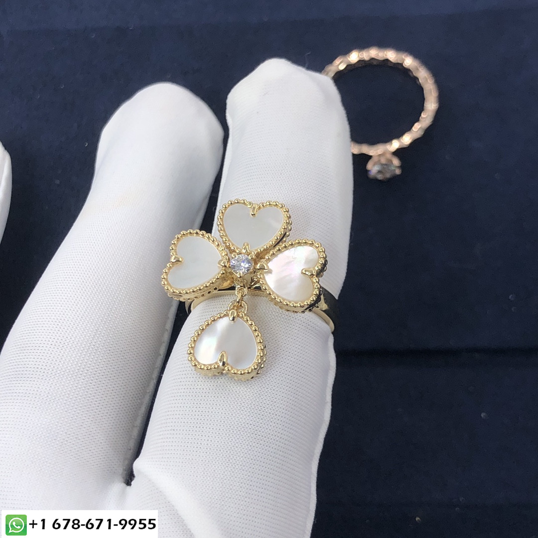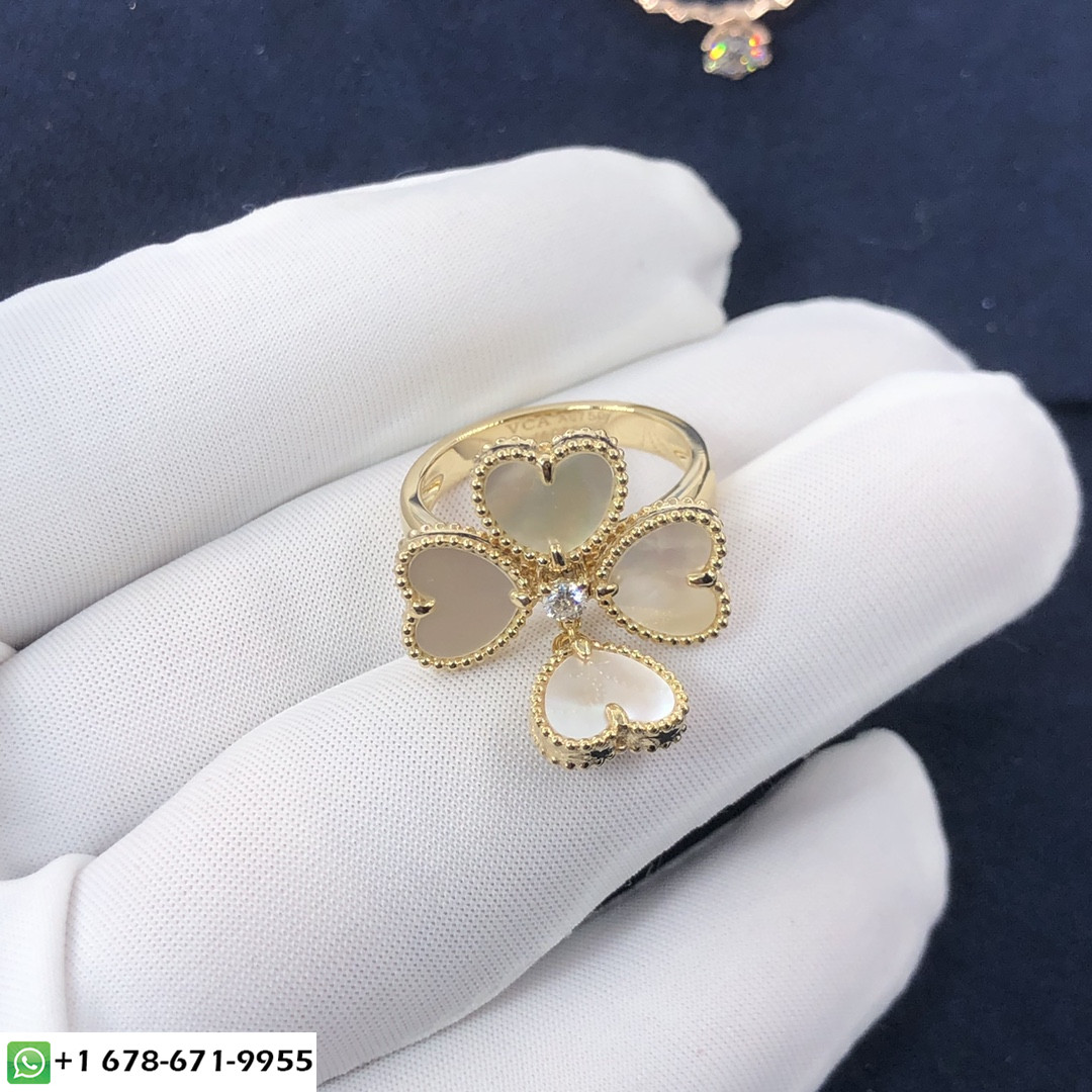 خاتم Sweet alhambra effeuillage المصنوع حسب الطلب من الذهب الأصفر عيار 18 قيراطًا,4 عرق اللؤلؤ الأبيض ومجموع الألماس 0.09 ct هذا فان كليف & خاتم أربلز يتوفر أيضًا من الذهب الوردي عيار 18 قيراطًا والذهب الأبيض عيار 18 قيراطًا عند الطلب. & منذ ذلك الحين ، ظهرت Arpels بزخارف محظوظة مبهجة في شكل مصغر 2007. خفيف وحساس, إنها طريقة سرية لجلب السعادة لكل يوم يمر.