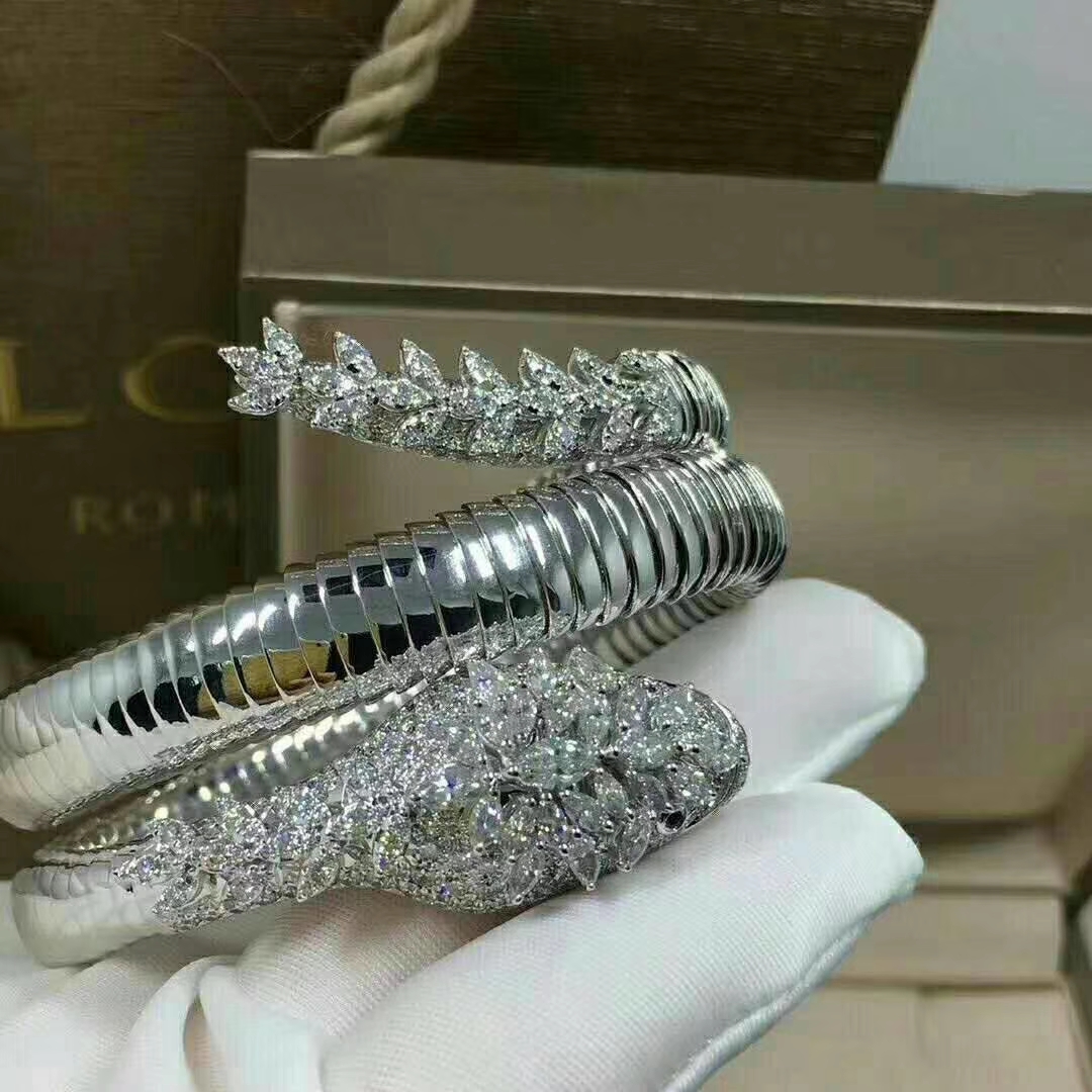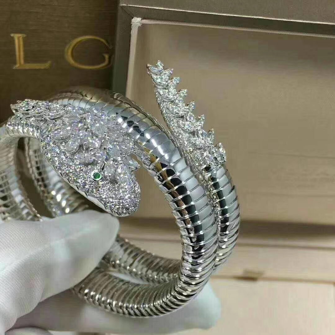 تخصيص سوار بلغاري سيربنتي للمجوهرات الرّاقية من الذهب الأبيض عيار 18 قيراطًا(الوزن 182 جرام),ماركيز قطع الماس بريانت & الماس المستدير وعيون الزمرد.
