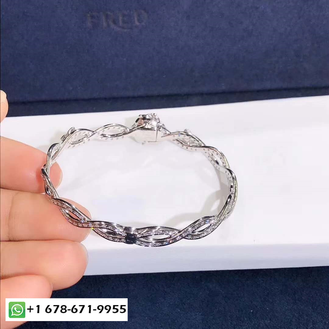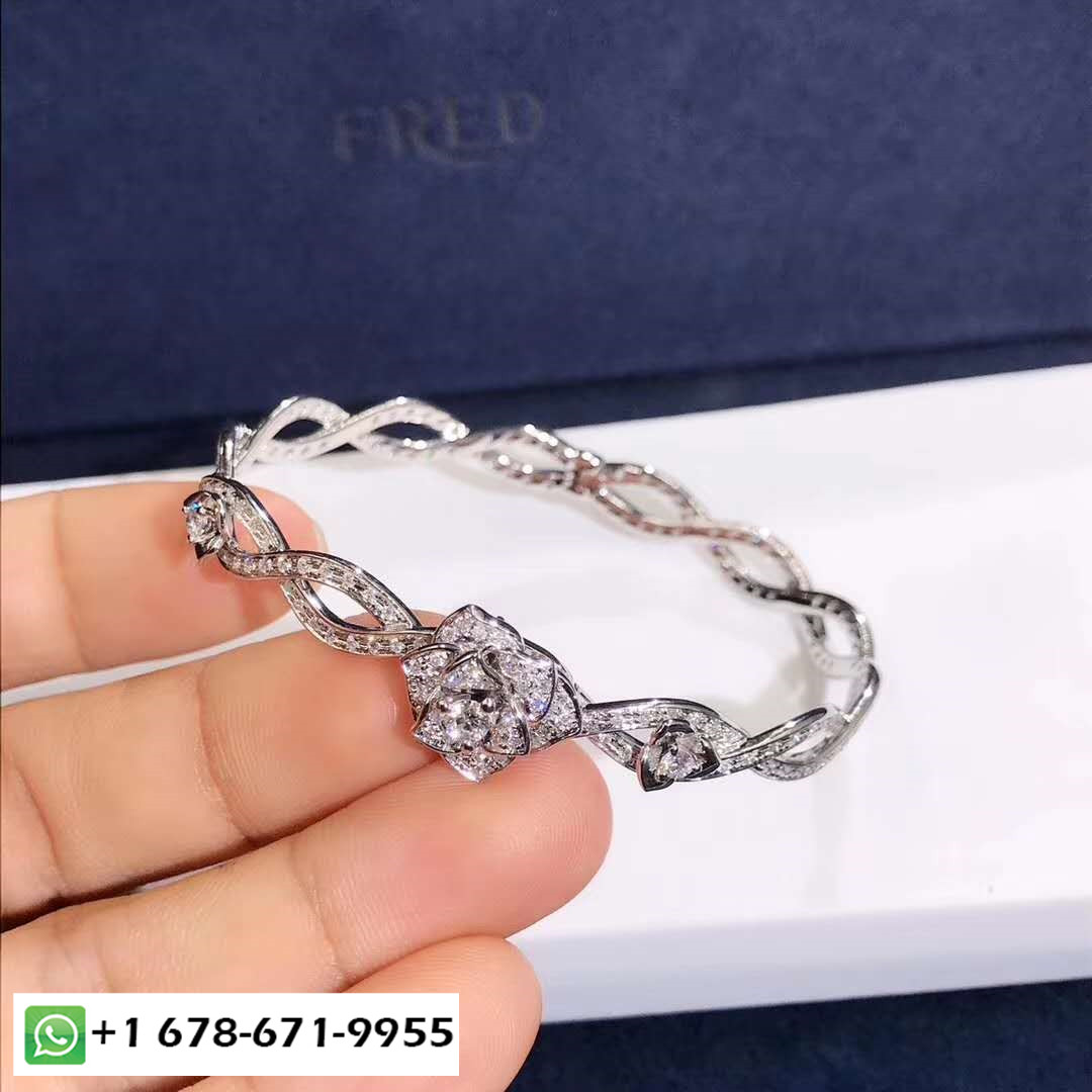 ينضح هذا السوار بأناقة مثل البتلات والورود من الذهب الأبيض المرصع بأحجار الألماس اللامعة التي تتناسب بشكل أنيق مع منحنى المعصم. الرفيق المثالي لأي مظهر, إنها تعكس سحر الطبيعة وتتميز بأناقتها الخالدة.