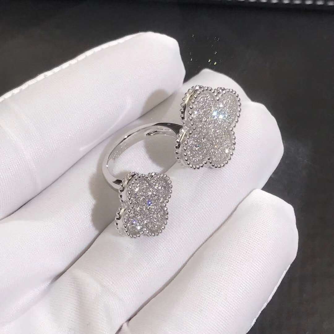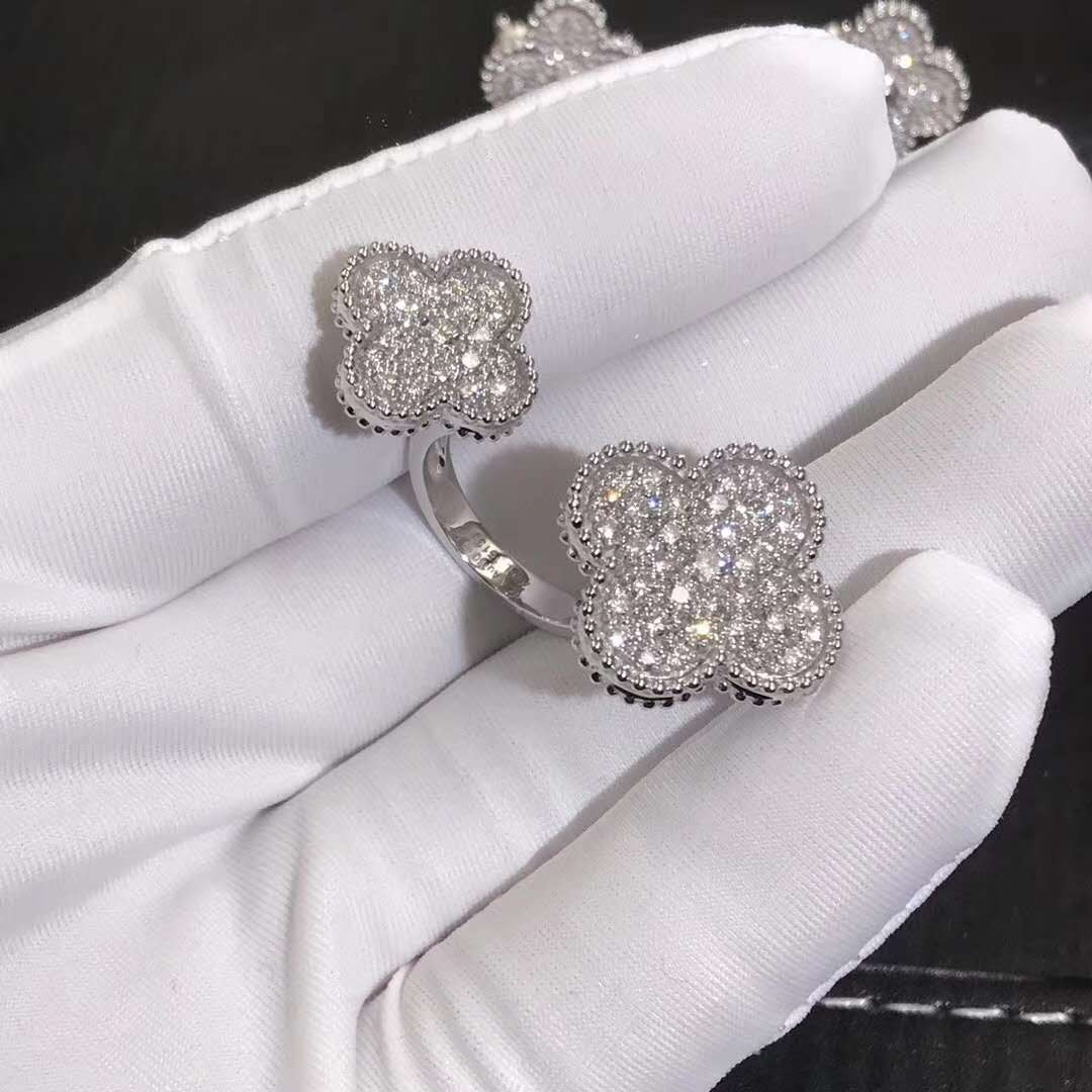 من الكليف & خاتم أربلز ماجيك ألامبرا بين البنصر مصنوع من الذهب الأبيض عيار 18 قيراطًا(الوزن 13.5 جرام) و 58 قطع من الماس المستدير الوزن الإجمالي 1.6 قيراط الحجم تراوح من 46 مم إلى 60 مم.