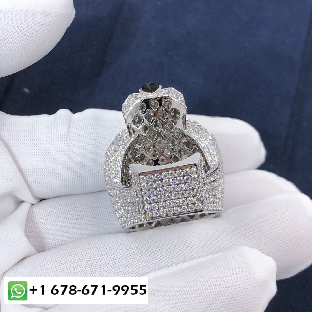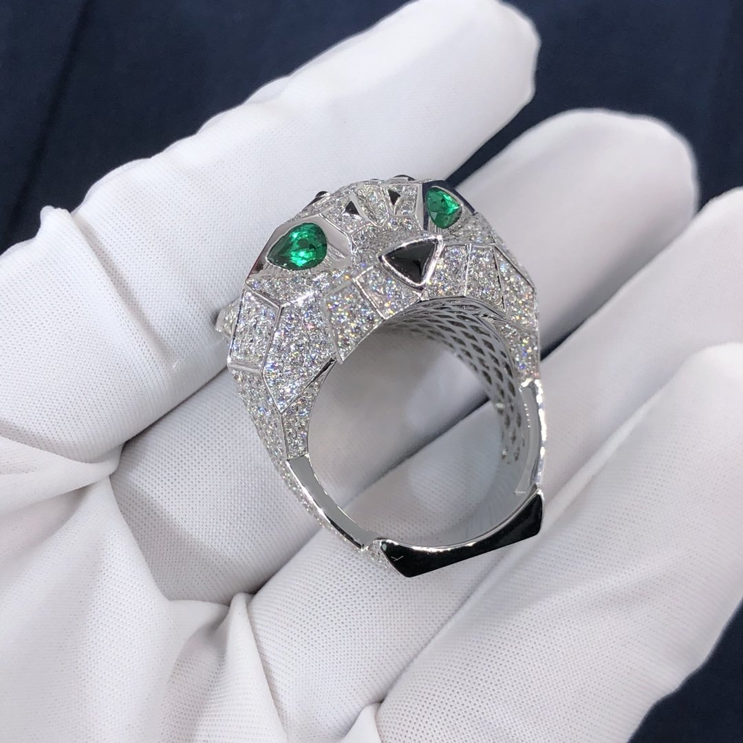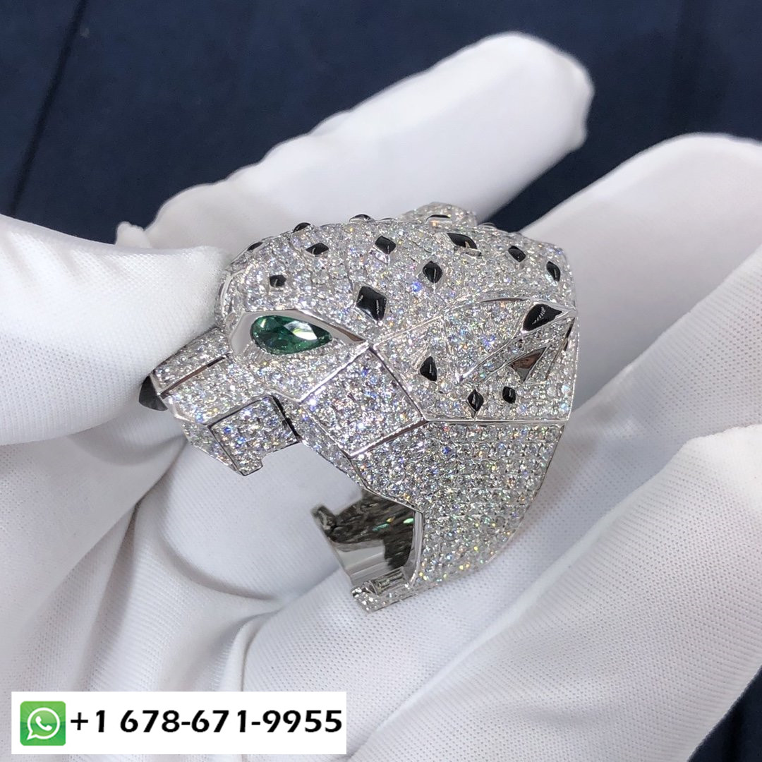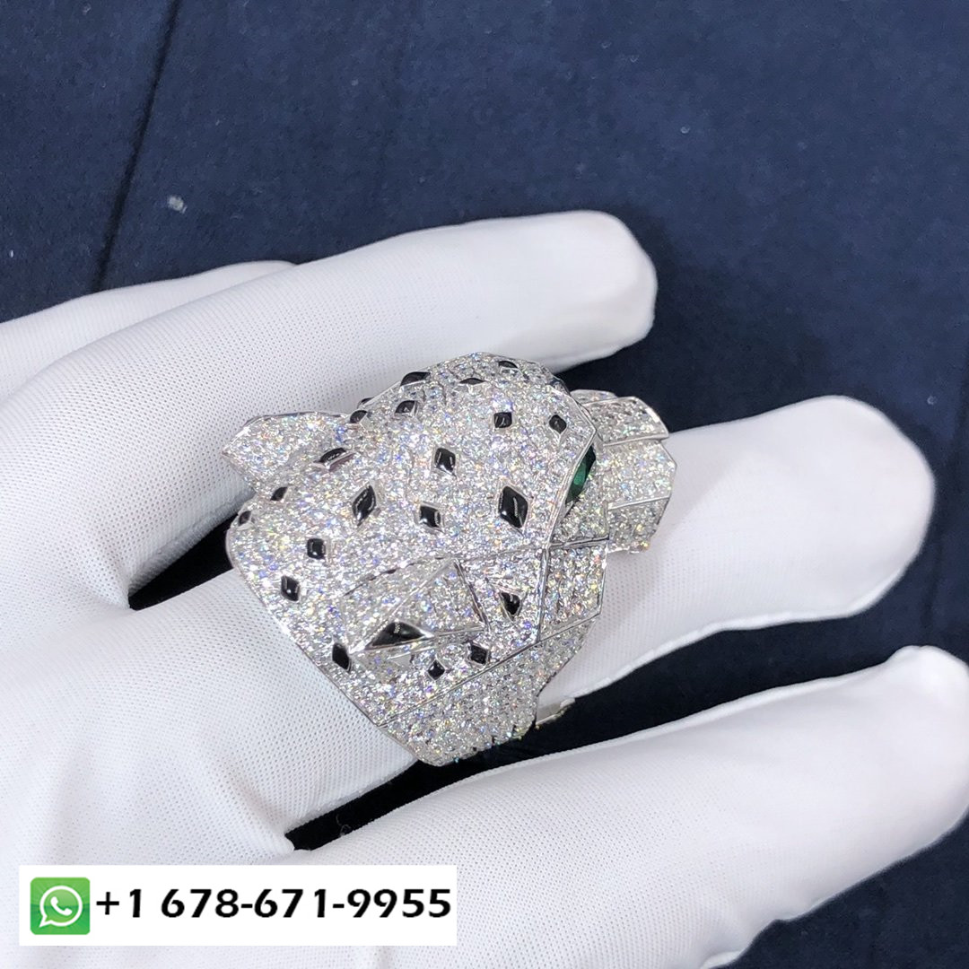 خاتم بانثير دو كارتييه مصنوع من الذهب الأبيض عيار 18 قيراطًا,مرصع بالماس بالكامل مرصوف(695 الماس قطع بريانت مجموع 8.41 قيراط),تتميز بعيون أونيكس و عيون زمرد.