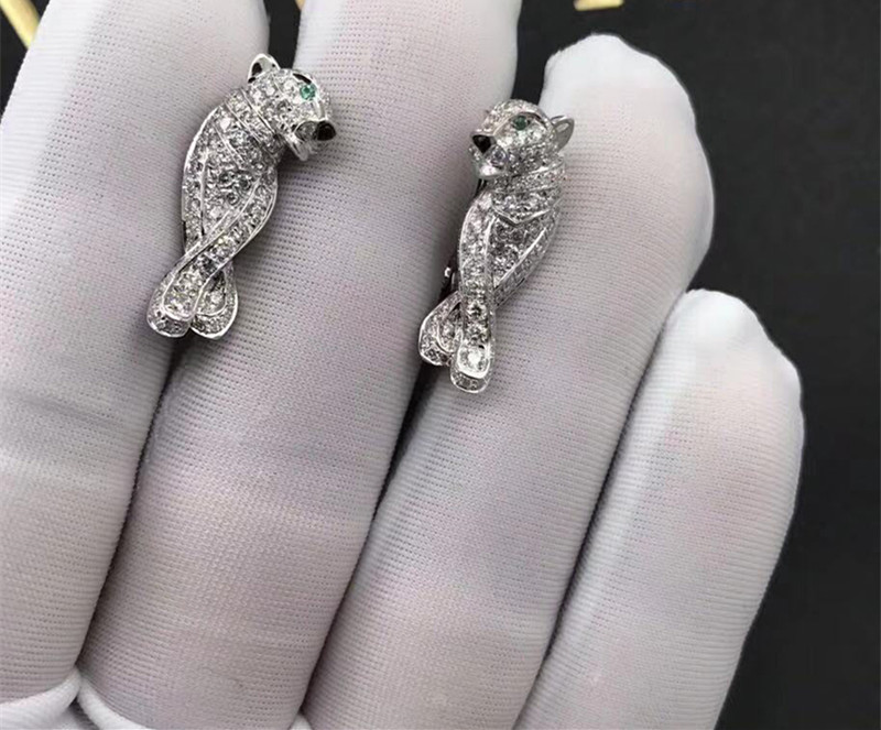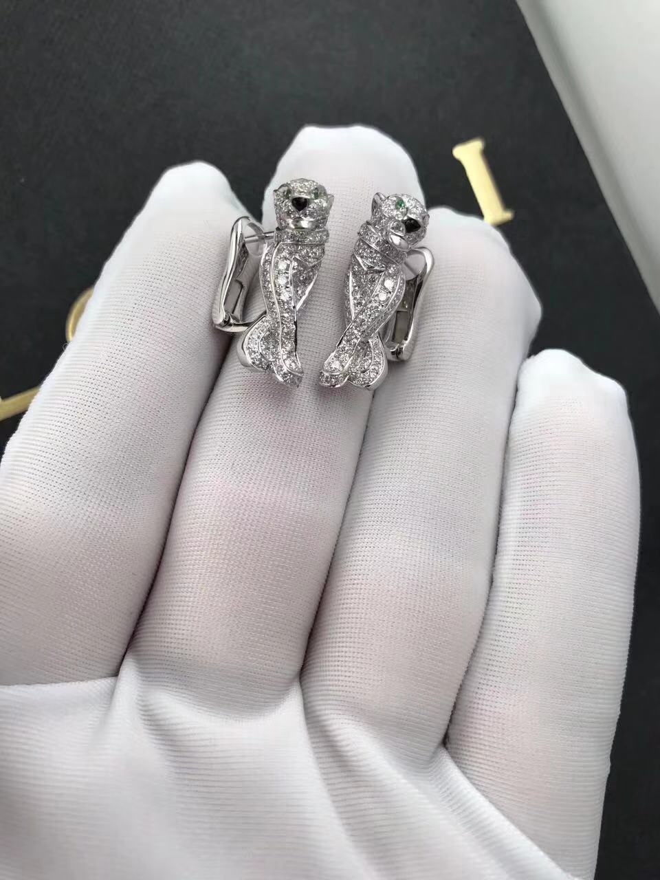 أقراط Panthère de Cartier مصنوعة من الذهب الأبيض عيار 18 قيراطًا(18.5ز), ورنيش أسود,الزمرد,وكل مجموعة مع 117 الماس قطع بريانت مجموع 0.66 قيراط: 22 ارتفاع مم * 10 عرض مم.
