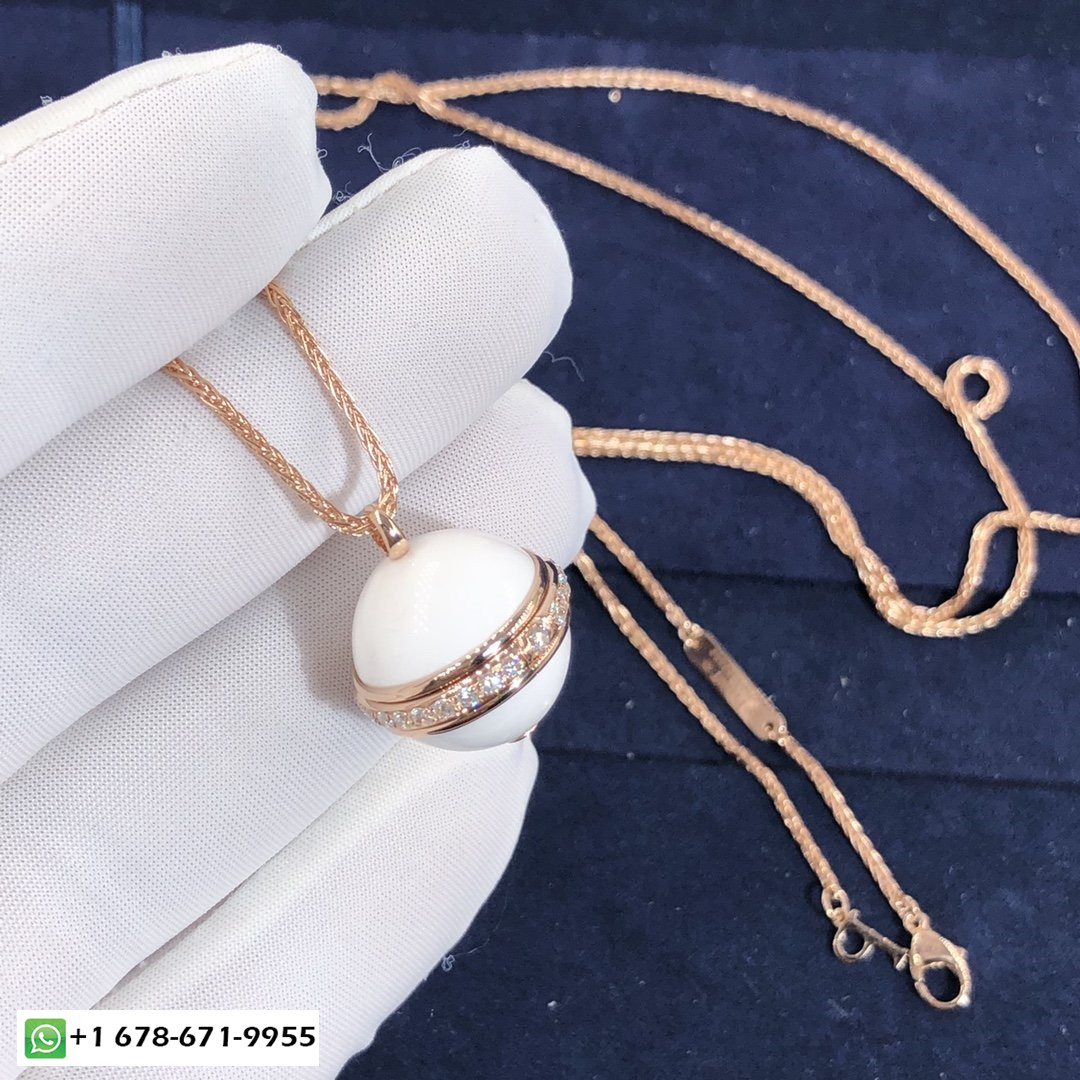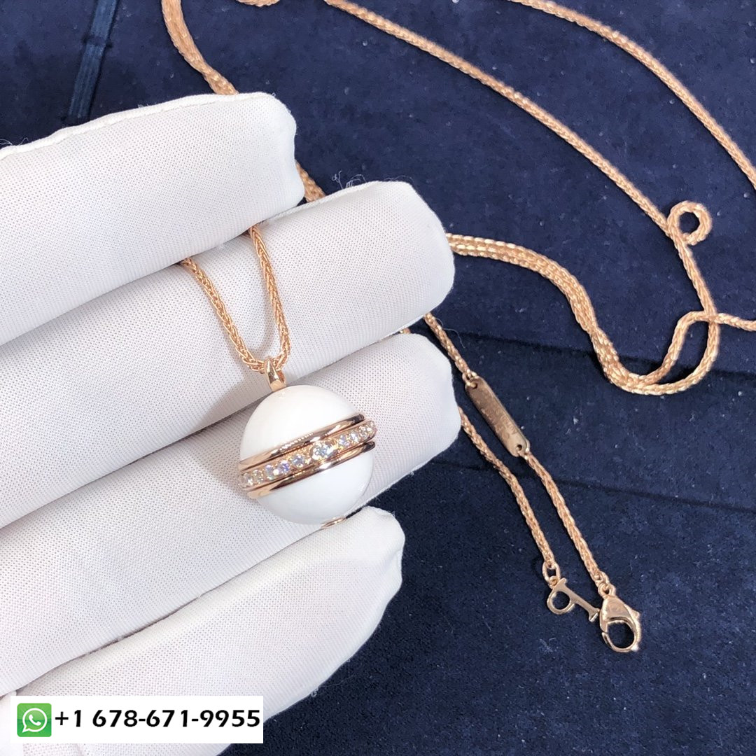 عقد تعليقة بياجيه من الذهب الوردي عيار 18 قيراط مرصع بالألماس ومزين بالماس 2 العقيق الأبيض كبوشن