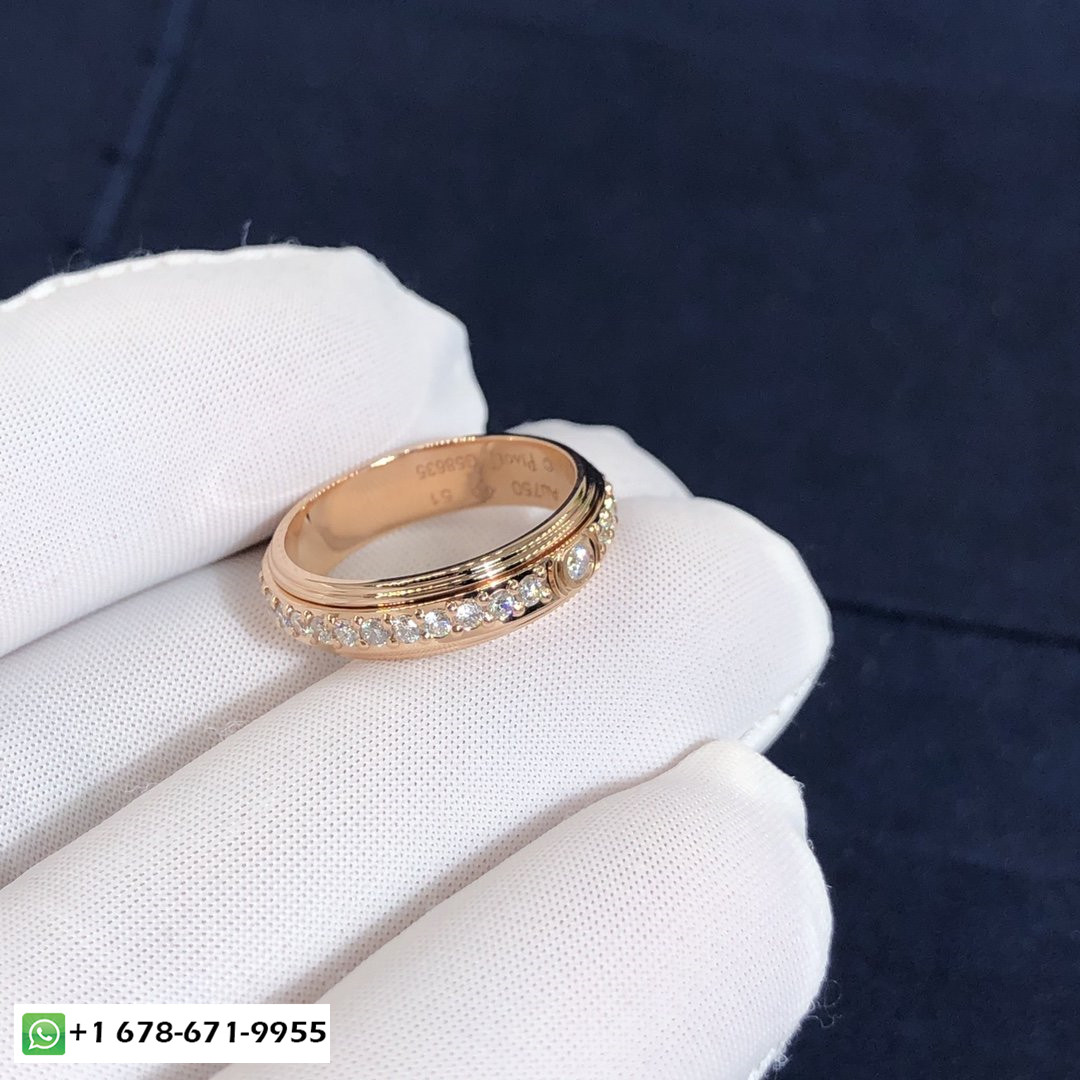 خاتم بوسيشن من الذهب الوردي مرصع بالماس قطع بريانت. رفيق رائع حول الإصبع من الذهب الوردي, تعتبر حلقة التدوير الماسية Possession من إبداع المجوهرات المتميز بحركتها الديناميكية الدوارة. الحزام المركزي من الخاتم المصنوع من الذهب الوردي مرصوف بالكامل بألماس بقطع بريانت تدور بحرية مع بريق أنيق. مع كل منعطف, يفتح الخاتم الفاخر الآسر وفرة من الطاقة الإيجابية.