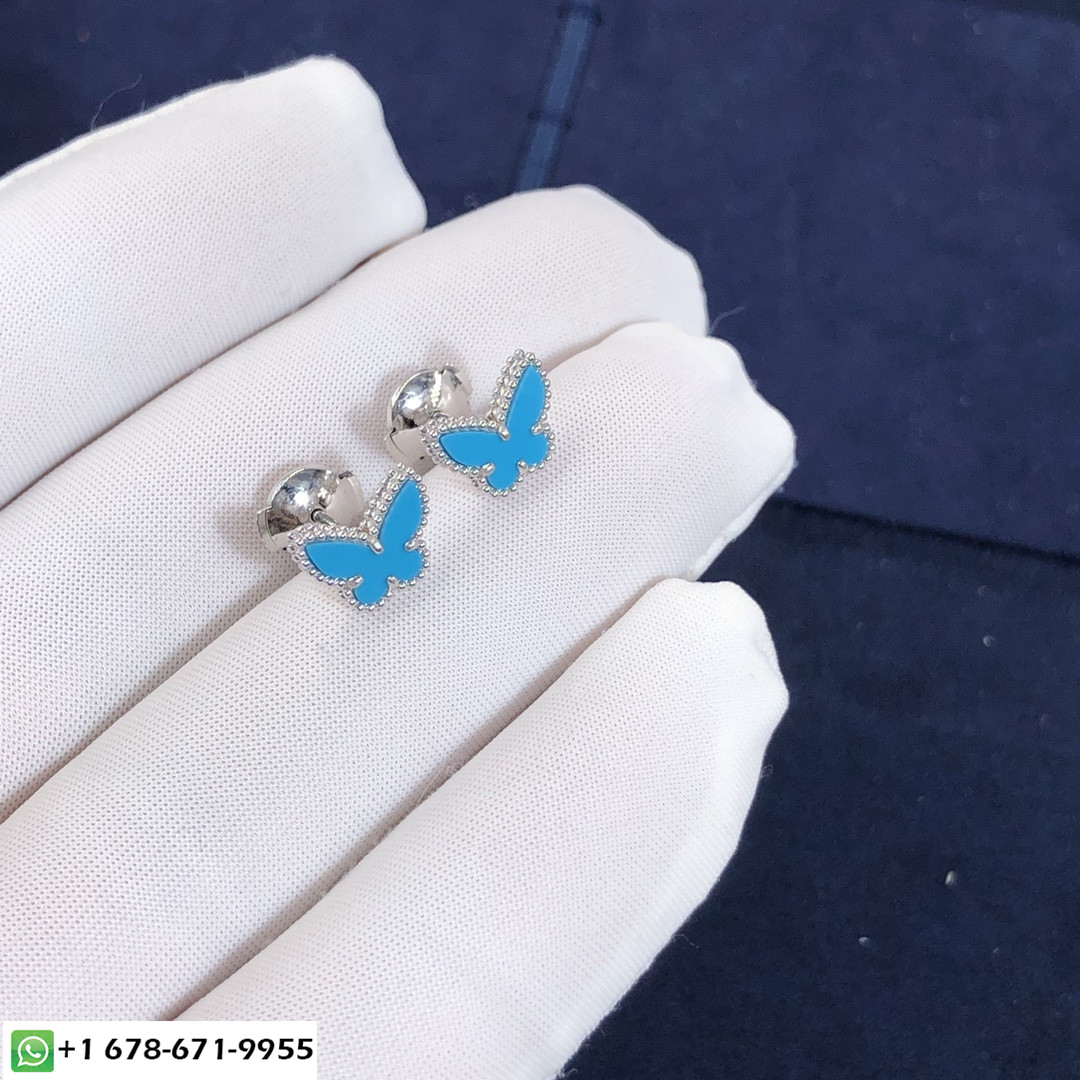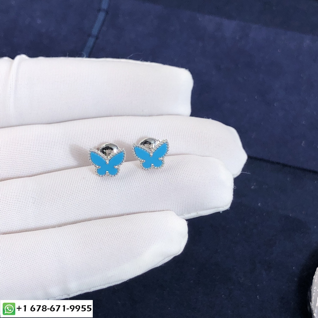 من الكليف & سماعات آربلز سويت ألامبرا فراشة مصنوعة خصيصا من الذهب الأبيض عيار 18 قيراط والفيروز سماعات الأذن VCA الفراشة متوفرة أيضًا بالذهب الأصفر عيار 18 قيراطًا والذهب الوردي عيار 18 عند الطلب.