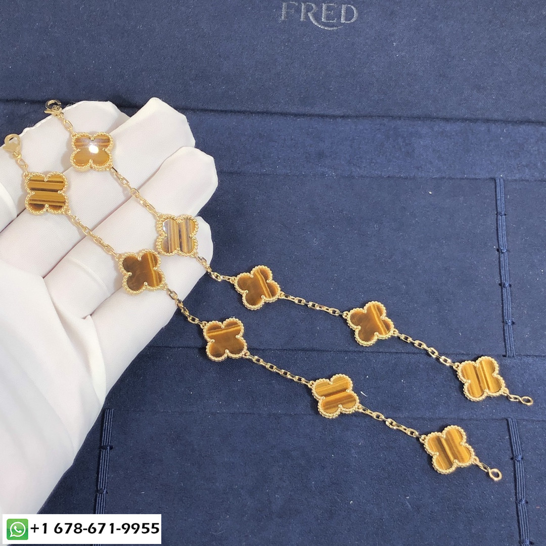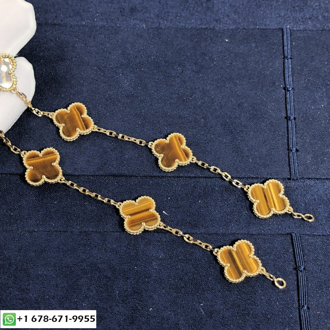 مصنوع بطريقة مخصصة فان كليف & آربلز خمر قصر الحمراء 5 سوار بزخارف من الذهب الأصفر عيار 18 قيراطًا عليه عين النمر. مقاس المعصم هو 7.09 بوصات,وحجم الزخرفة 15 مم * 15مم.يتوفر سوار Alhambra العتيق VCA هذا أيضًا من الذهب الوردي عيار 18 قيراطًا والذهب الأبيض عيار 18 قيراطًا عند الطلب. 1968, إبداعات Vintage Alhambra من تصميم فان كليف & تتميز Arpels بفريدها, أناقة خالدة. مستوحى من أوراق البرسيم, أيقونات الحظ هذه مزينة بإطار من الخرز الذهبي.
