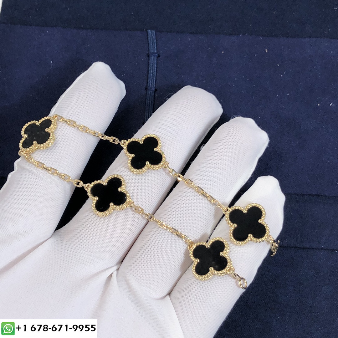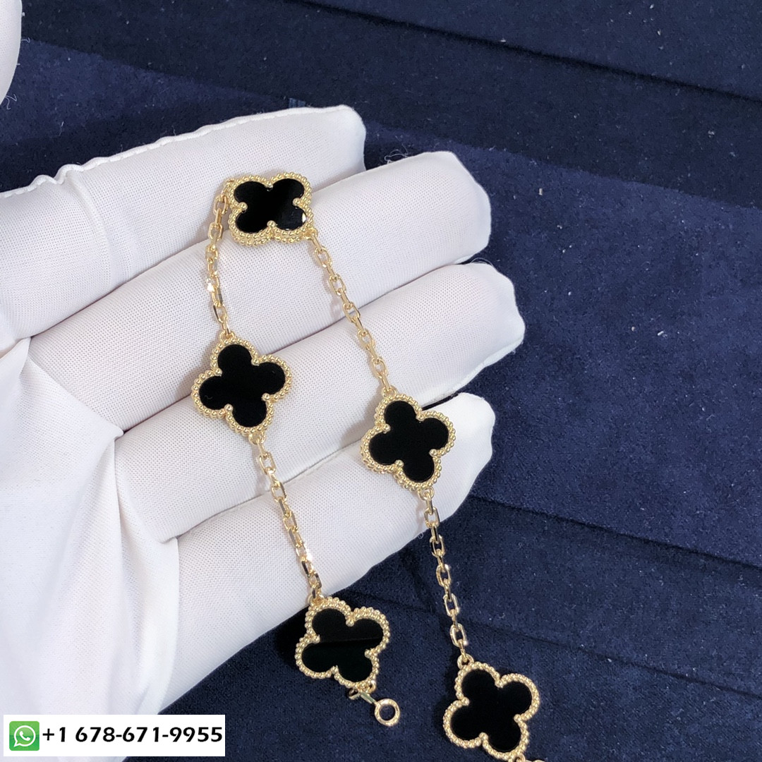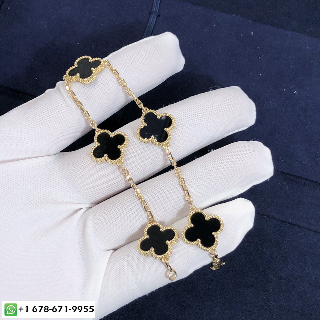فان كليف حسب الطلب & أربيلز خمر قصر الحمراء 5 سوار بزخارف من الذهب الأصفر عيار 18 قيراطًا مع أونيكس. وزن الذهب:9~ 10 جرام حجم المعصم هو 7.09 بوصات,وحجم الزخرفة 15 مم * 15مم وفية لأول جوهرة Alhambra® التي تم إنشاؤها في 1968, إبداعات Vintage Alhambra من تصميم فان كليف & تتميز Arpels بفريدها, أناقة خالدة. مستوحى من أوراق البرسيم, أيقونات الحظ هذه مزينة بإطار من الخرز الذهبي.