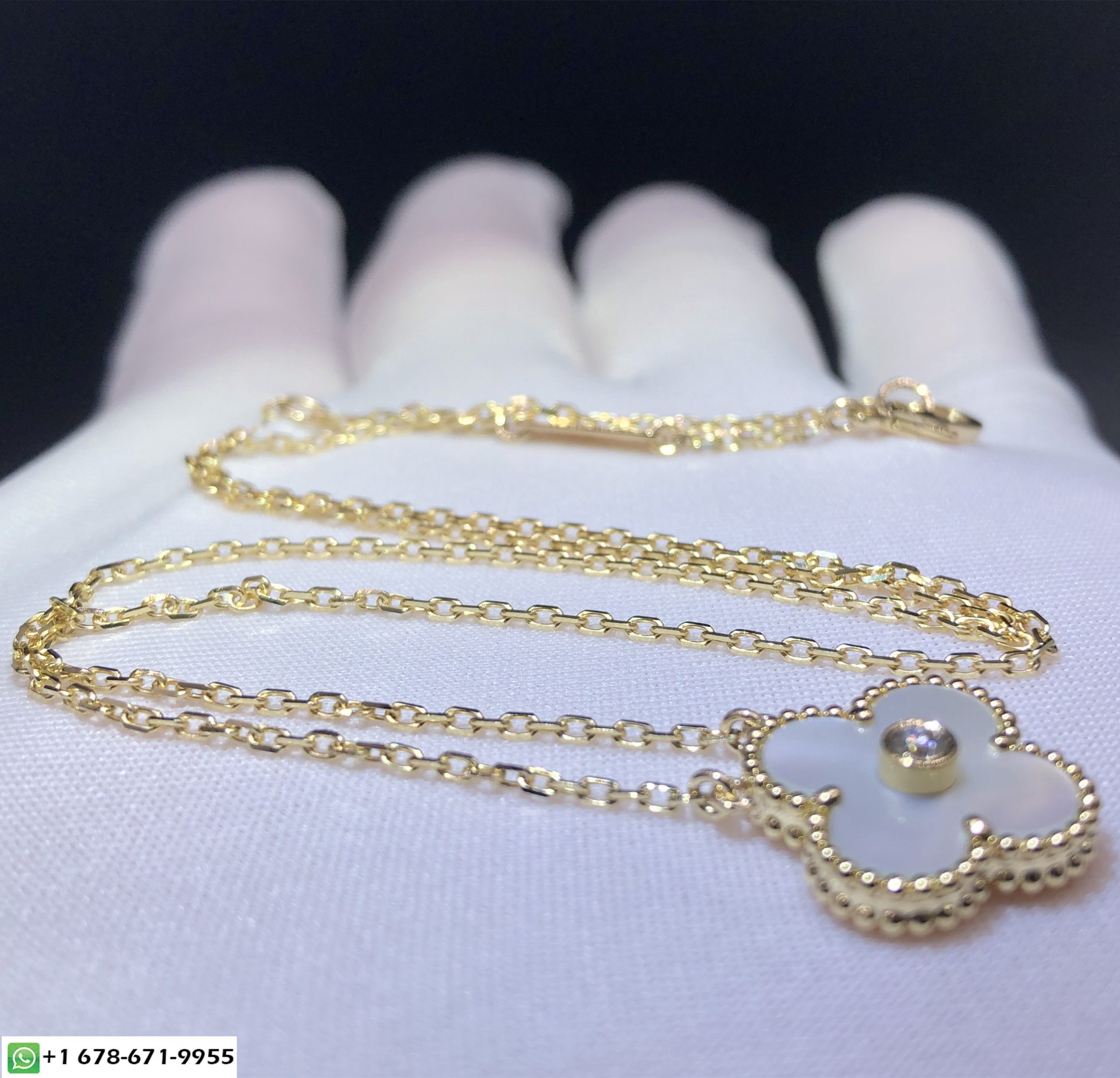 من الكليف & عقد Arpels Vintage Alhambra مصنوع من الذهب الأصفر عيار 18 قيراطًا ومرصع بعرق اللؤلؤ وماسة في الوسط ، كما يتوفر عقد VCA Vintage Alhambra المصنوع من الذهب الوردي عيار 18 قيراطًا والذهب الأبيض عيار 18 قيراطًا عند الطلب.