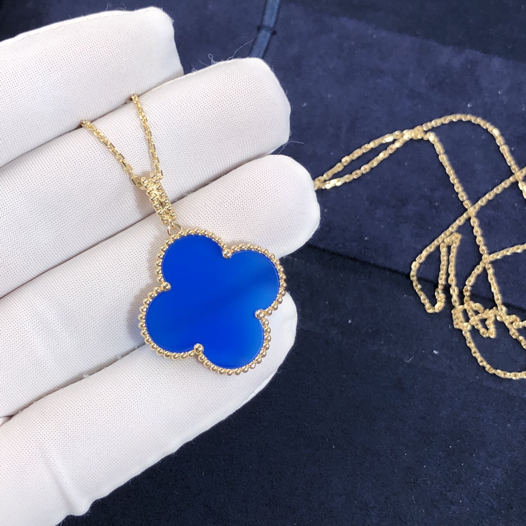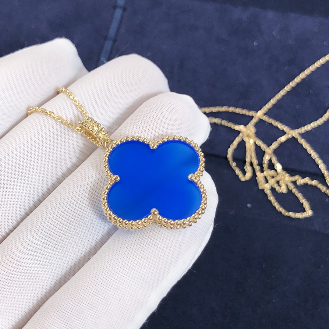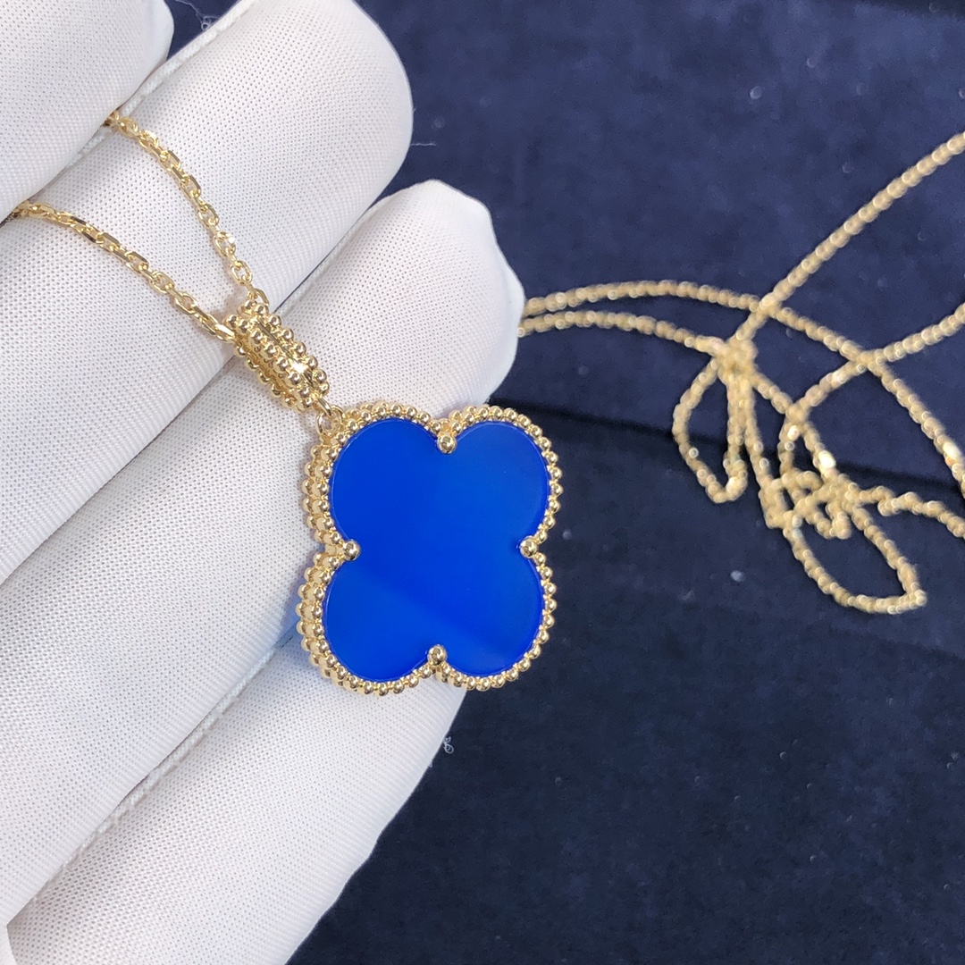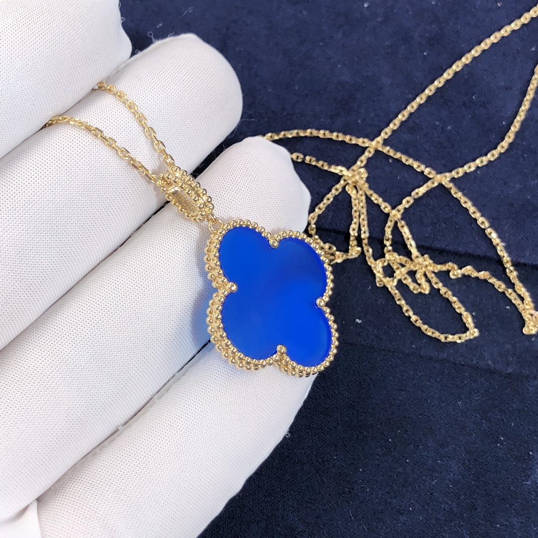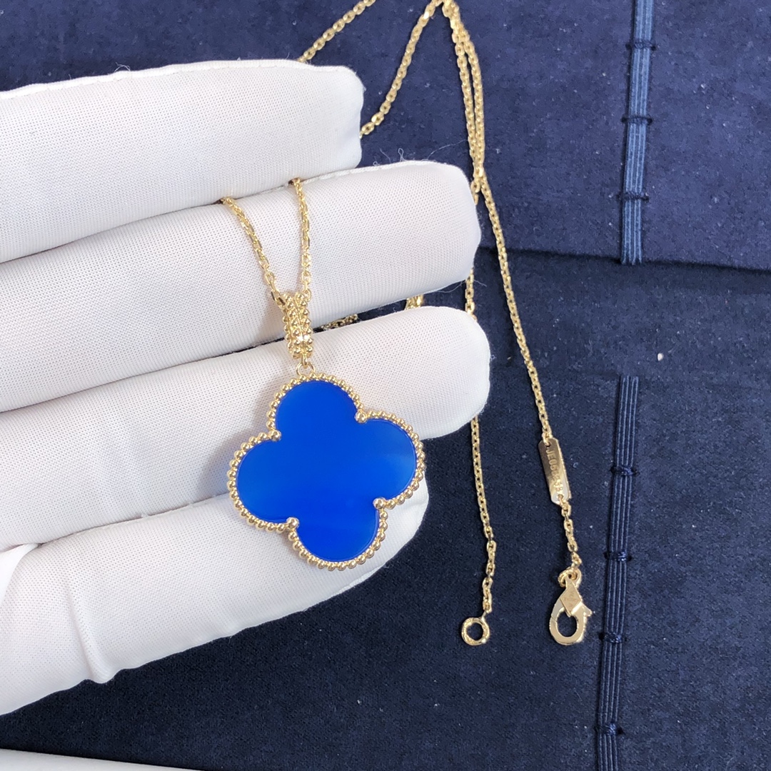 ماجيك ألامبرا VCA 1 عزر قلادة مخصصة مصنوع من الذهب الأصفر عيار 18 قيراط مرصع بالعقيق الأزرق وزن ذهبي 11 جرام طول السلسلة:90 سم هذا فان كليف & قلادة أربلز متوفر أيضًا بالذهب الوردي عيار 18 قيراطًا والذهب الأبيض عيار 18 عند الطلب 2006 بواسطة فان كليف & آربلز, تجمع إبداعات مجوهرات Magic Alhambra® أشكال مختلفة من Alhambra, معا في رقصة بهيجة. مستوحى من أوراق البرسيم, تتميز تصميماتها غير المتماثلة بارتباطات مختلفة للمواد.