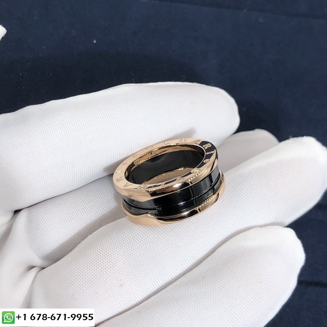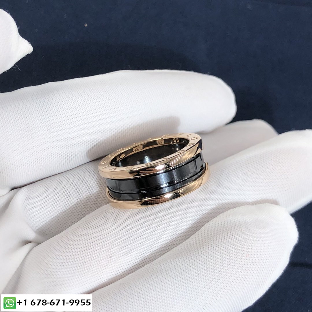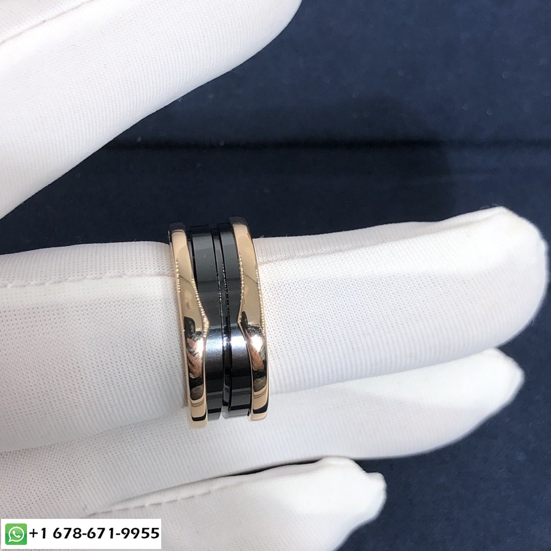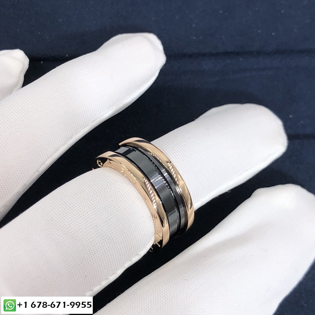 Bague à deux bandes Bulgari B.zero1 avec deux 18 des boucles en or rose kt et une spirale en céramique noire s'inspirant de l'amphithéâtre le plus renommé du monde, le Colisée, la bague B.zero1 est une véritable déclaration de la vision créative de Bulgari, remettre en question l'essence même du design de bijoux. La pureté de sa spirale distinctive, est une métaphore de l'harmonie du passé, présent et futur – reflétée dans la magnificence de la ville éternelle – et l'emblème de l'esprit pionnier de la collection.