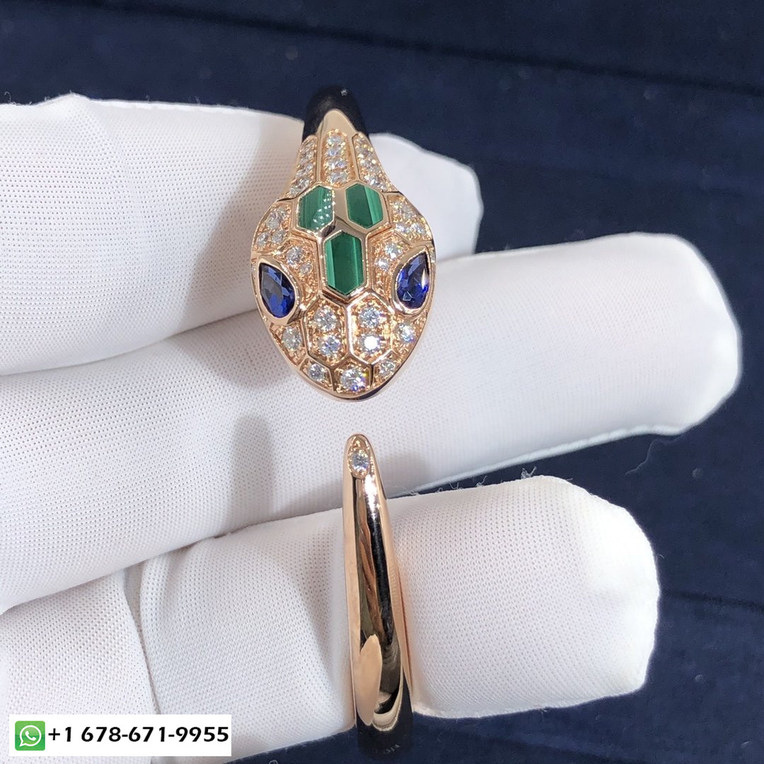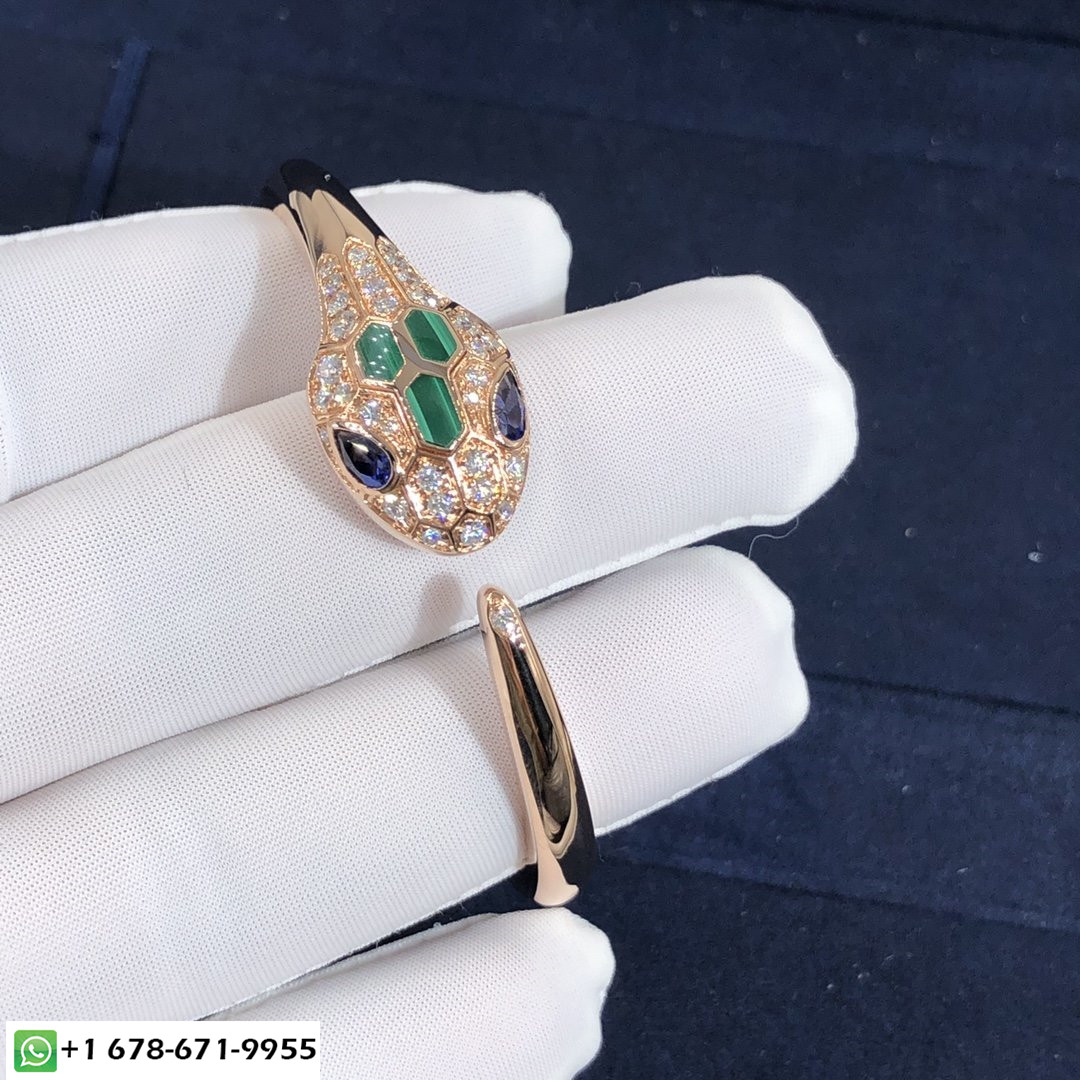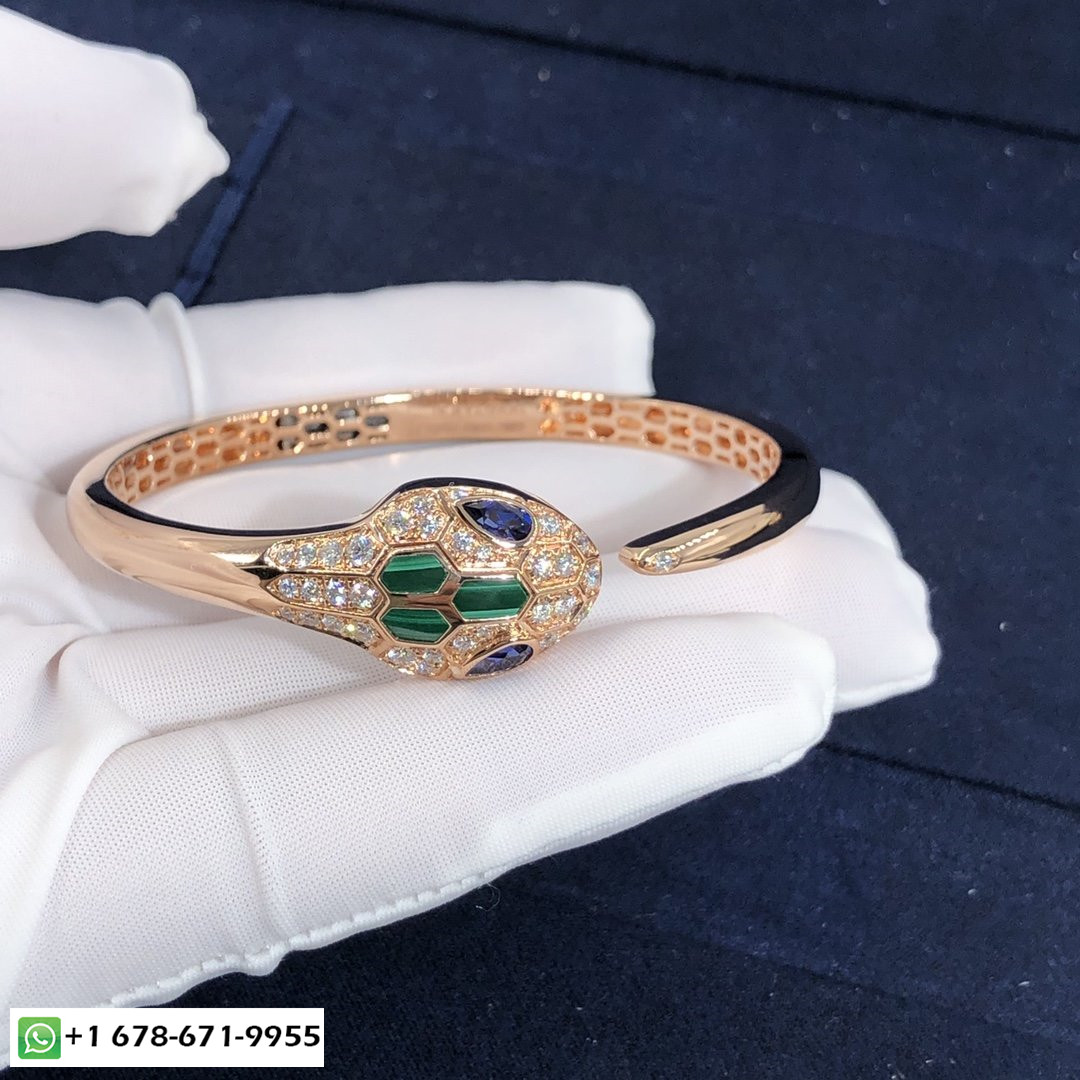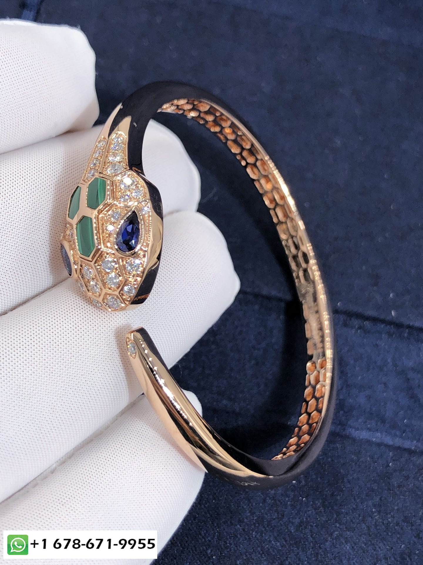 Bracelet Bulgari Serpenti fait sur mesure en or rose 18 carats serti d'yeux saphir bleu, éléments en malachite et diamants pavés totalisant 0.5 ct.