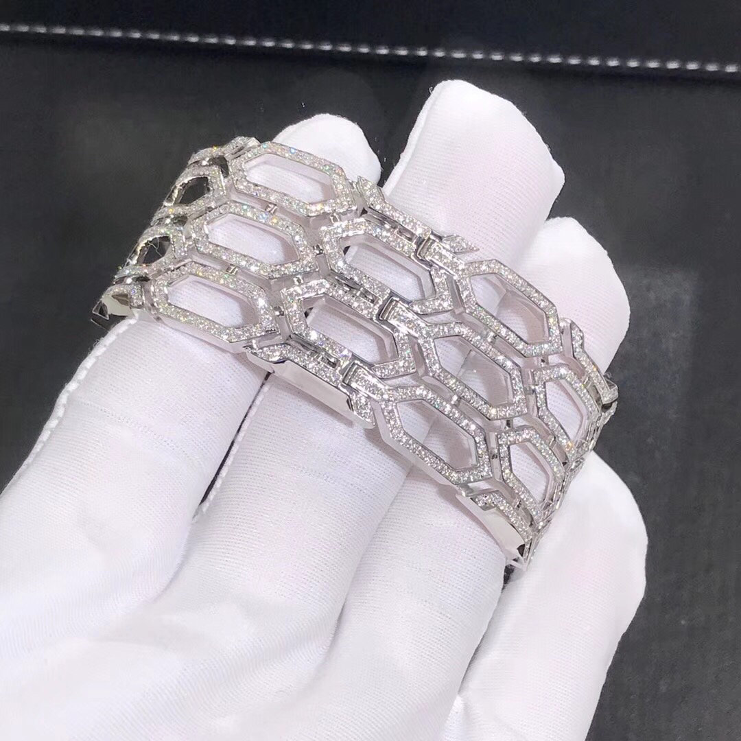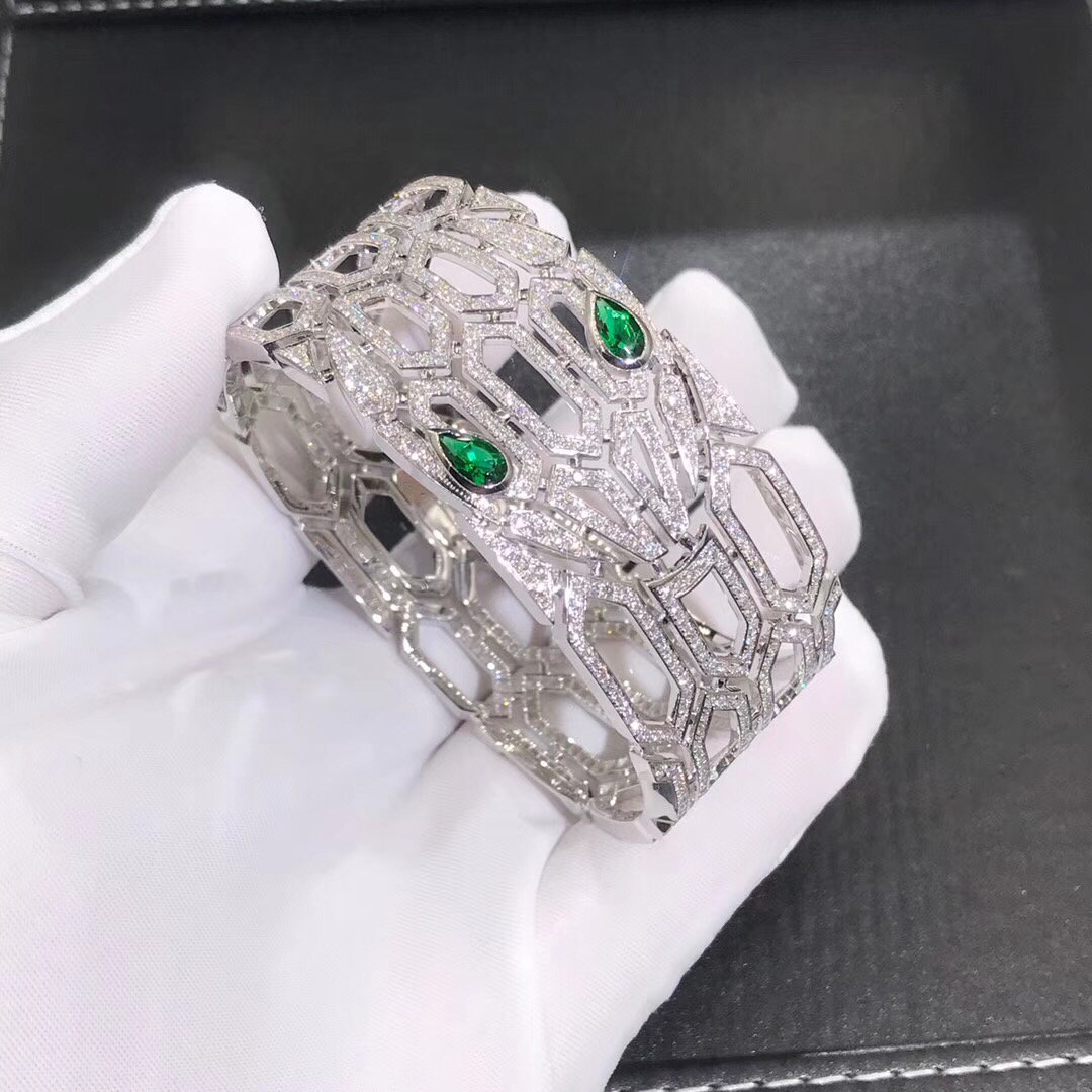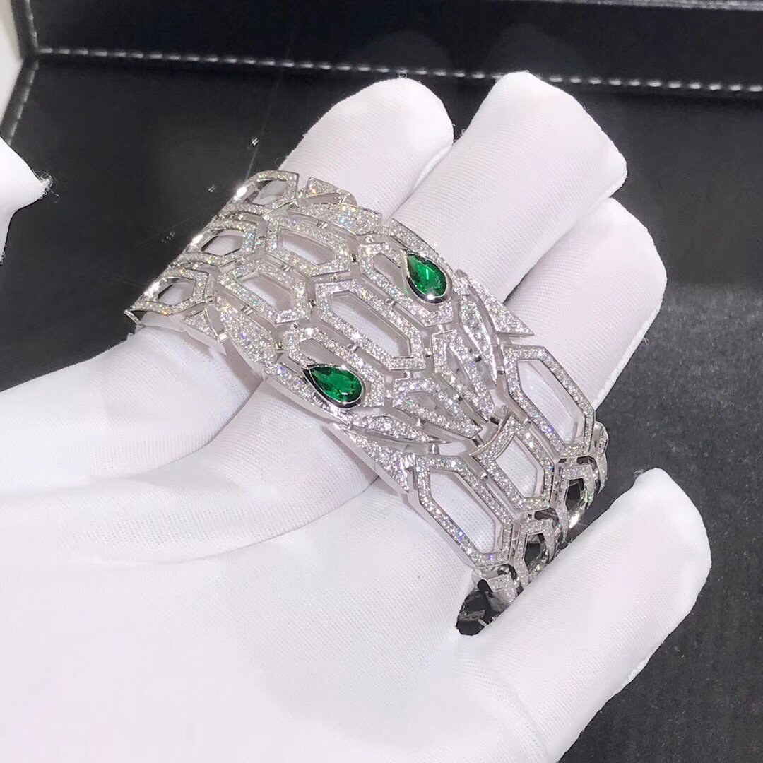 Bracelet serpenti Bulgari sur mesure en or blanc 18 carats,serti d'émeraude et de diamants pavés.Le bracelet Serpenti de Bulgari est une décoration radieuse pour le poignet.Ce bracelet est également disponible en or rose 18 carats.