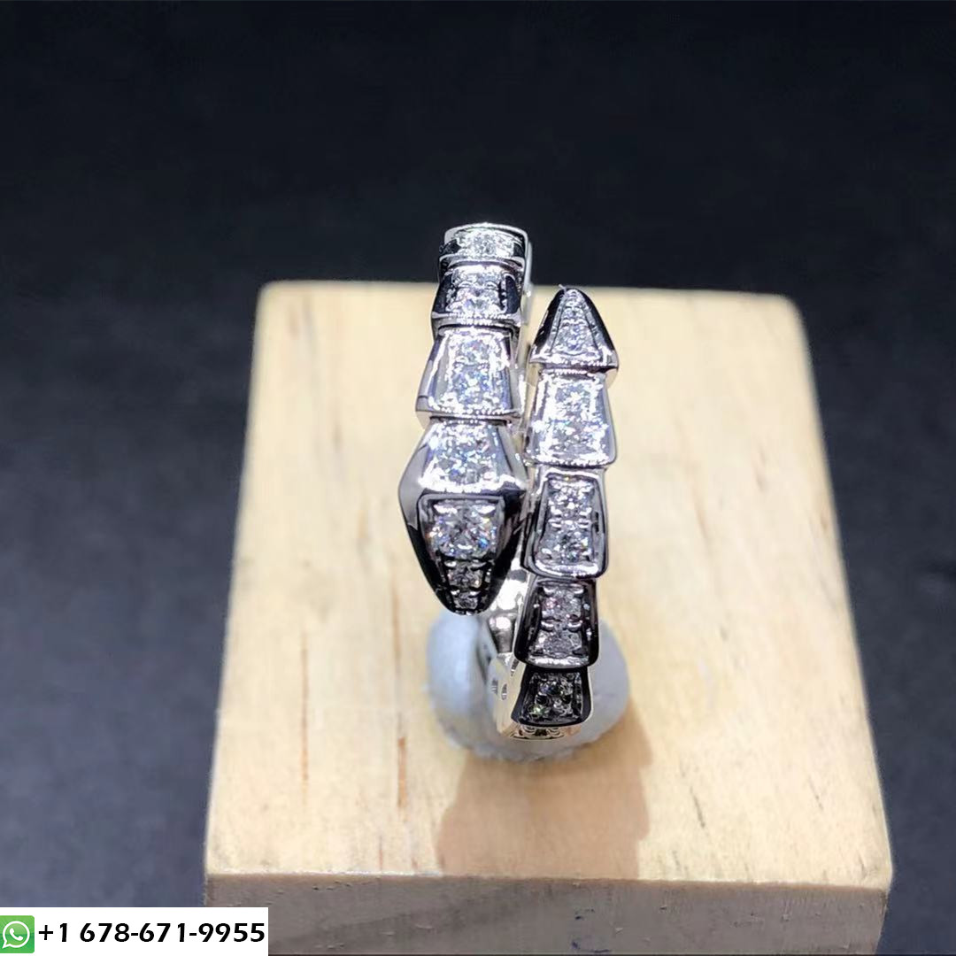 La bague Bulgari Serpenti Viper est en or blanc 18 carats et pavée de diamants ronds taille brillant totalisant 0.6 ct. poids d'or:9~ 10 grammes En hommage à son animal spirituel, Bulgari capture le pouvoir de la séduction dans cette bague Serpenti, camoufler la sensualité et la tentation avec un design hypnotique. Sophistiqué et glamour, ce bijou s'enroule autour du doigt frappant avec la beauté précieuse des écailles et avec la sinuosité distinctive du serpent.