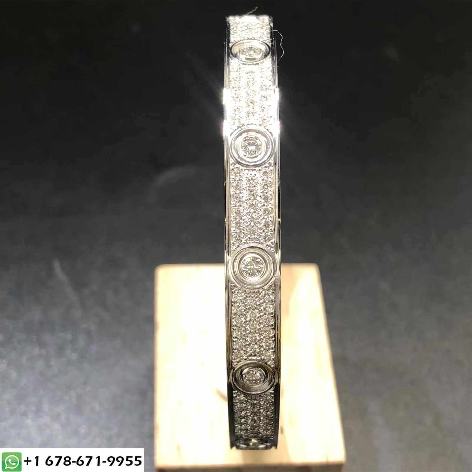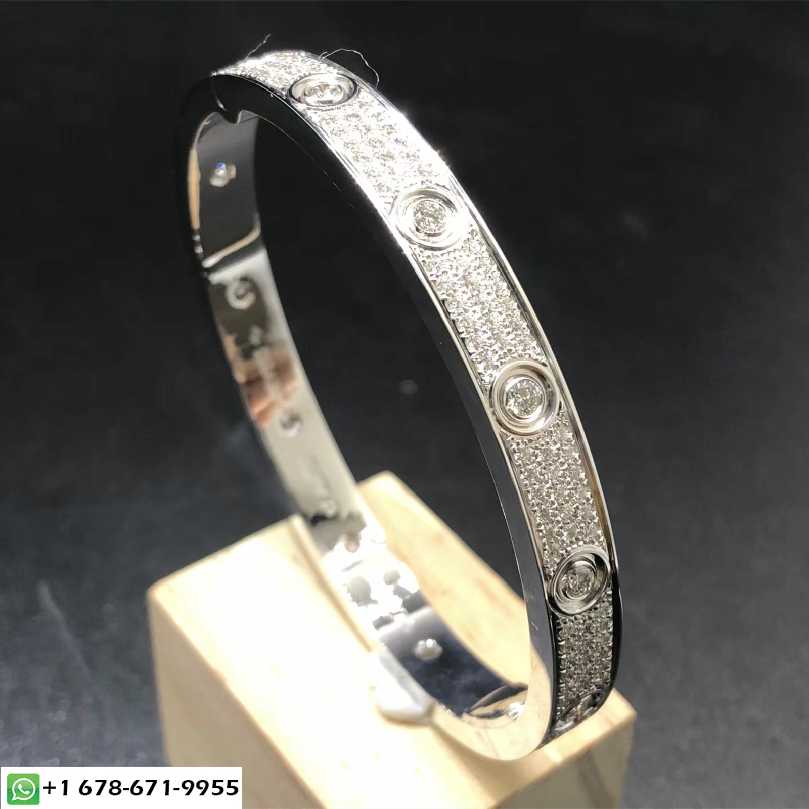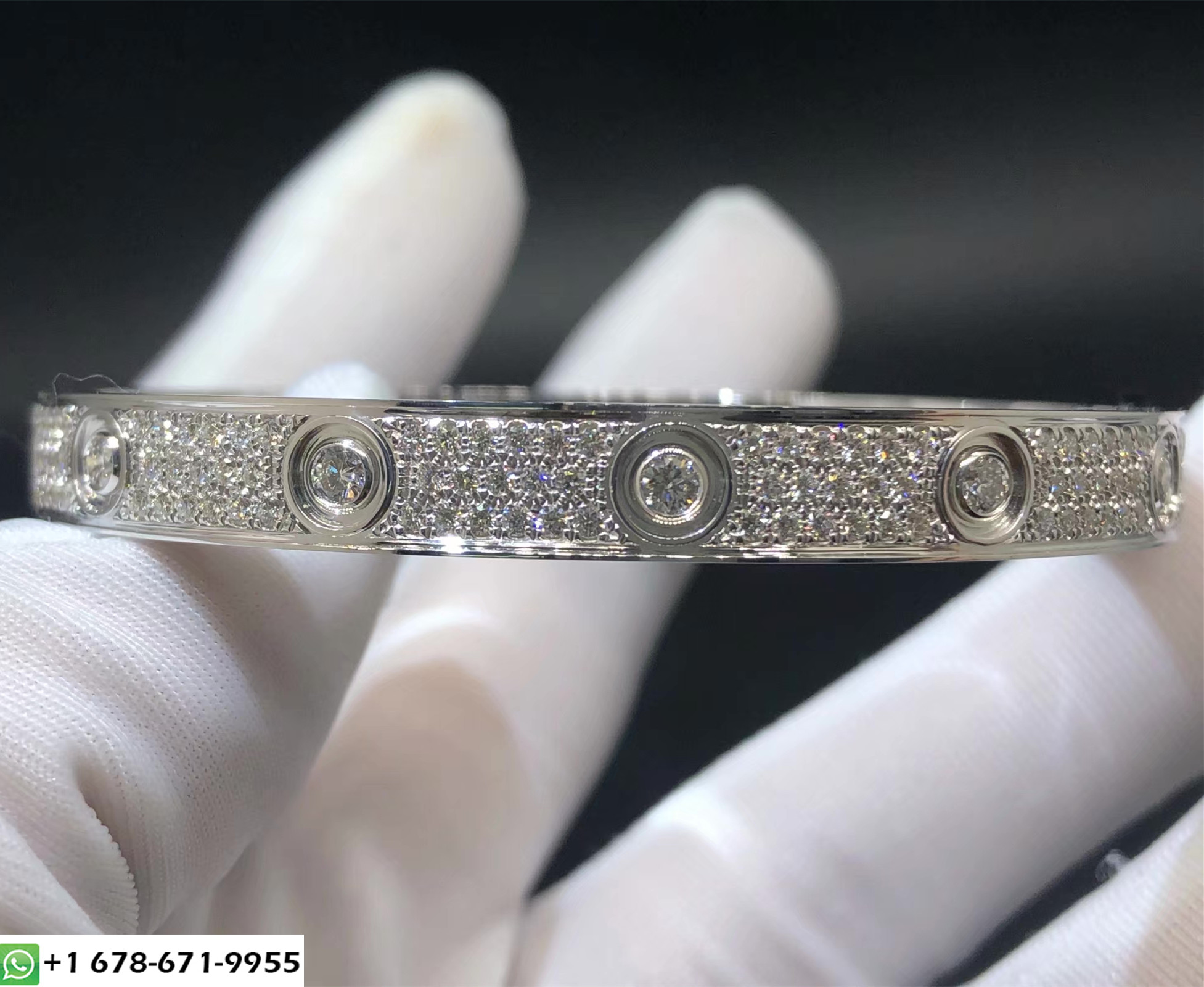 Bracelet love Cartier sur mesure en or blanc massif 18 carats avec diamants pavés.Poids en or 43 ~ 48 grammes(jusqu'à la taille de votre bracelet),Fixé avec 216 diamants taille brillant F VVS1 totalisant 3.62 carats. Largeur: 6.7 mm. bracelet love cartier personnalisé est également disponible en or rose massif 18 carats et en or jaune 18 carats sur demande.