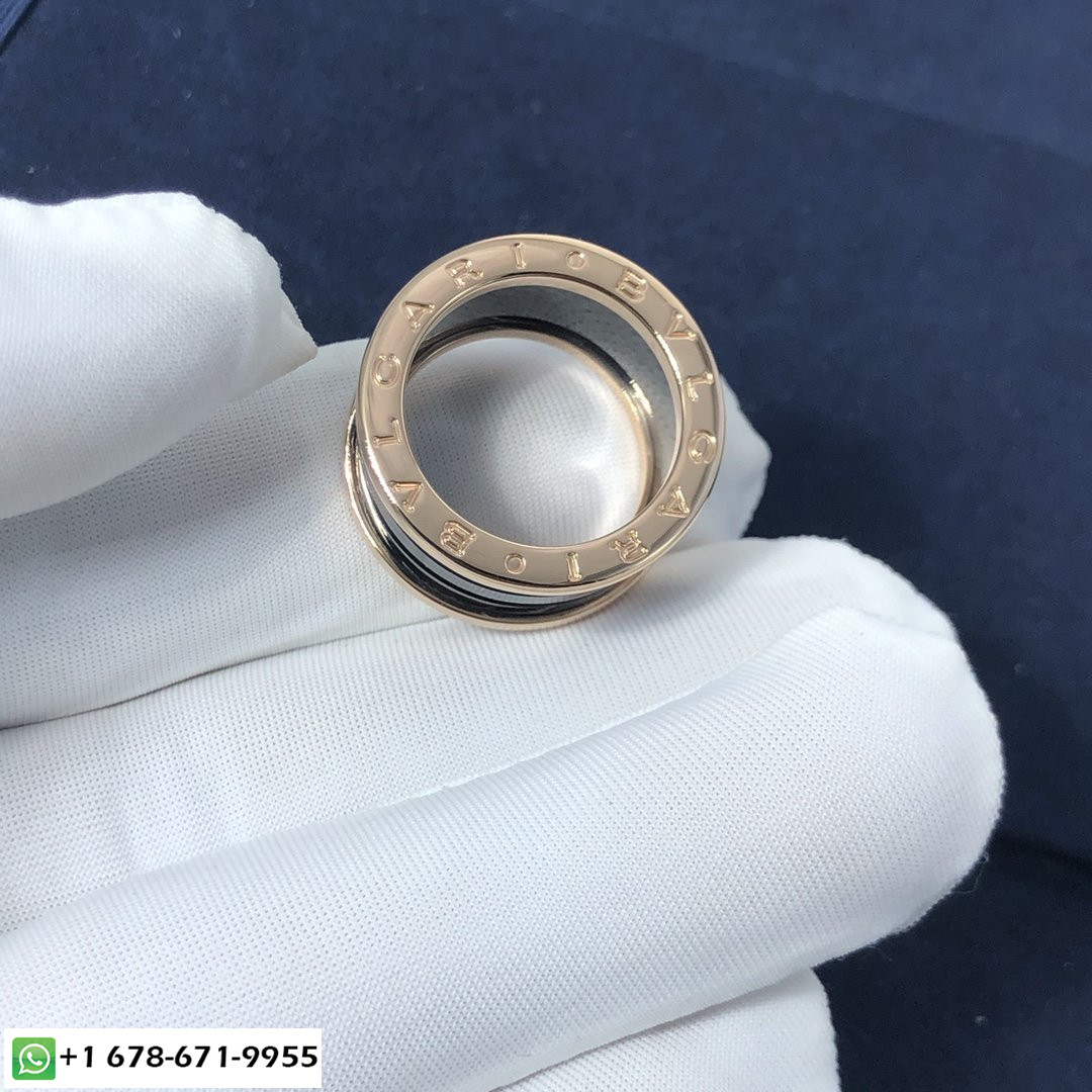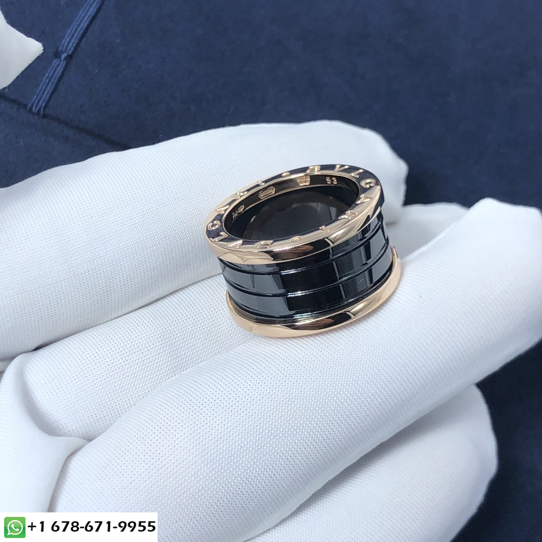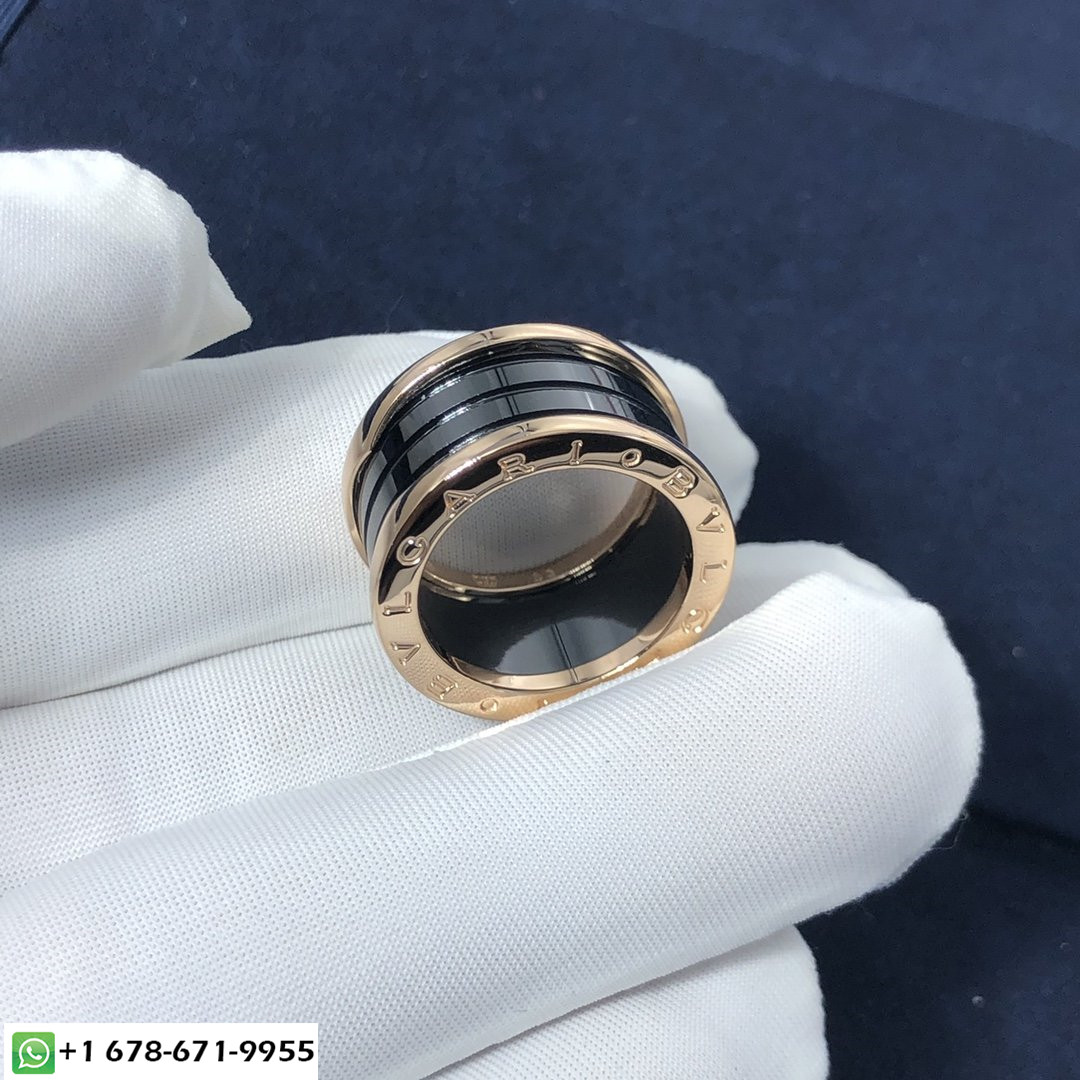 La bague Bulgari b.zero1 est en or rose 18 carats et céramique noire,il a un style plutôt moderne de 4 bandes, dont deux en or rose 18 carats et les deux autres en céramique noire, son poids de 11,5 g et sa largeur de bande: 11mm.