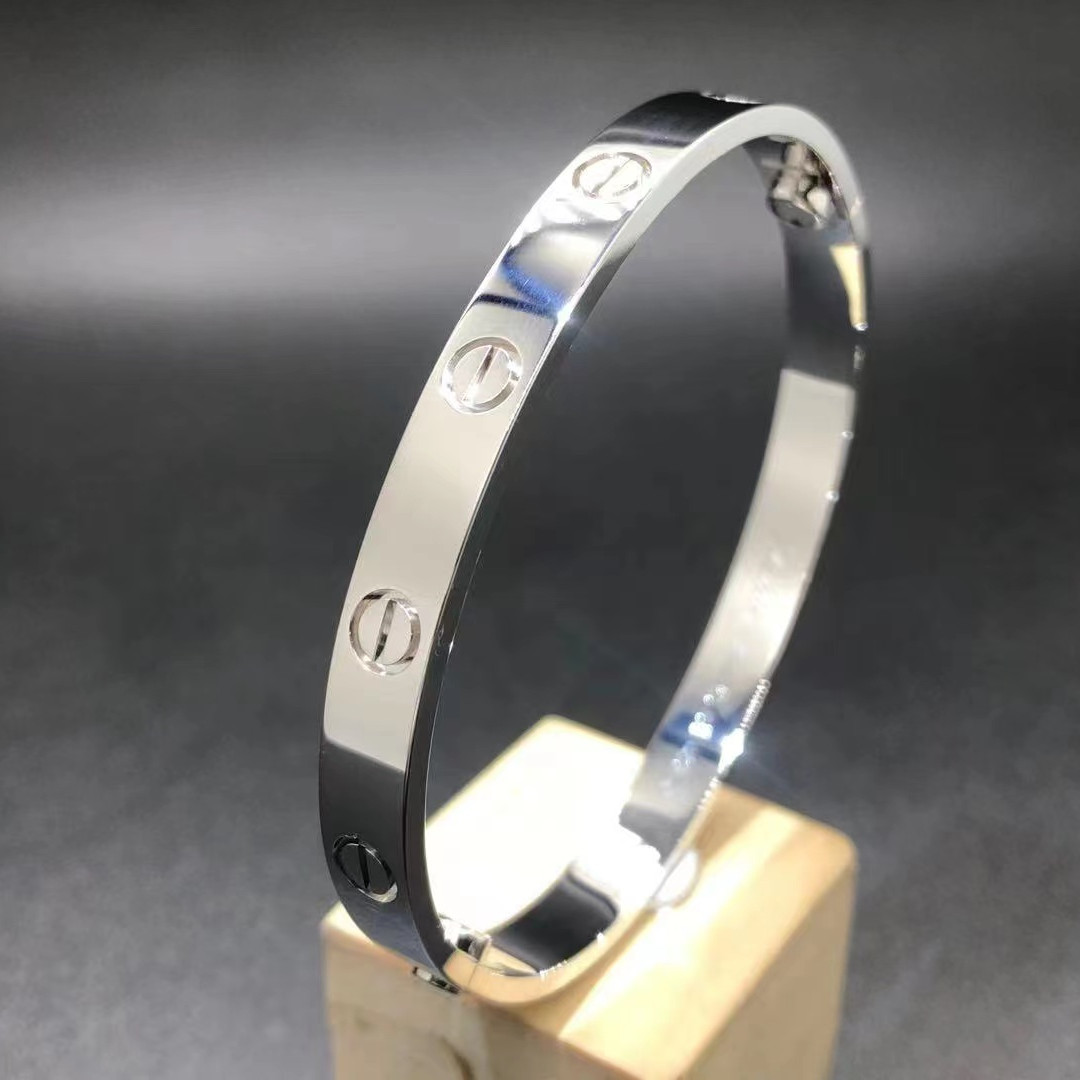 Bracelet love Cartier sur mesure en or blanc massif 18 carats, poids en or 27 ~ 39 grammes(jusqu'à la taille de votre bracelet),largeur 6,1 mm. bracelet love cartier est également disponible en or jaune massif 18 carats et en or rose 18 carats sur demande.