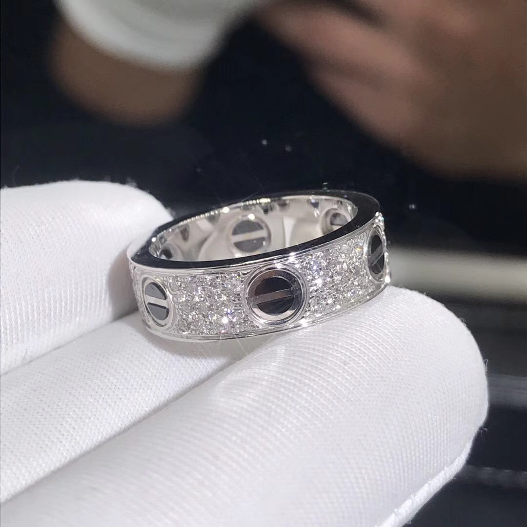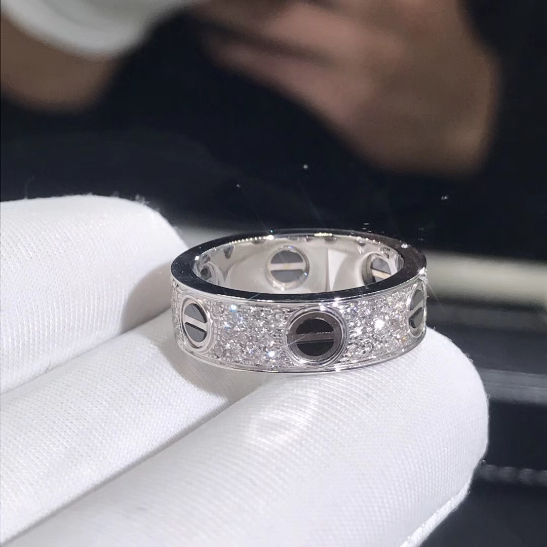 Bague love Cartier est en or blanc 18 carats,céramique noire,et sertie de 66 morceaux de diamants taille brillant totalisant 0.74 La bague love cartier est également disponible en or rose 18 carats et or jaune 18 carats sur demande.