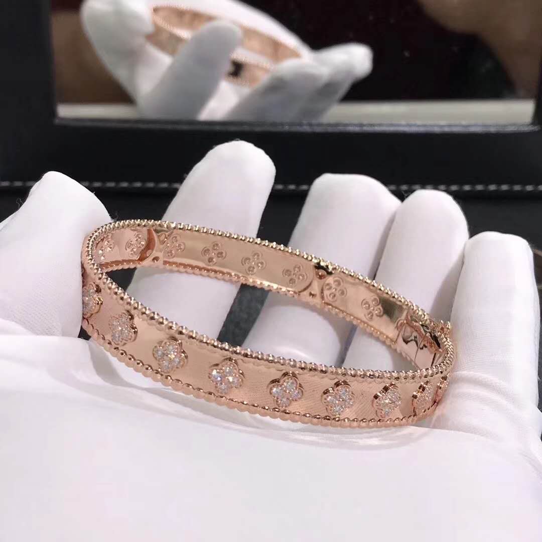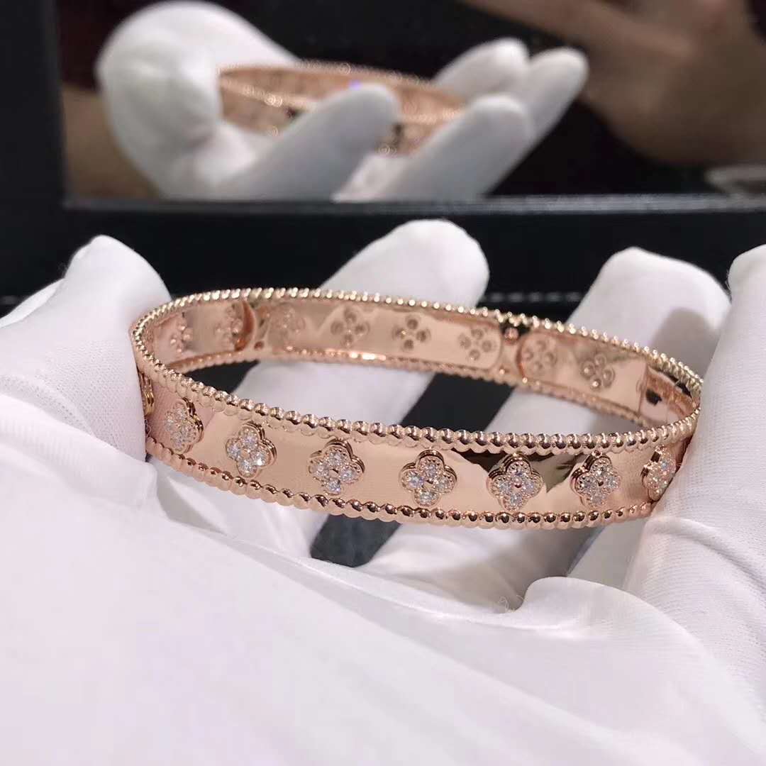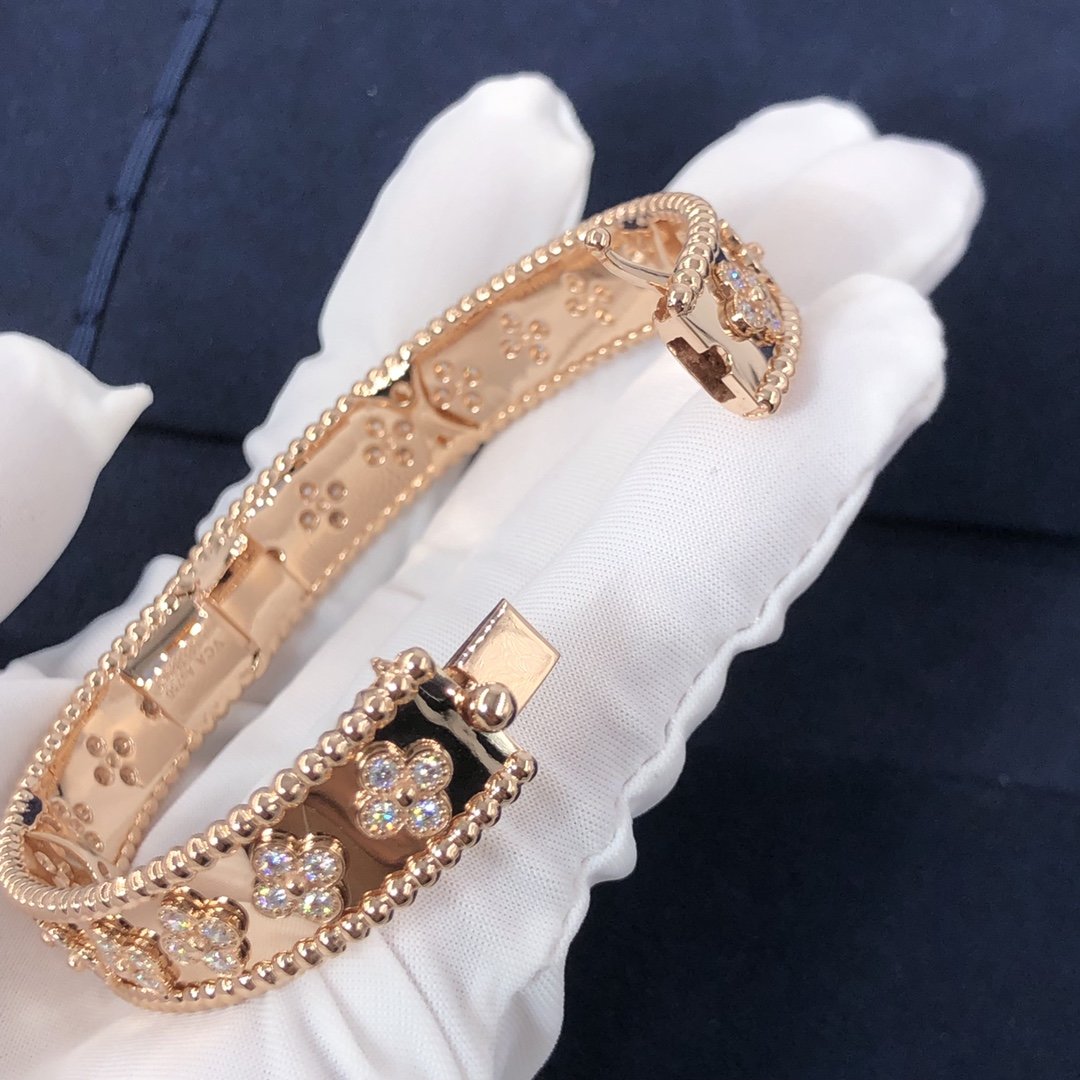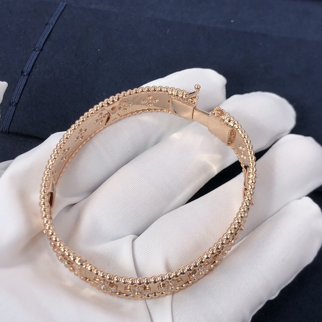 De cleef & Le bracelet arpels perlée trèfles est en or rose 18 carats et diamants. Les créations de la collection perlée trèfles sont ornées de précieux motifs de trèfles - van cleef & symbole de chance d'arpels. Ce bracelet VCA perlee est également disponible en or jaune 18 carats et en or blanc 18 carats sur demande.