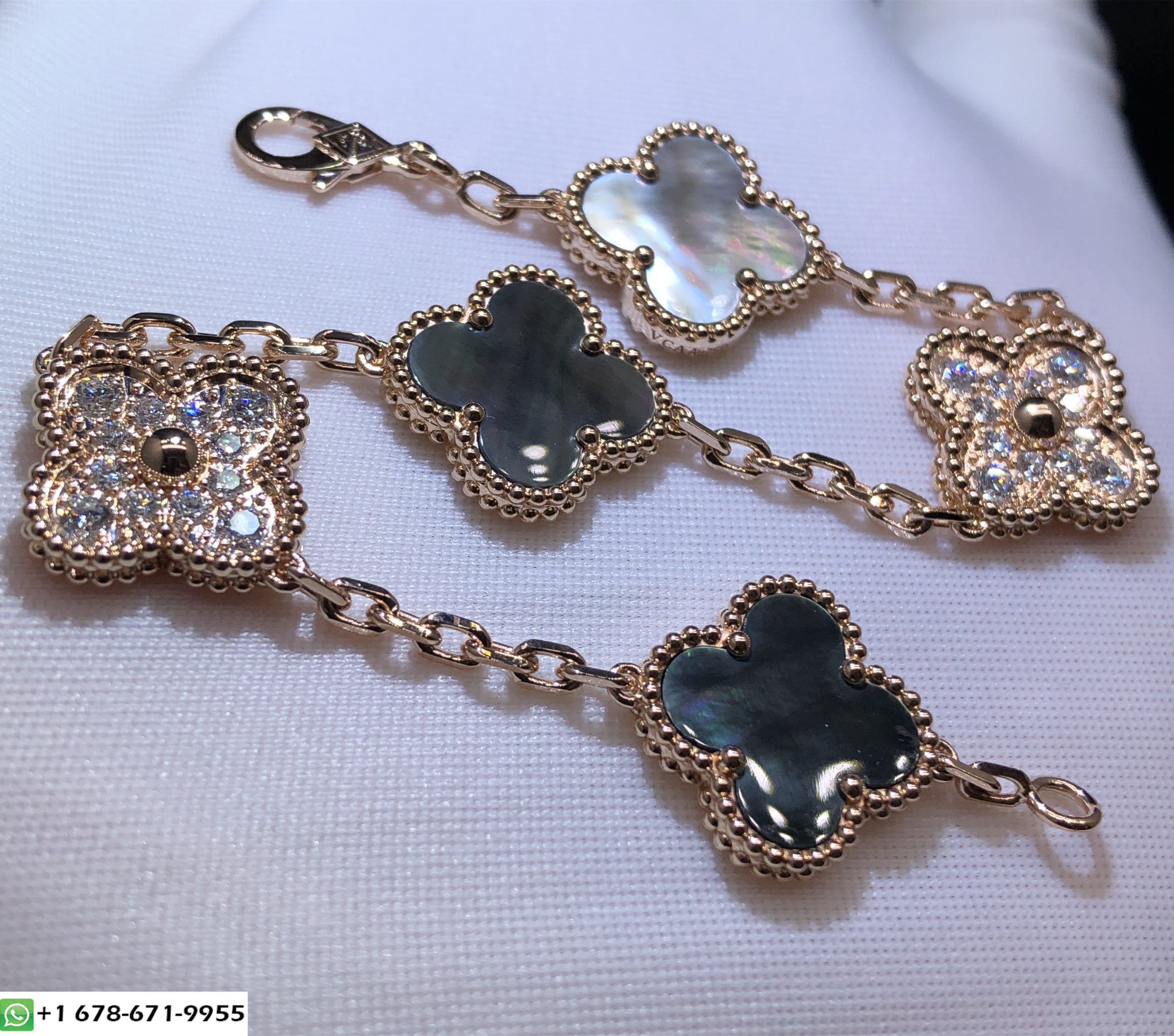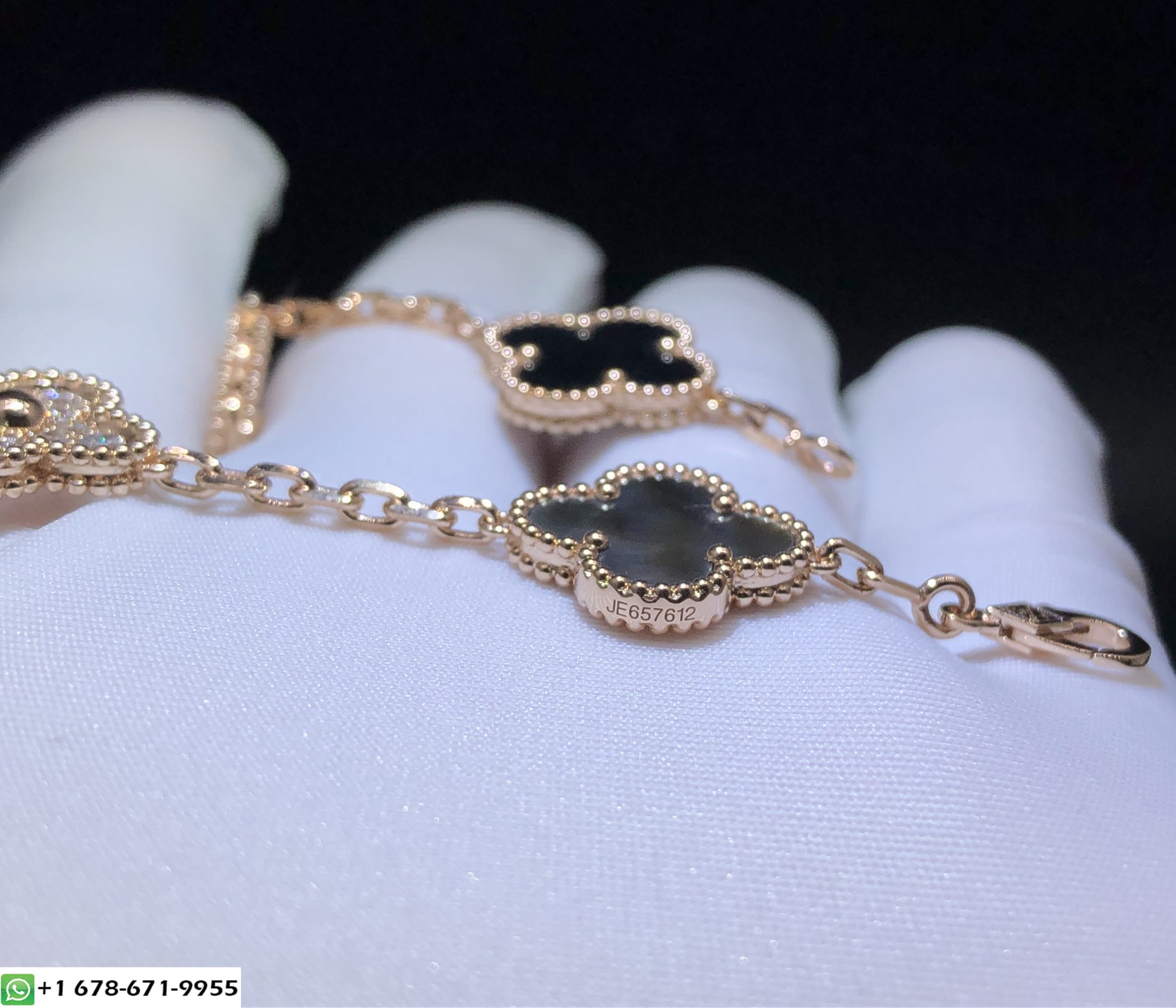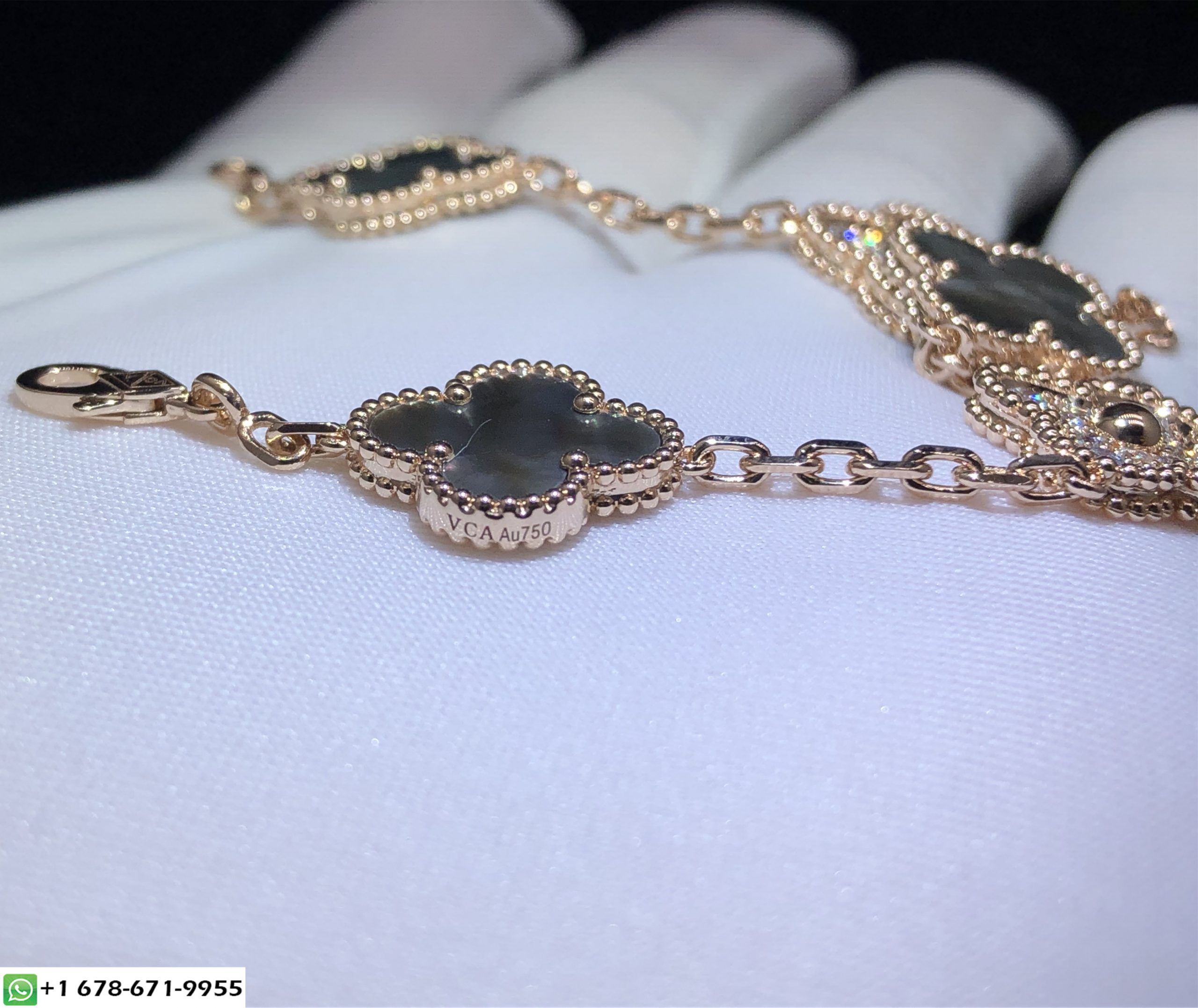 Van Cleef & Bracelet Arpels Vintage Alhambra Personnalisé fait en or rose 18 carats,nacre grise et 24 diamants ronds totalisant 0.97 carats,5 motifs.Taille du poignet du bracelet: 7.48 Fidèle au tout premier bijou Alhambra® créé en 1968, les créations Vintage Alhambra de Van Cleef & Les arpels se distinguent par leur, élégance intemporelle. Inspiré de la feuille de trèfle, ces icônes de chance sont ornées d'une bordure de perles dorées.