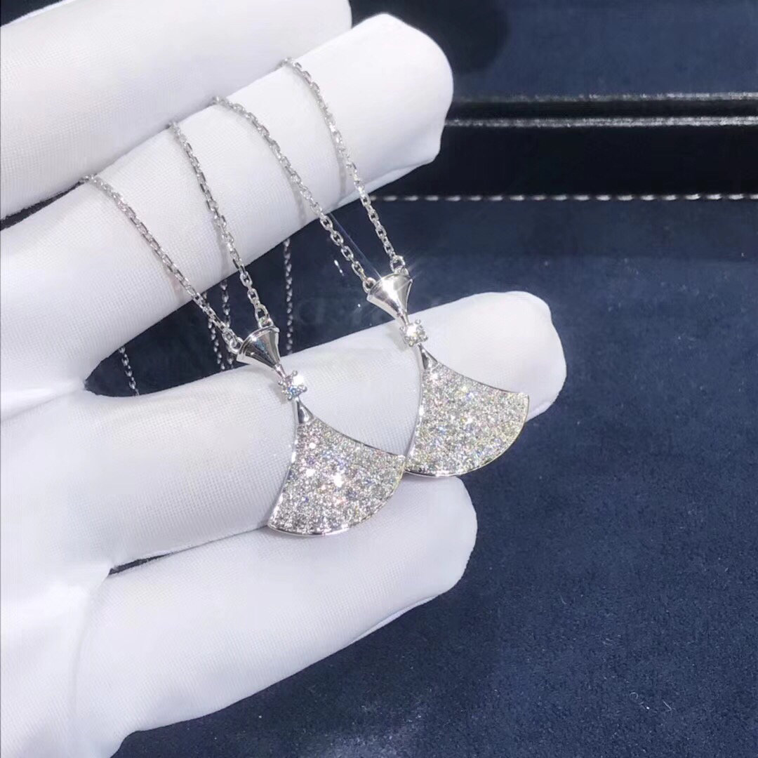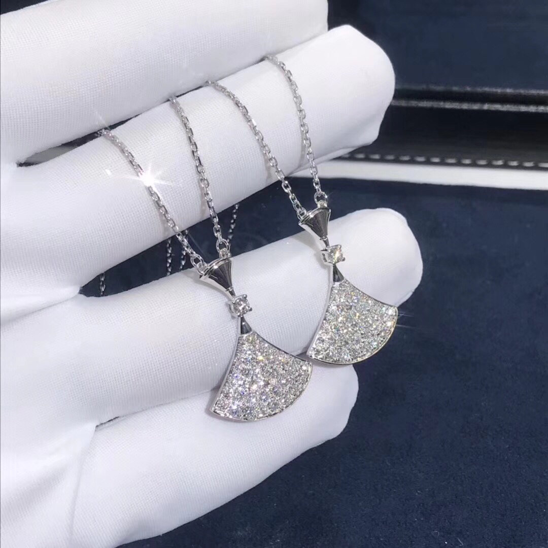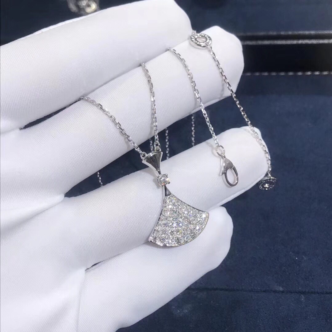 Divas bulgares’ le collier de rêve est en or blanc 18 carats(poids:5.8g),et le pendentif serti d'un diamant et pavé de 47 diamants pour un total de 0,8 ct.