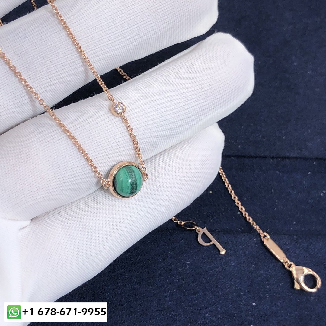 Personnaliser le collier pendentif Possession Piaget en or rose 18 carats serti d'un diamant taille brillant totalisant 0,06 ct et d'une perle de malachite.:3.5 g. longueur du collier:42 cm.Motif taille longueur:7 mm.Motif taille largeur:7 mm.