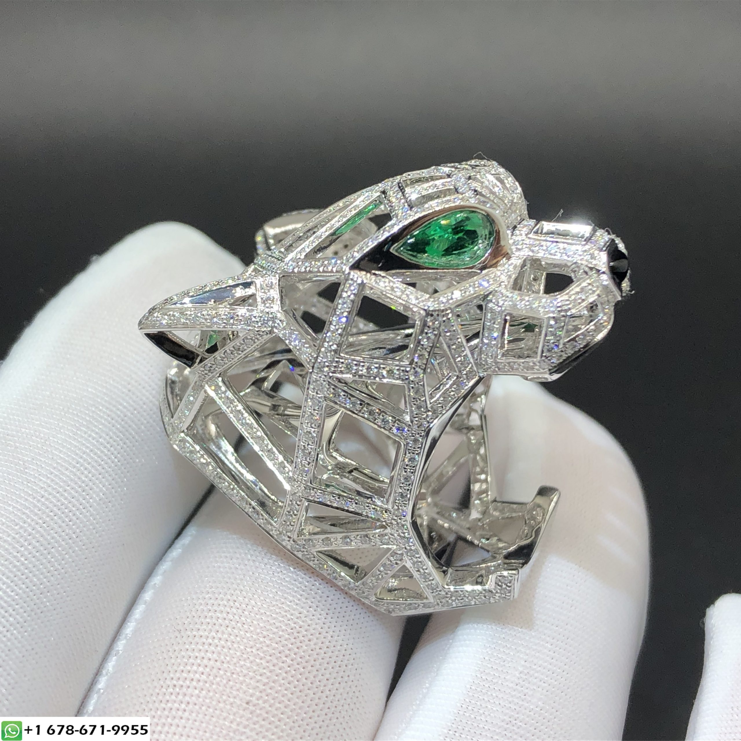 Panthère de Cartier ring custom fait en or blanc 18 carats, poids d'or 24,5 ~ 27,5 grammes,Fixé avec 545 diamants taille brillant totalisant 1.63 carats, émeraudes et onyx Largeur du motif selon les métriques: 26.94 à 31.16 mm.Nous offrons 1:1 qualité supérieure bijoux de luxe sur mesure fait en or massif 18 carats,platine,pierres précieuses et diamants GIA au prix de vente direct d'usine.Tous les articles sont livrés avec le numéro de série d'origine, l'élément le plus important qu'une autre usine de bijoux ne peut pas offrir.Et nous offrons la livraison gratuite dans le monde entier.N'hésitez pas à nous contacter par e-mail:copyjwlove@gmail.com et whatsapp:+852 5647 8615.Merci beaucoup!