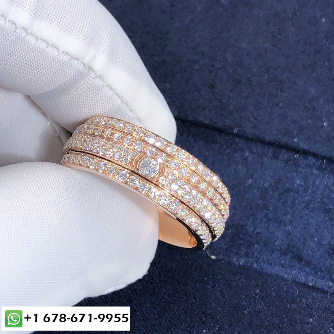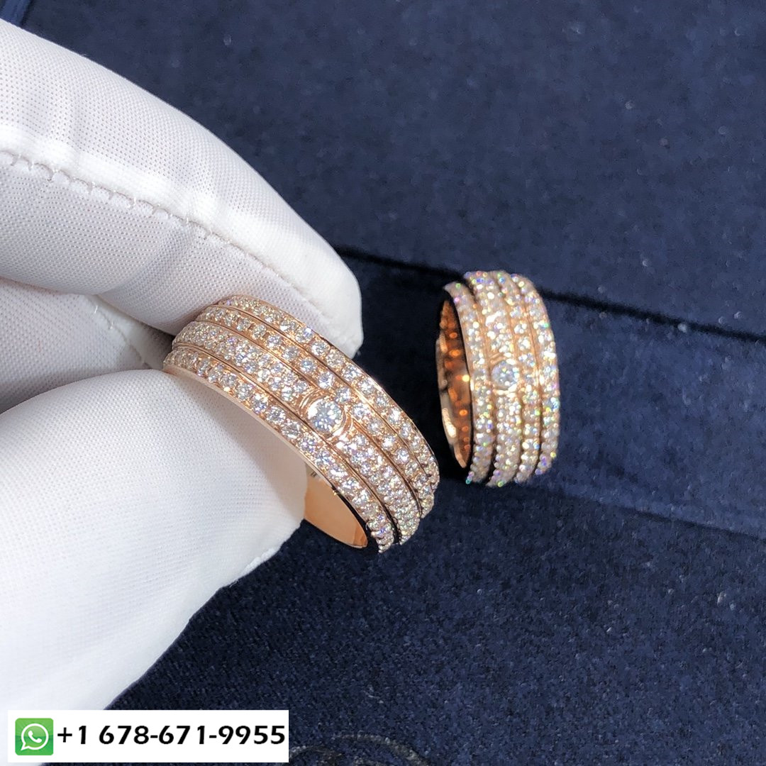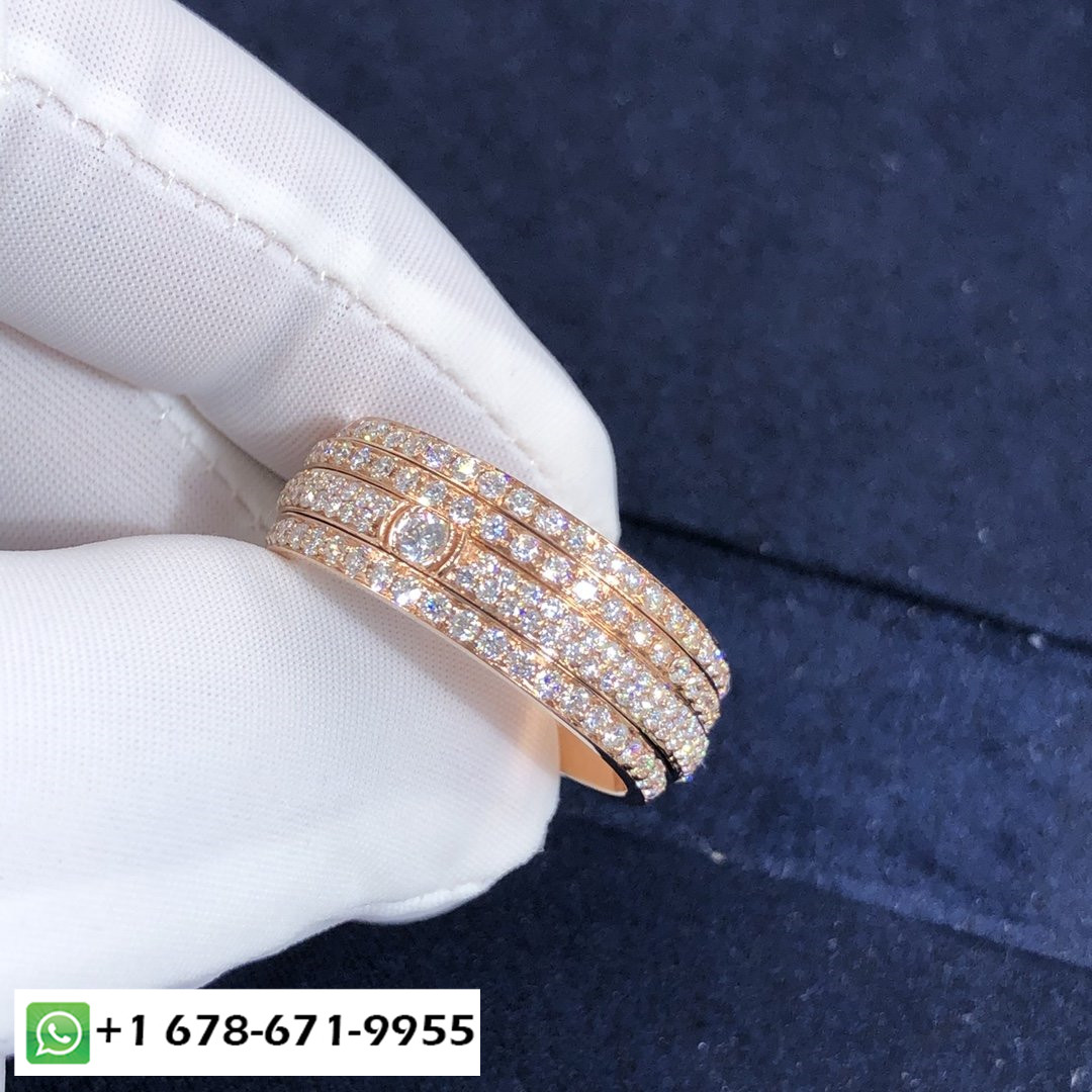 Bague de possession Piaget sur mesure en or rose 18 carats serti de 234 diamants taille brillant d'une largeur totale de 2,2 ct.: 8.5 mm.Poids d'or basé sur la taille 7 est 13.3 g. Tailles disponibles (métrique):5 ½ – 7 ½.Si parfait pour les alliances.Dans un design audacieux et contemporain, des bandes asymétriques d'or rose généreusement serties de pavés de diamants tournent côte à côte. Alors que l'intensité fulgurante des diamants donne à la bague Piaget Possession son aspect précieux, le mouvement de rotation est en soi une expérience sensorielle unique. Chaque tour donne à la femme qui le porte le sentiment irrésistible qu'elle maîtrise son propre destin, suivre sans crainte ses ambitions avec plaisir et joie.