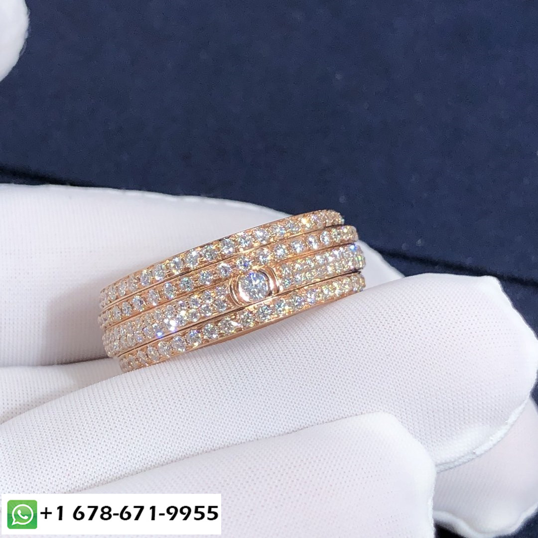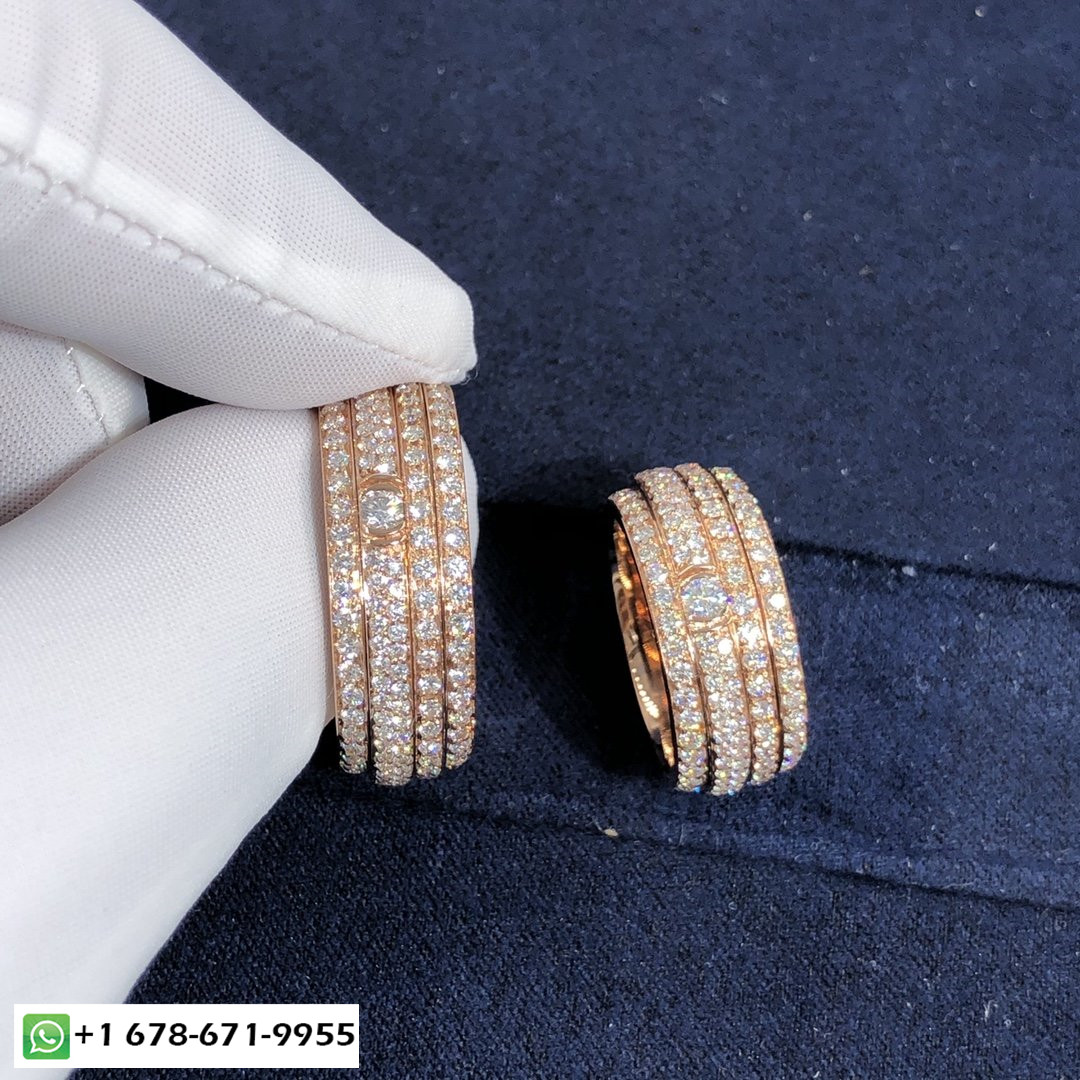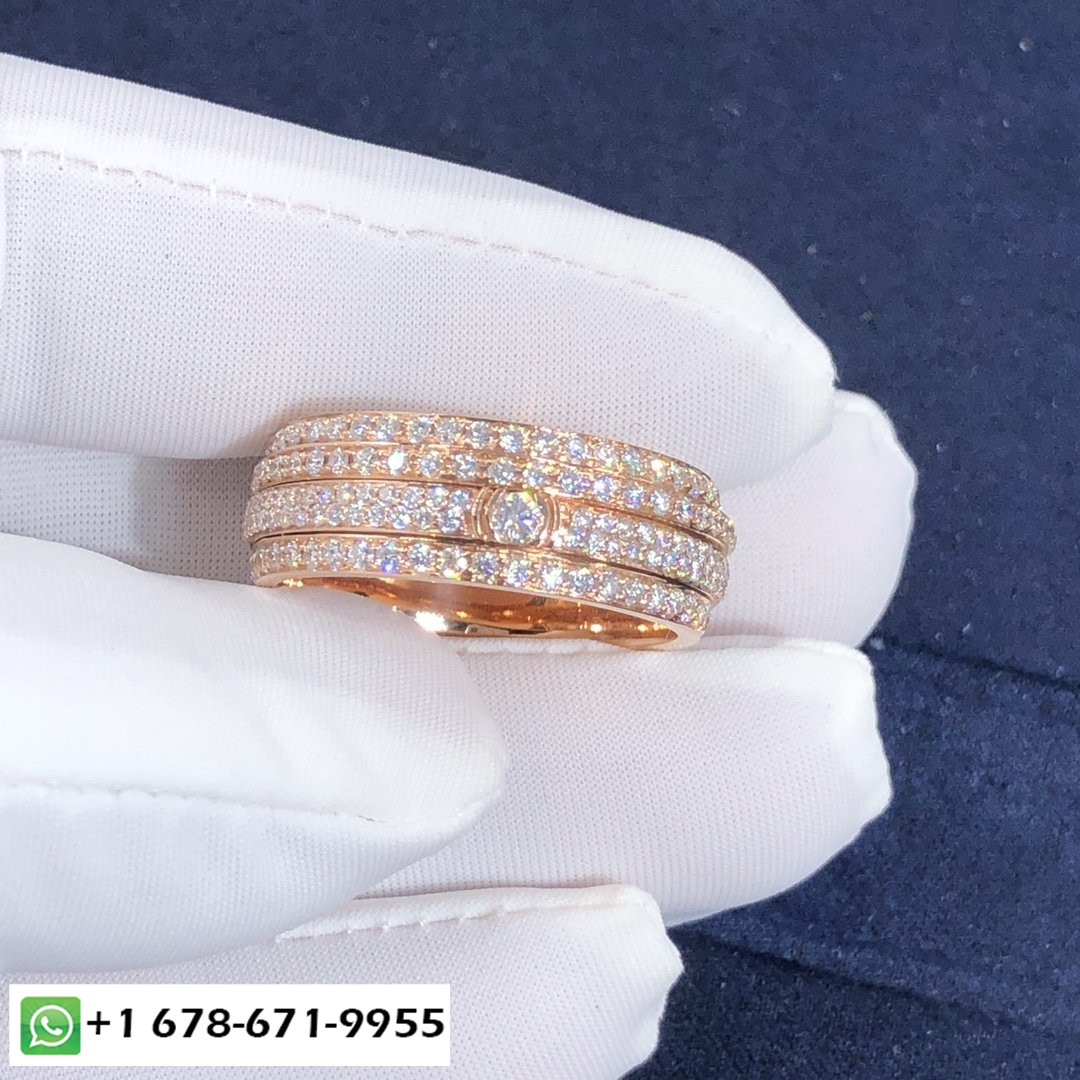 Bague de possession Piaget sur mesure en or rose 18 carats serti de 234 diamants taille brillant d'une largeur totale de 2,2 ct.: 8.5 mm.Poids d'or basé sur la taille 7 est 13.3 g. Tailles disponibles (métrique):5 ½ – 7 ½.Si parfait pour les alliances.Dans un design audacieux et contemporain, des bandes asymétriques d'or rose généreusement serties de pavés de diamants tournent côte à côte. Alors que l'intensité fulgurante des diamants donne à la bague Piaget Possession son aspect précieux, le mouvement de rotation est en soi une expérience sensorielle unique. Chaque tour donne à la femme qui le porte le sentiment irrésistible qu'elle maîtrise son propre destin, suivre sans crainte ses ambitions avec plaisir et joie.