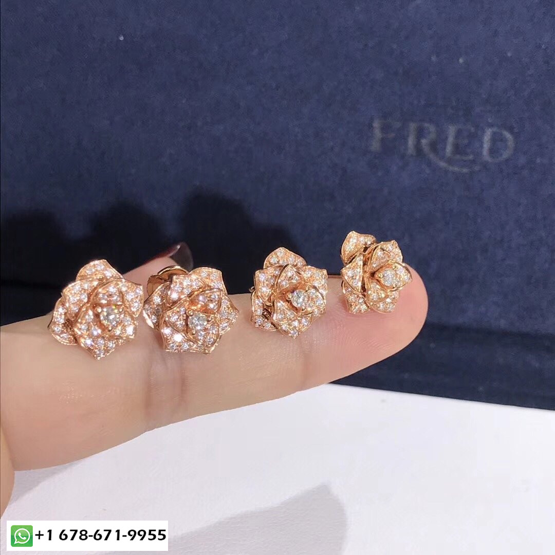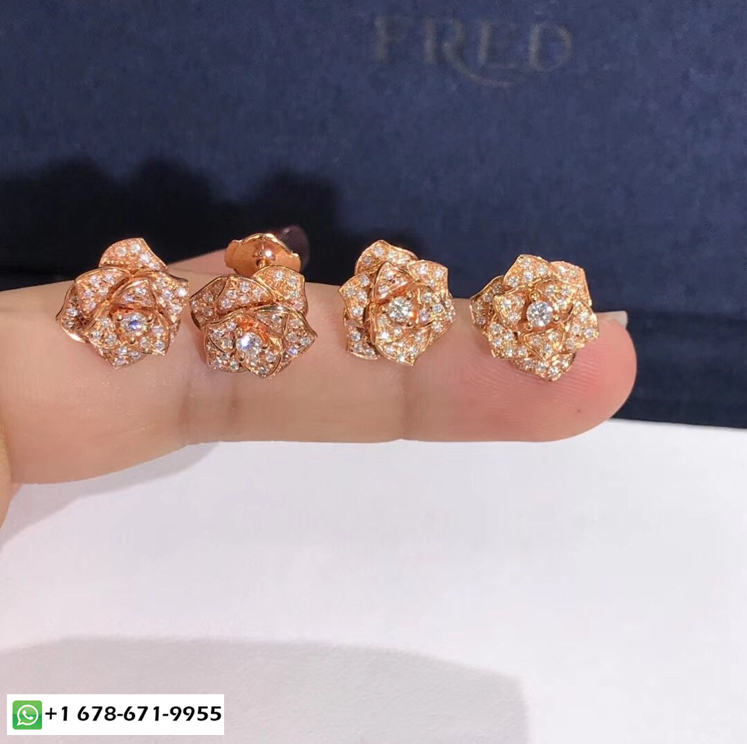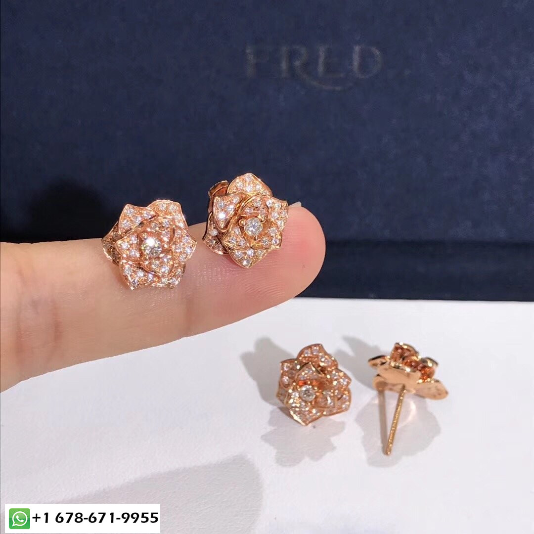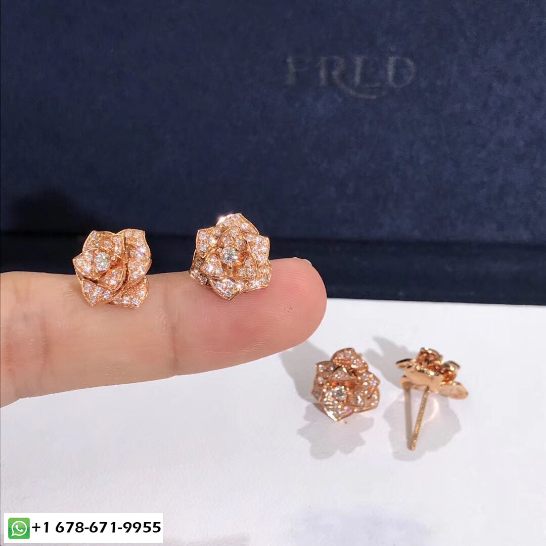 Boucles d'oreilles Piaget Rose sur mesure en or rose 18 carats serti de 78 diamants taille brillant totalisant 0,92 ct poids d'or:5 g. largeur:12 mm.Longueur:12 mm.Motif taille longueur:12 mm.Motif taille largeur:12 mm Ces boucles d'oreilles romantiques évoquent poétiquement une tendre promesse d'amour. Chaque bouton de rose stylisé, inspiré de la rose Yves Piaget, déploie délicatement ses pétales d'or rose, entièrement serti de diamants, créer l'illusion d'une vraie fleur. Il semble venir frais du jardin, pour que les diamants brillent comme baignés de rosée.