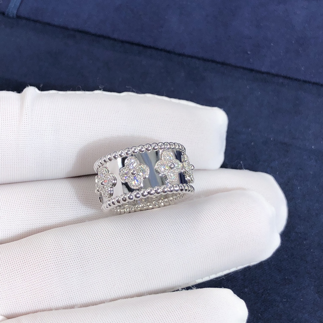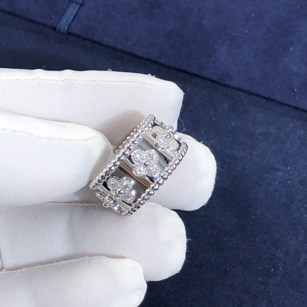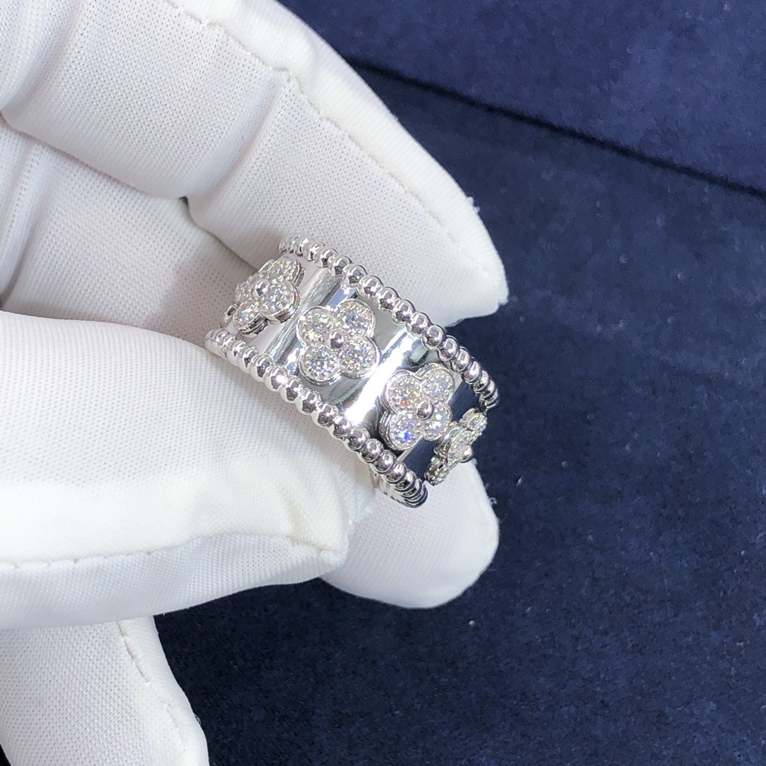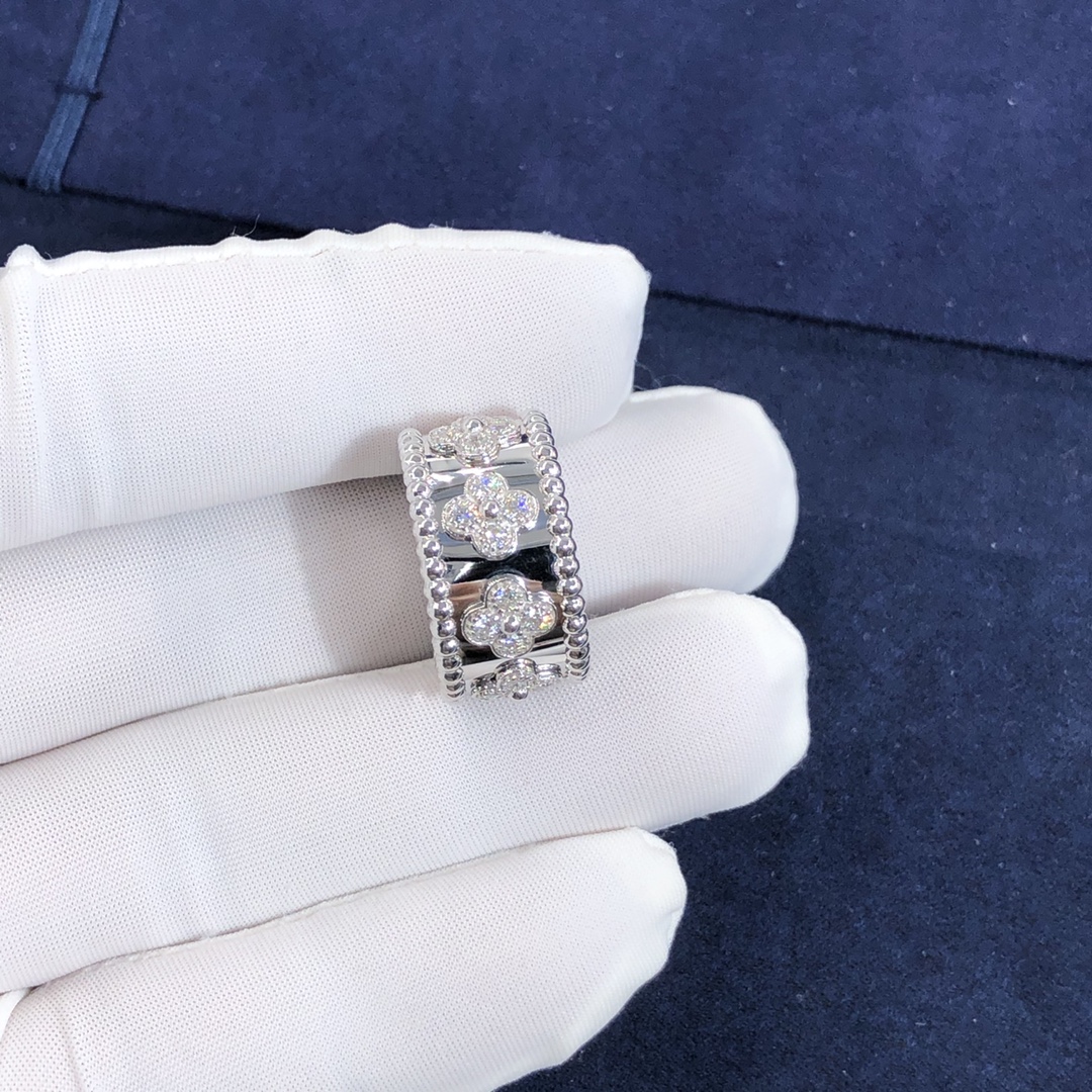 De cleef & bague arpels perlée trèfles sur mesure fait en or blanc 18 carats serti de 28 diamants totalisant 0.63 ct,Cette bague VCA est également disponible en or rose 18 carats et en or jaune 18 carats sur demande.™ la collection de trèfles est ornée de précieux motifs de trèfle – Van Cleef & Arpels’ symbole de chance. Ils sont ornés d'une perle dorée en leur centre.