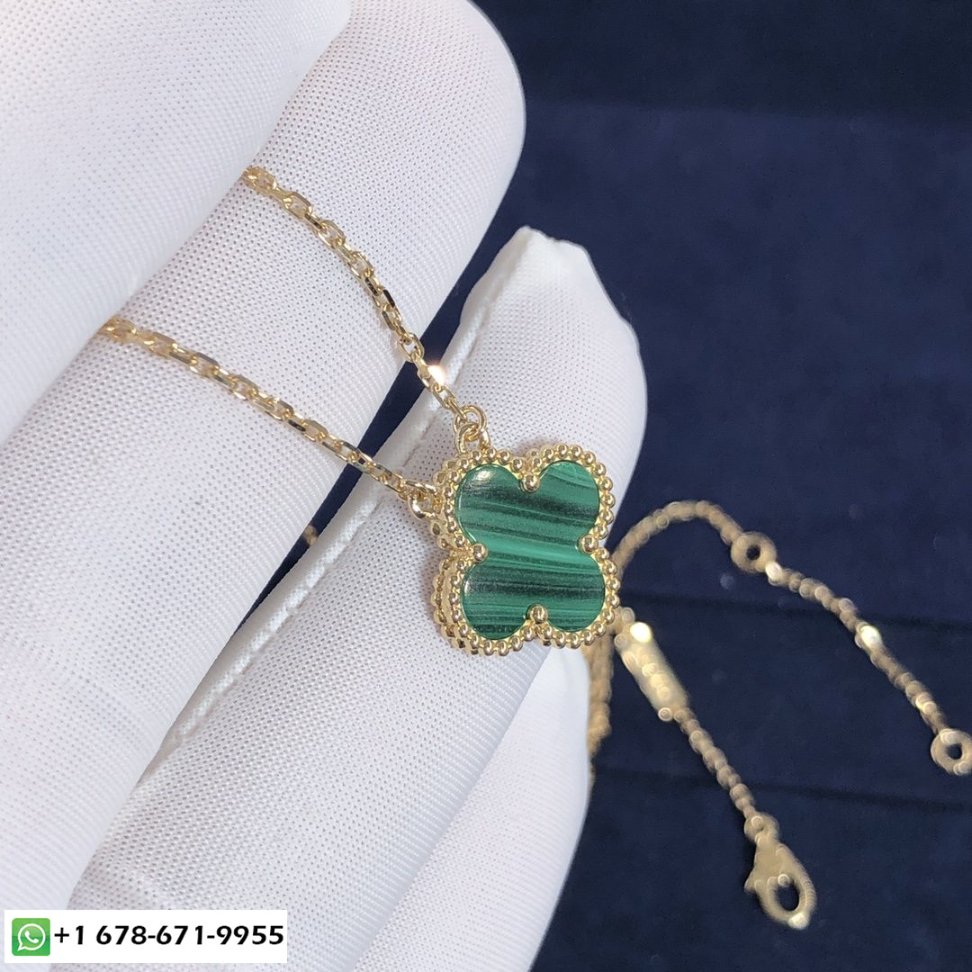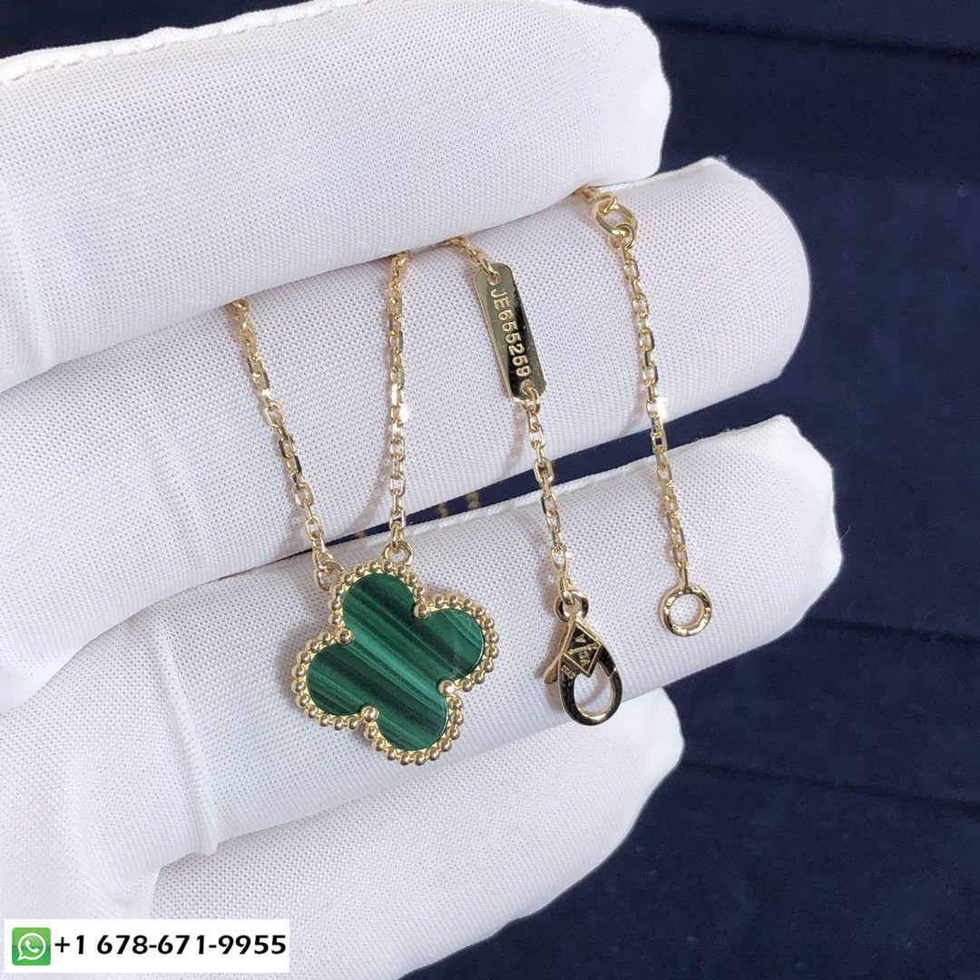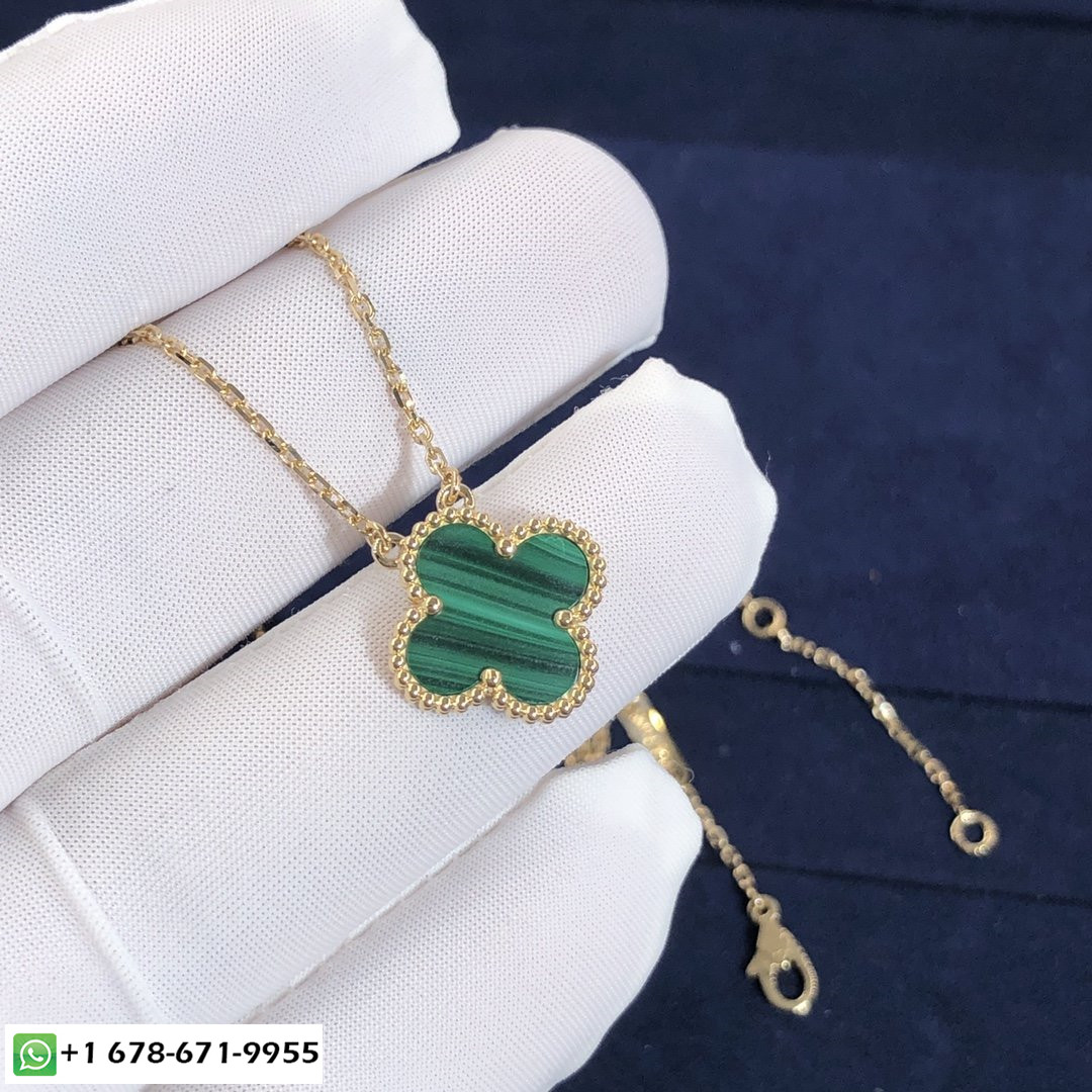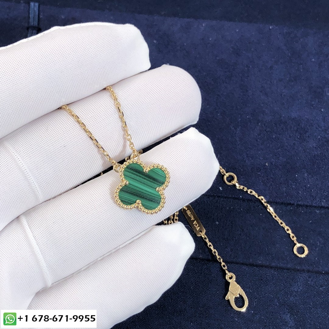 Van Cleef & Arpels Vintage Alhambra pendentif sur mesure en or jaune 18 carats serti de malachite. Ce pendentif vintage VCA Alhambra est également disponible en or rose 18 carats et or blanc 18 carats sur demande.:42 cm.
